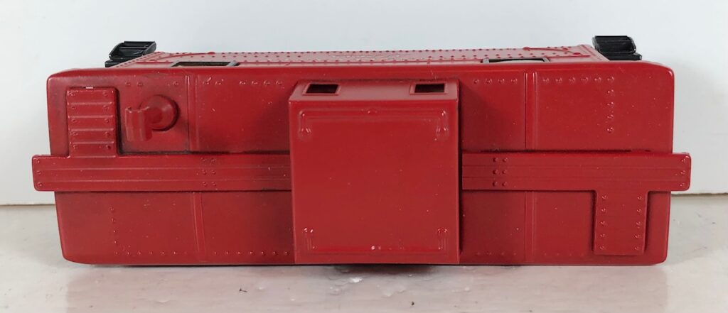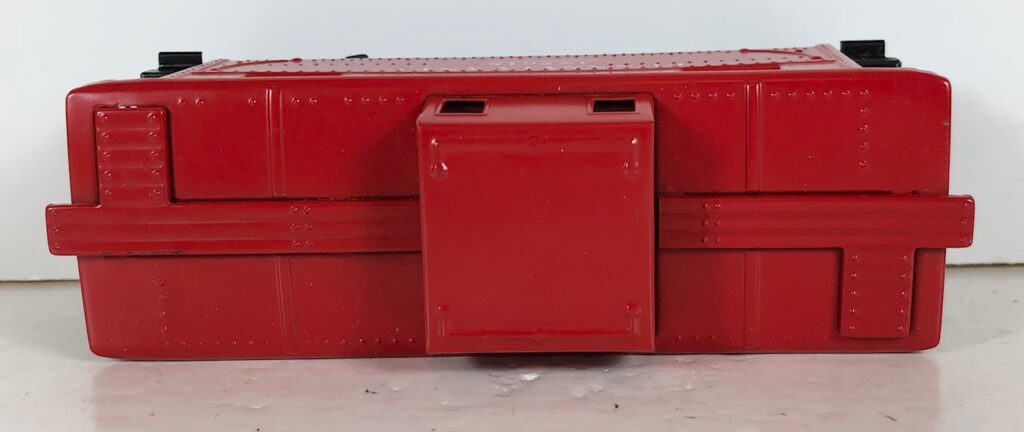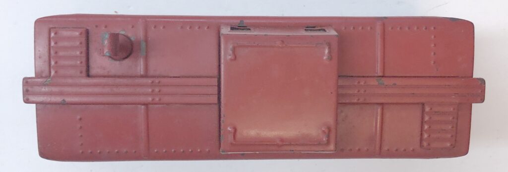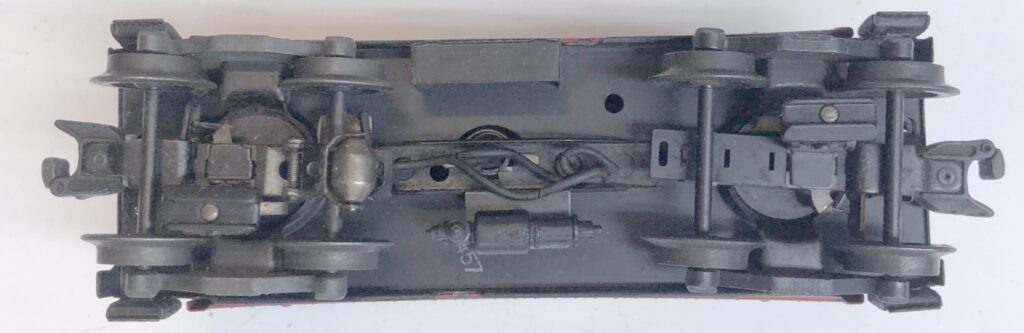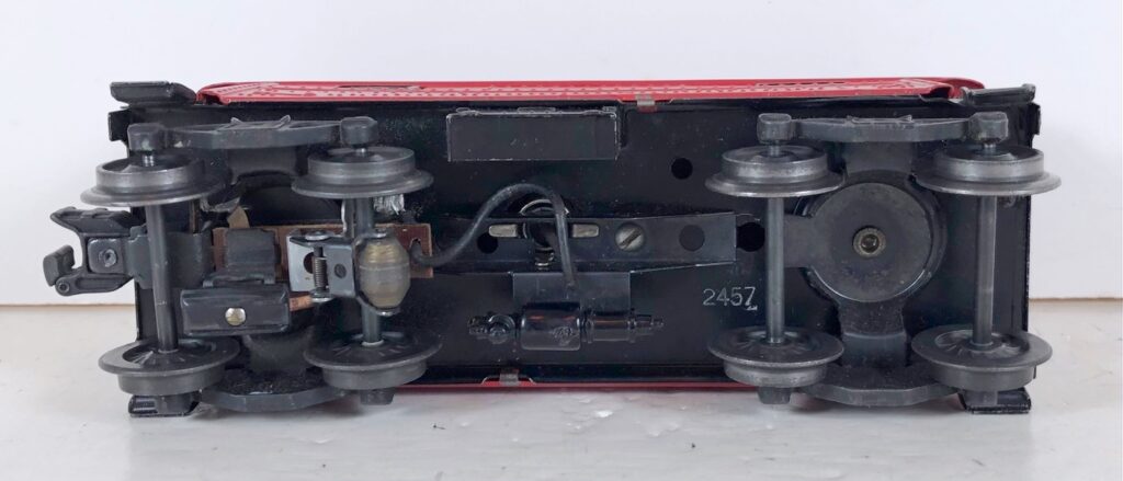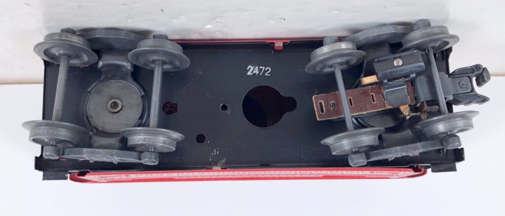 A photo of the underside is needed to show whether the tabs are broken, twisted, or untouched. Broken or twisted tabs (along with late trucks) indicate that the car is unlikely to be original. Although it doesn’t show very well, this car has whirley wheels.
