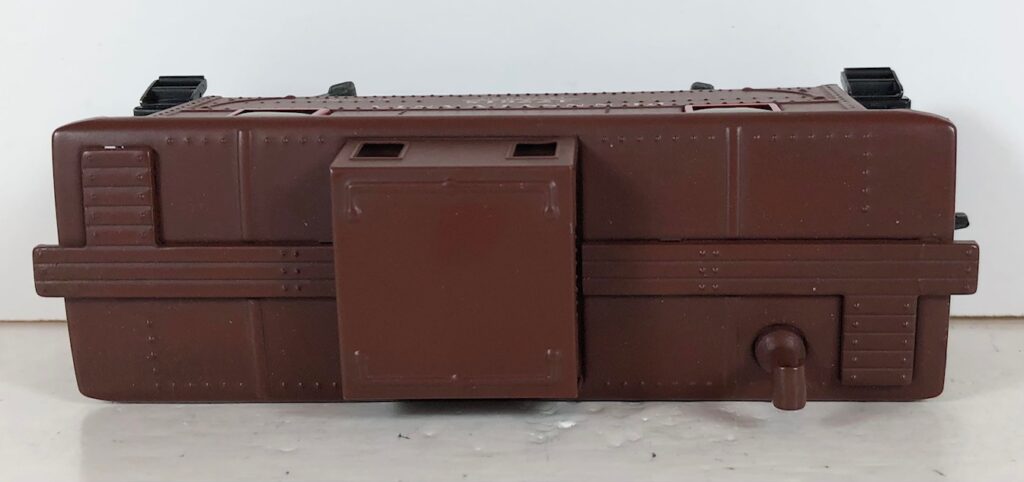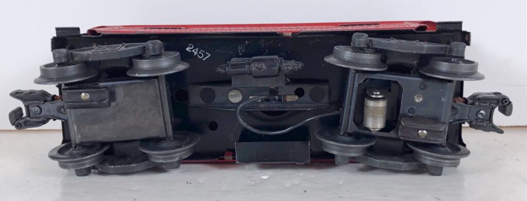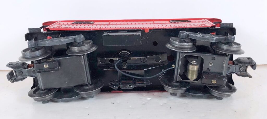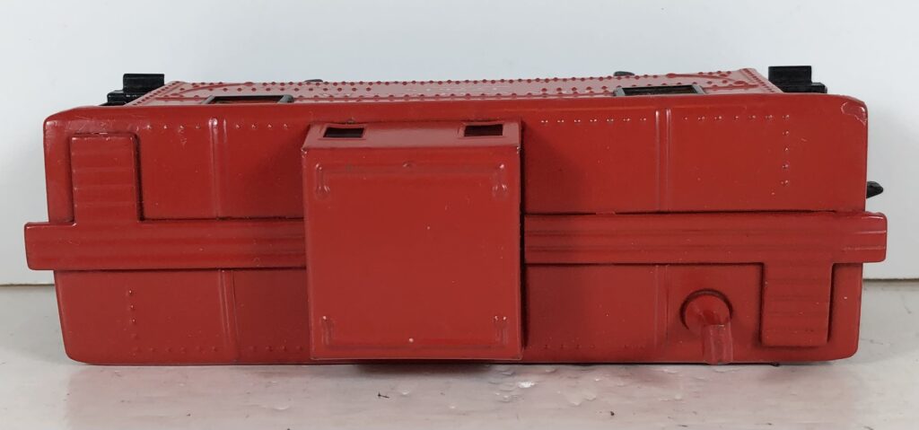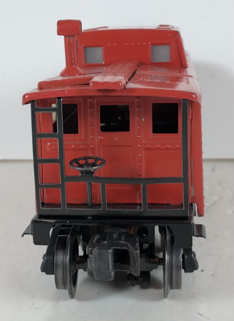 These metal body cabooses are all prewar carryovers. Lionel was apparently not ready to introduce the plastic body SP style caboose at the end of the war. These cabooses, particularly those from 1945-46, are found with various earliest truck and coupler combinations. See the section on early postwar TRUCKS & COUPLERS HERE for complete details. Also, many prewar cabooses were likely converted to coil or magnetic couplers over the years.