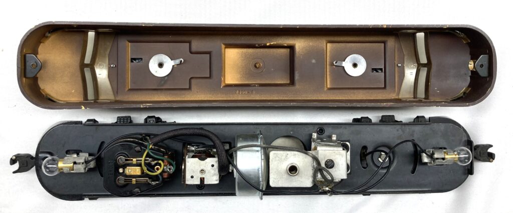 yellow shell painted brown with gold rubber stamped stripe and lettering and gold painted heat dispenser on roof