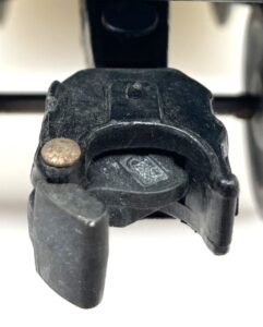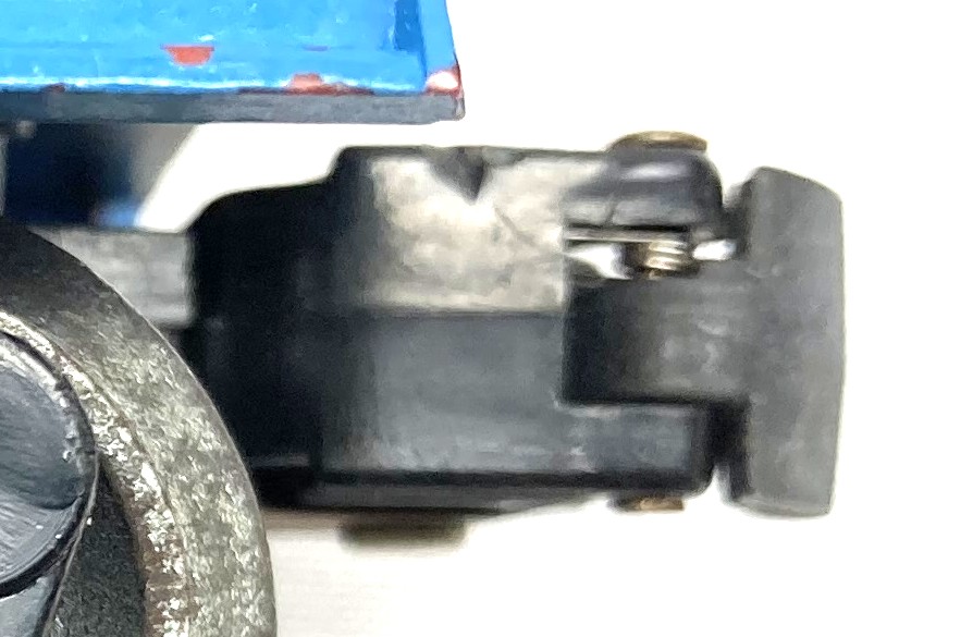 Die cast Bar end trucks with magnetic couplers, the rivet in the center of the actuating plate is flared facing up, plain web on knuckle, black pin