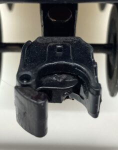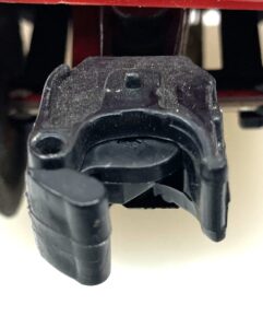 Die cast Bar end trucks with magnetic couplers, the rivet in the center of the actuating plate is flared facing up, engraved web on knuckle, black pin