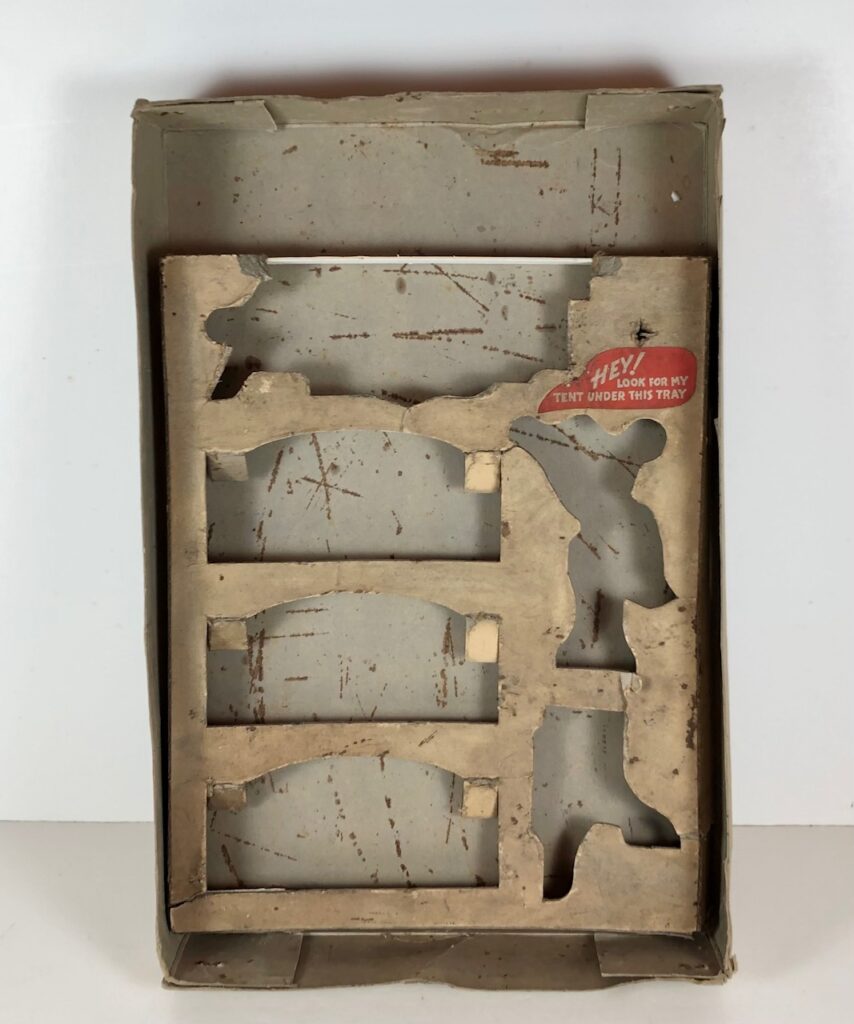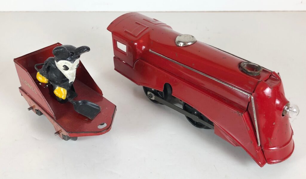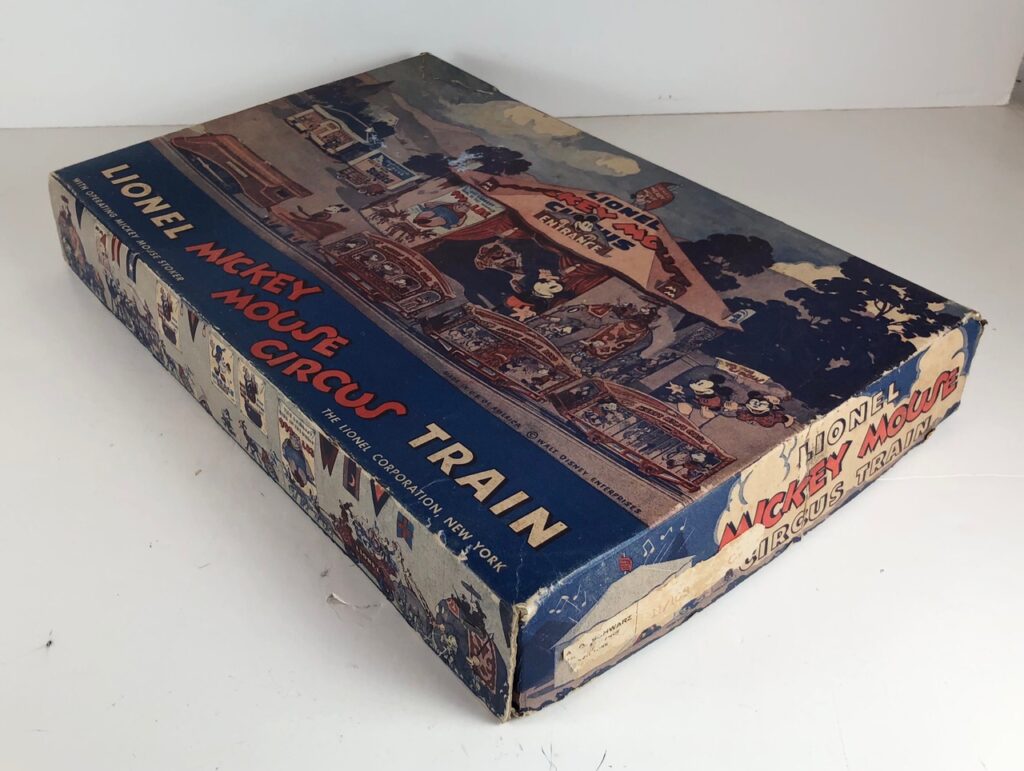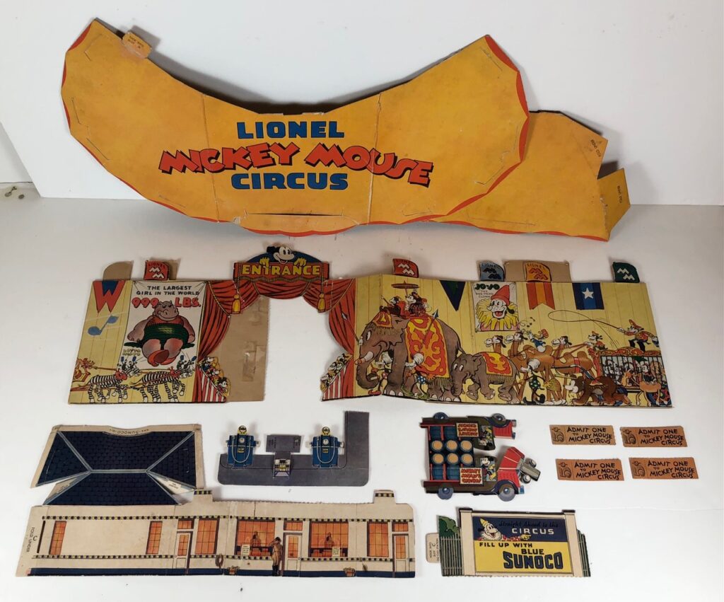 In addition to the Mickey Mouse train, the set included a composition Mickey Mouse barker figure that stood 5-inches tall and a cardboard circus tent, Sunoco gas station, truck, billboard, and tickets. Also included in the set were two sections of straight and eight sections of curve 2-Rail “027” track.