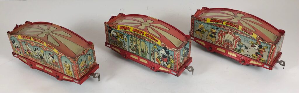 The No. 1508 Steam Locomotive is powered by a mechanical or clockwork motor operated by a wind-up key. The engine had a bell that operated continuously and a battery operated headlight. The motor has a lever that serves as a brake when engaged located inside the cab. The steam engine is painted bright red. The tender and cars were made of tin and were colorfully decorated with lithography depicting many of the Disney characters. The Mickey Mouse stoker in the tender had a rod connected to the underside of the figure that caused the figure to “shovel” when it hit the ties in the track. The three 4-wheel Circus Cars share a common frame. The frames and roofs of the cars and the tender is lithographed in red and gold. The tender and cars have tongue and slot couplers.