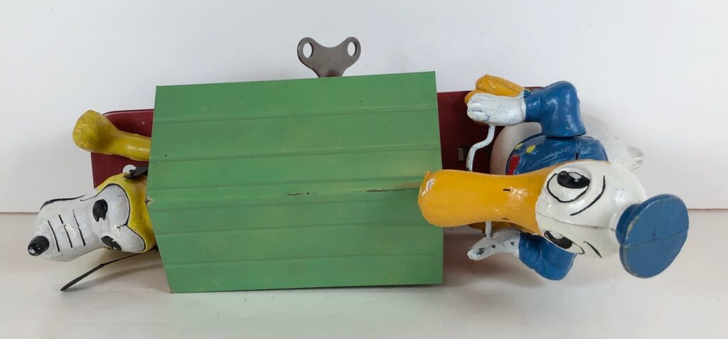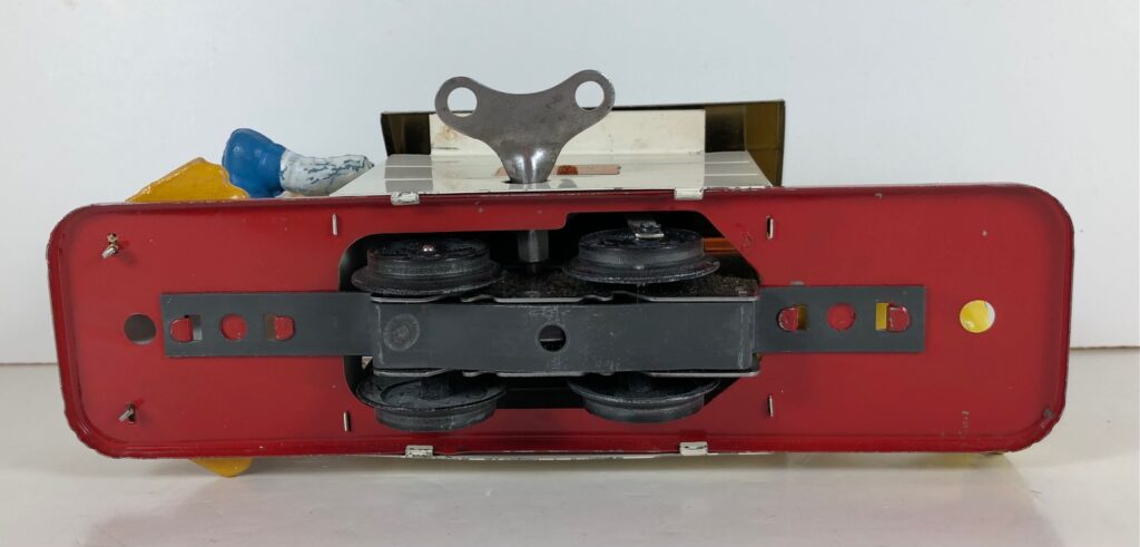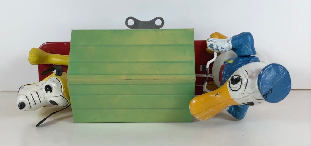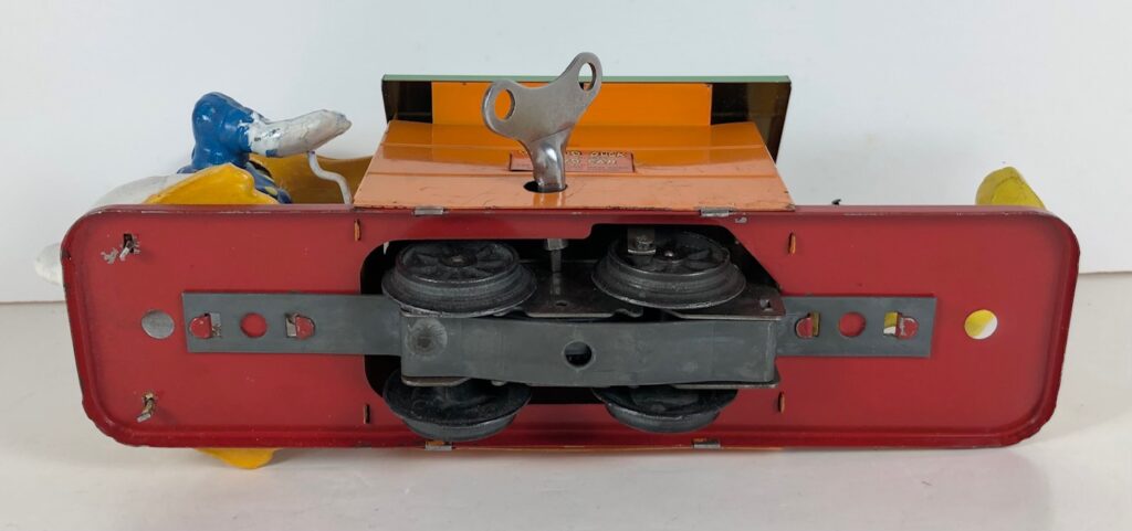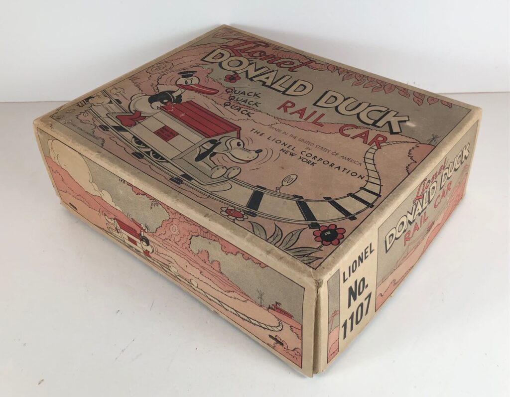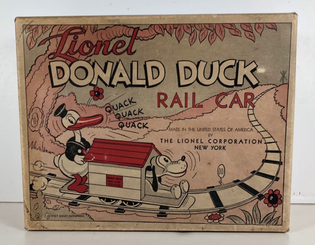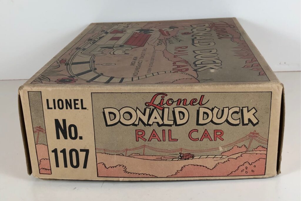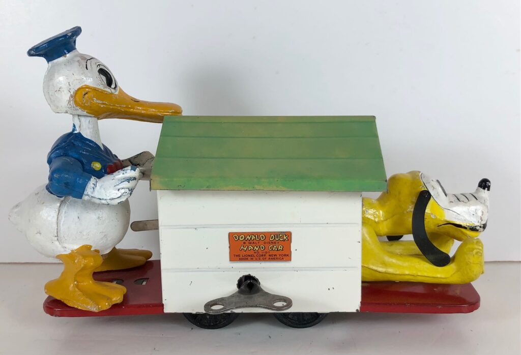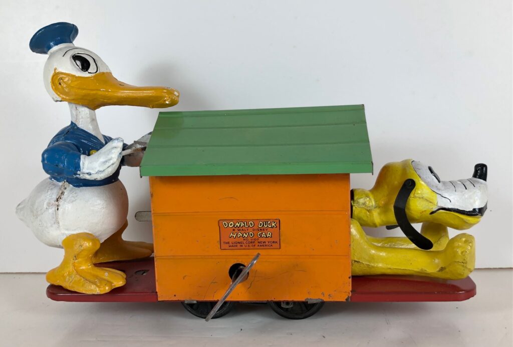 The Lionel No. 1107 Donald Duck Handcar (referred to by Lionel as the Donald Duck Rail Car) was introduced in 1936 and was cataloged through 1937. The Donald Duck Handcar features Donald Duck and Pluto figures and Pluto’s Dog House. The handcars are powered by a mechanical or clockwork motor operated by a wind-up key. The handcars are constructed with a stamped steel frame and dog house painted various colors. The composition Donald Duck and Pluto figures are mounted on the frame. The motor is connected to the handcar handle with an eccentric rod that activates the Donald Duck figure. In addition, when in motion, Pluto’s head bobs and Donald Duck “quacks”. The motor has a lever that serves as a brake when engaged. The handcars have an identifying decal on one side of the dog house. The handcar measures 11-inches in overall length. The handcars were always offered for separate sale with a circle of “027” 2-Rail track.