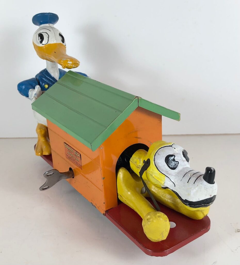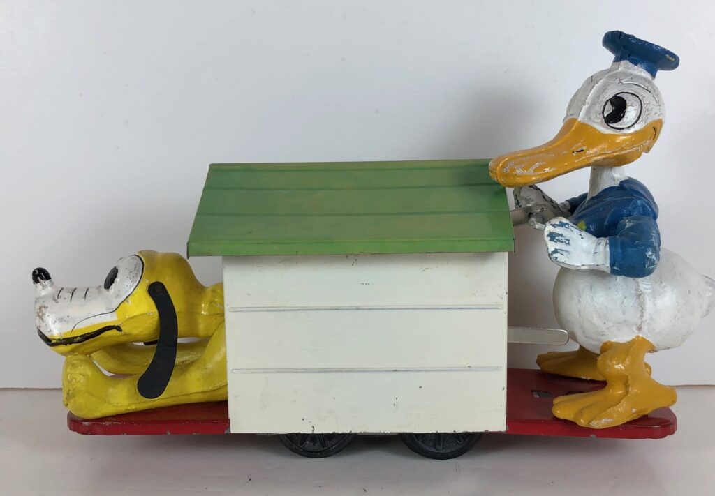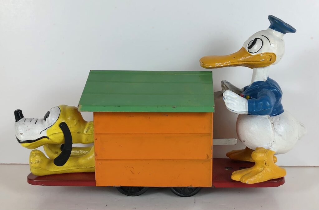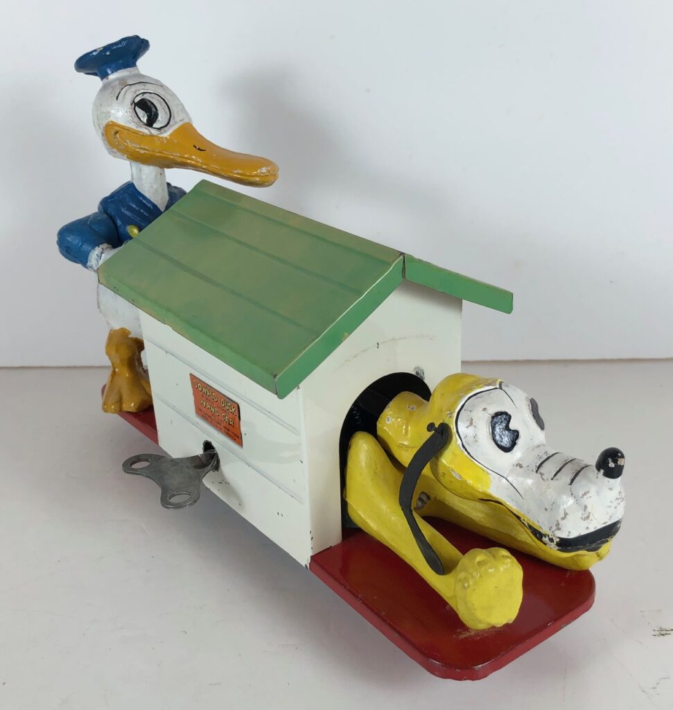 Variations of the No. 1107 Donald Duck Handcars are limited to the color of the dog house and roof. The handcars were offered with white or orange dog houses and green or red roofs. There are no variations to the Donald Duck or Pluto figures.
