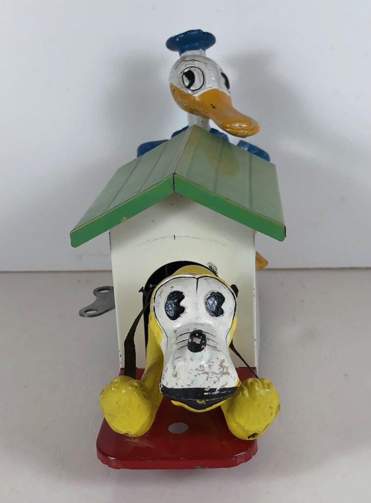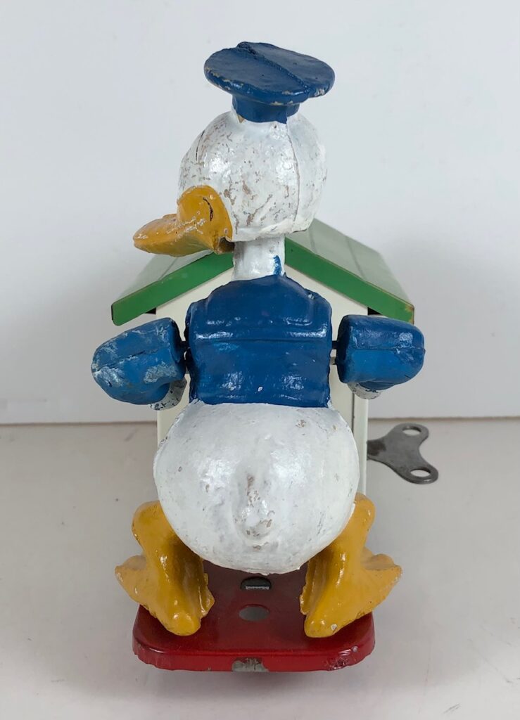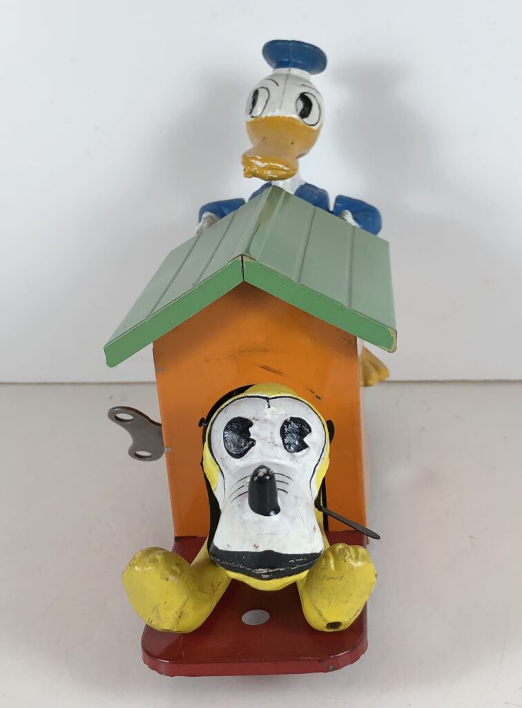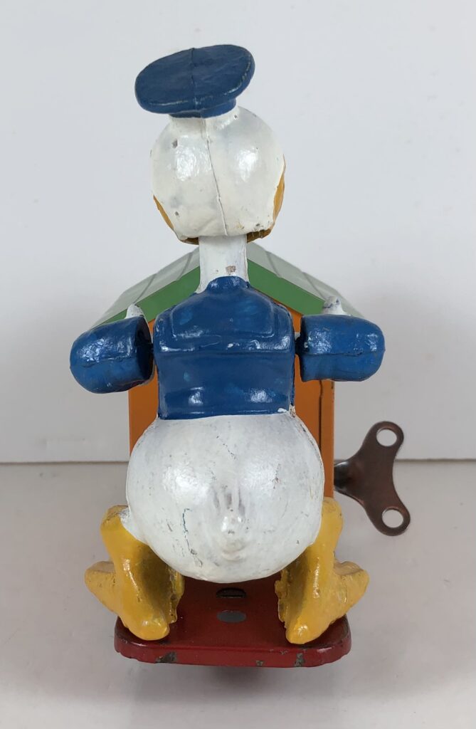 Variations of the No. 1107 Donald Duck Handcars are limited to the color of the dog house and roof. The handcars were offered with white or orange dog houses and green or red roofs. There are no variations to the Donald Duck or Pluto figures.