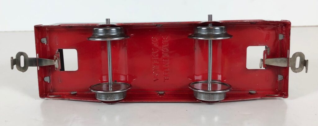 The Lionel / Ives No. 1512 Gondola Cars were introduced in 1931 and were issued through 1937. The No. 1512 Gondola Cars have a four-wheel frame and measure 6-inches in length. The gondola car bodies were lithographed in blue or green with a black or red frame. All of the gondolas were manufactured by Lionel. Gondola cars offered in 1931-1932 were included in Ives Mechanical Sets. Gondola Cars offered in 1933 were included in Lionel-Ives Mechanical Sets. Gondola cars offered in 1936-1937 were included in Lionel Mechanical Sets. The gondola cars all have hook and slot couplers.