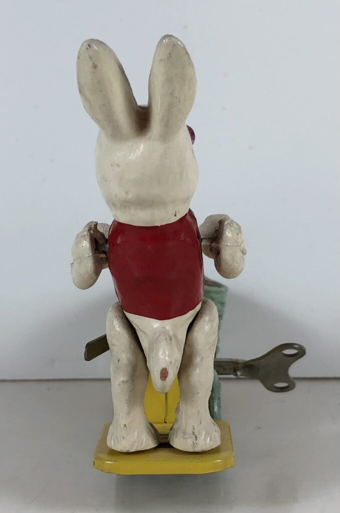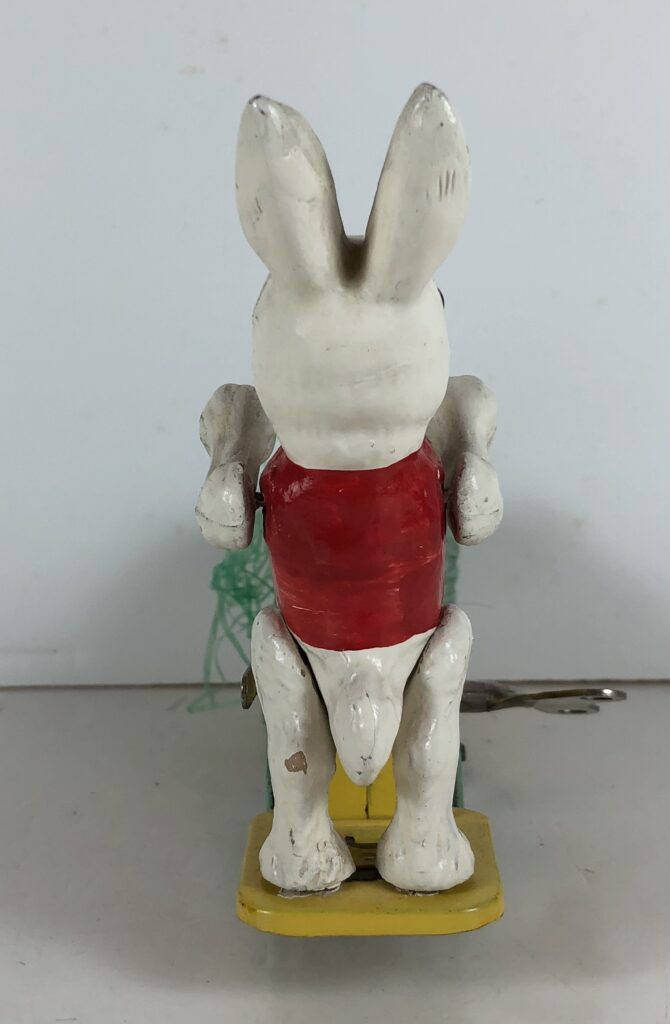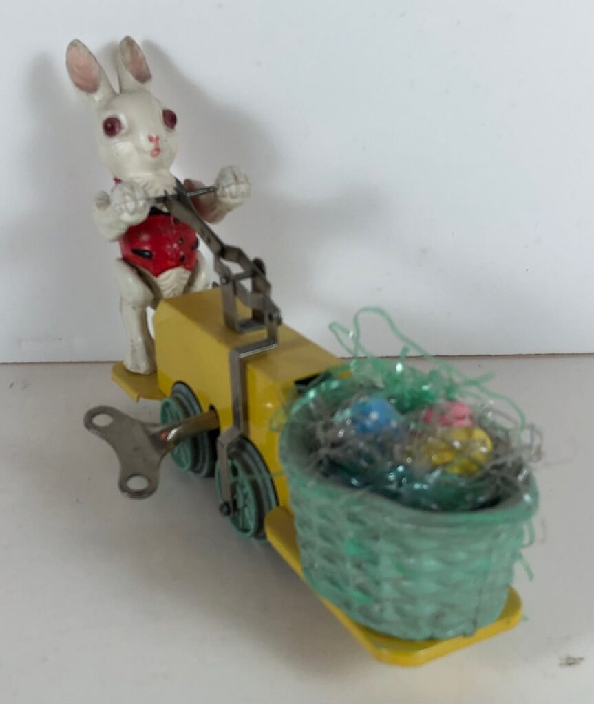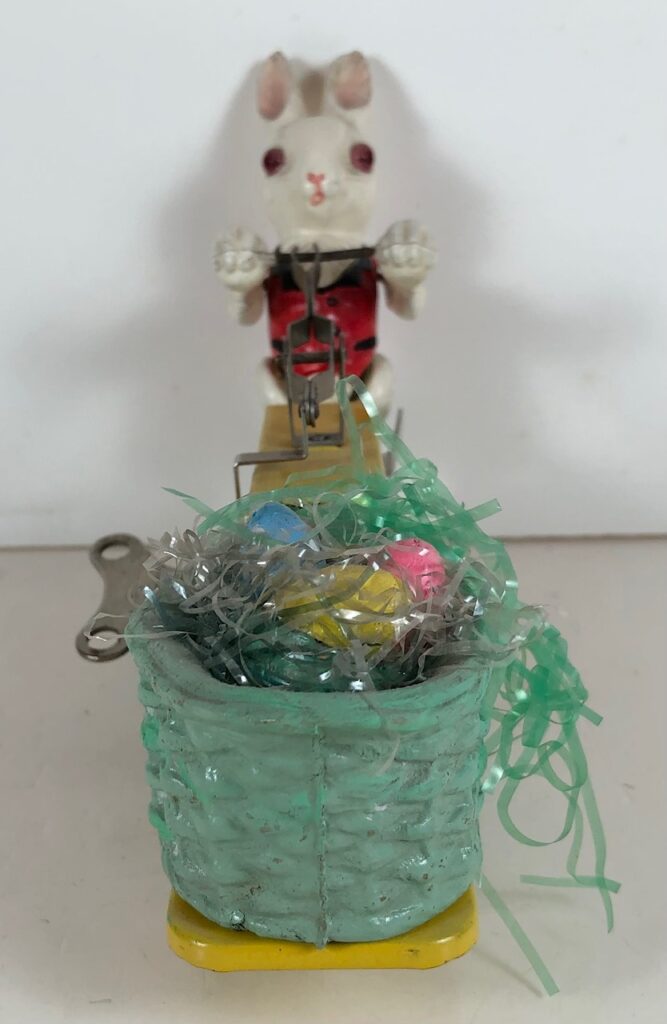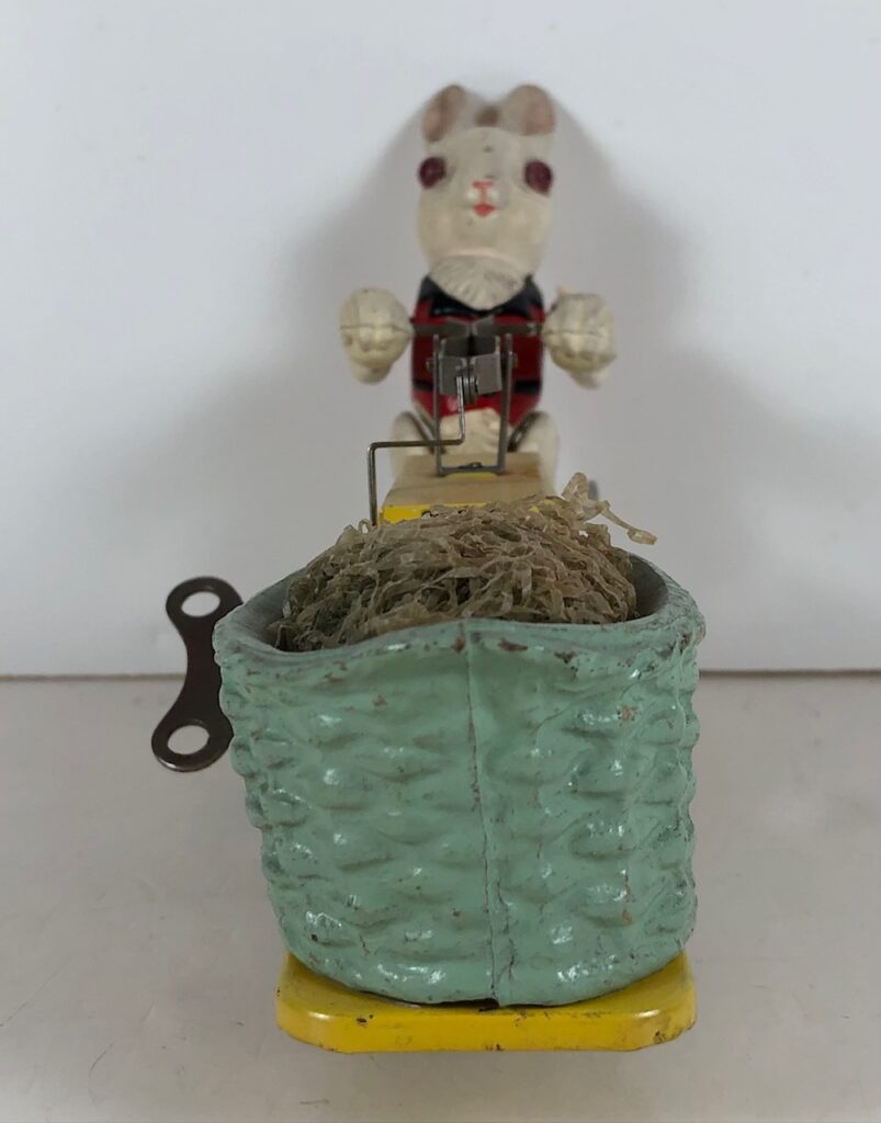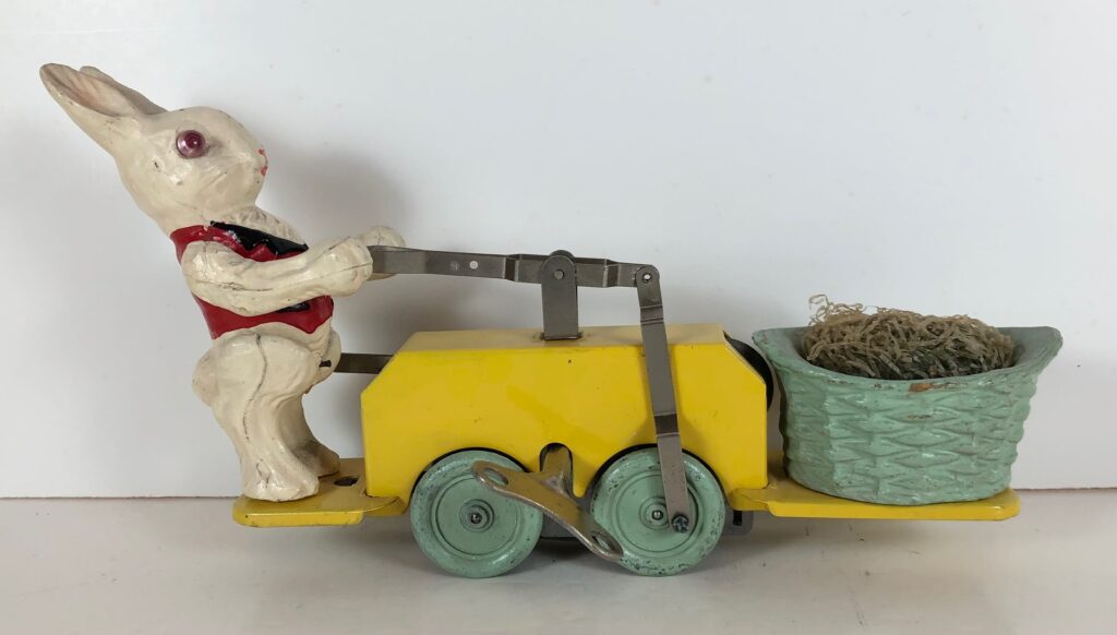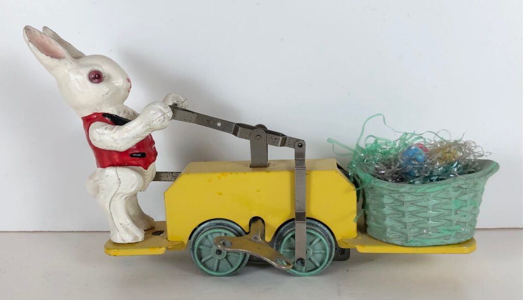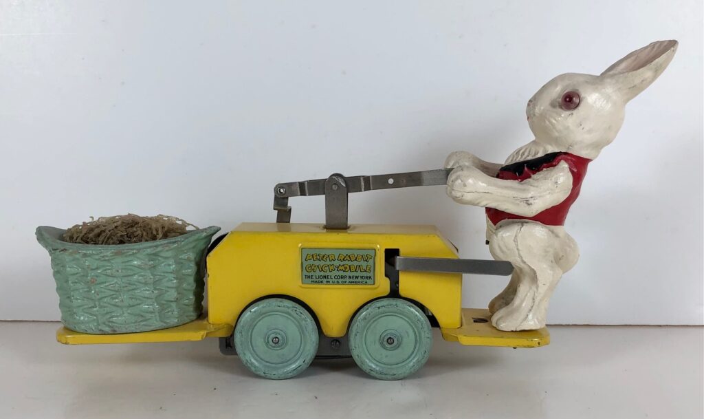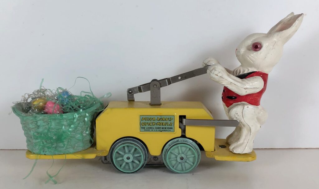 The Lionel No. 1103 Peter Rabbit Chick-Mobile Handcar was introduced in 1936 and was offered through 1937 as an uncataloged item. The Peter Rabbit Chick-Mobile features a Peter Rabbit figure and an Easter basket that could be filled with candy. The handcars are powered by a mechanical or clockwork motor operated by a wind-up key. The handcars are constructed with a stamped steel frame and motor housing painted yellow. The composition Peter Rabbit figure and basket are mounted on the frame. The motor is connected to the handcar handle with an eccentric rod that activates the figure. The motor has a lever that serves as a brake when engaged. The handcars have an identifying decal on one side of the handcar body. The handcar measures 9-inches in overall length. The handcars were always offered for separate sale.