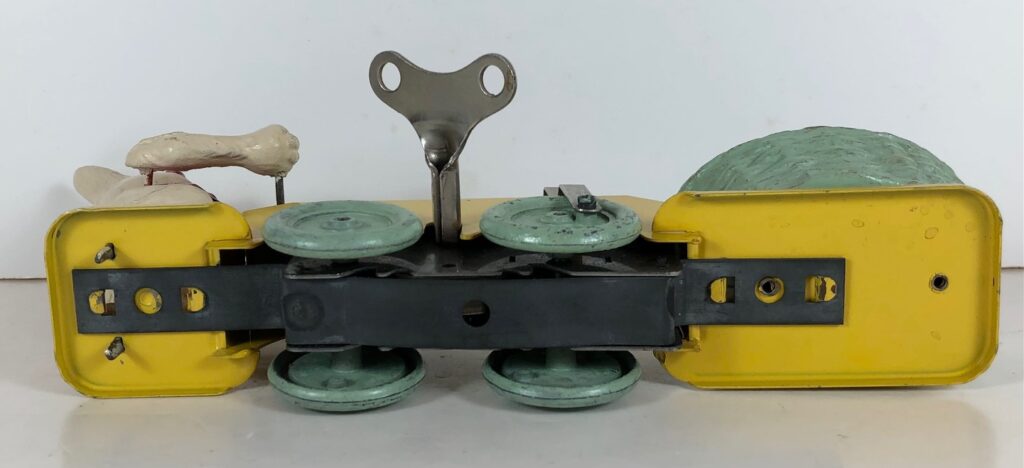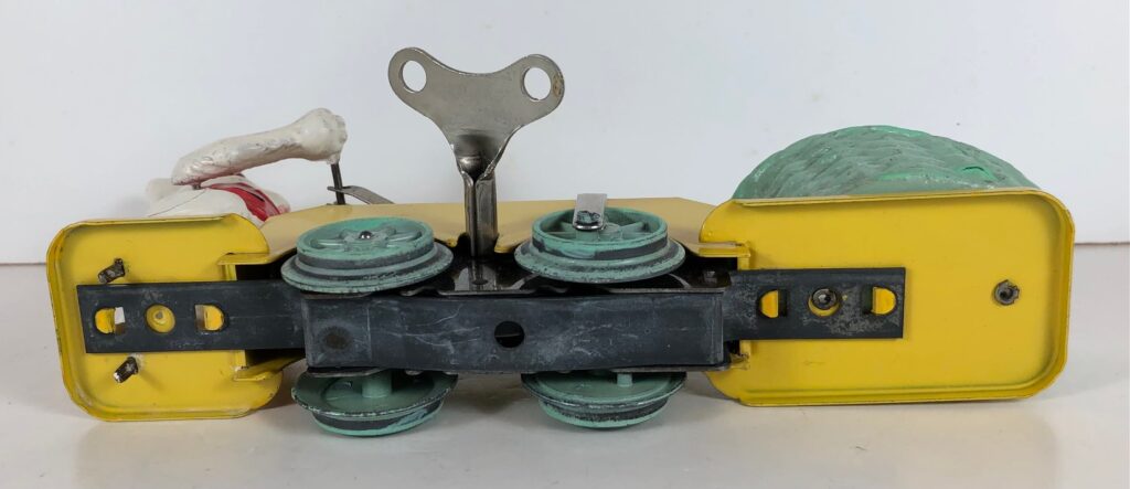 Lionel offered two versions of the Peter Rabbit Chick-Mobile. One version has flanged wheels for operation on “027” track. This version was offered with a circle of “027” 2-Rail track. The other version has non-flanged disc wheels. This version was offered as a floor toy with no track. Other than the drive wheels, there are no other variations to the Peter Rabbit Chick-Mobile.