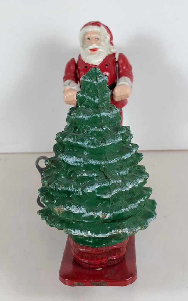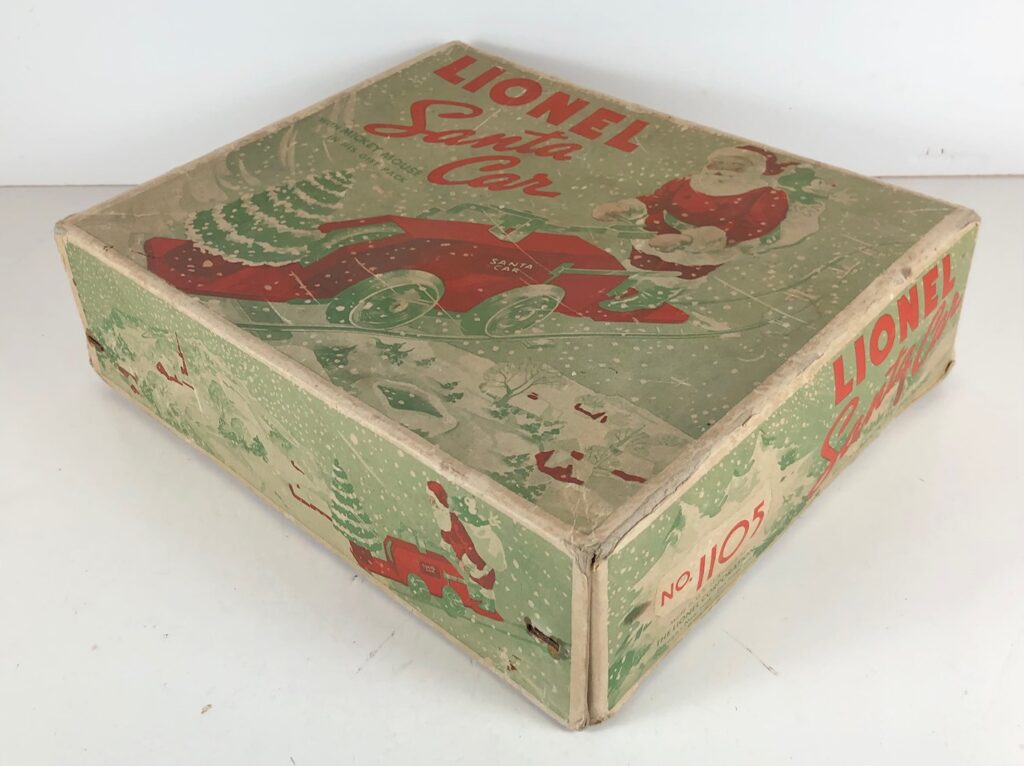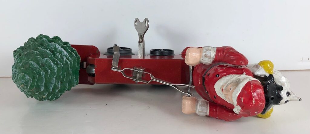 The Lionel No. 1105 Santa Claus Handcar (referred to by Lionel as the “Santa Car”) was introduced in 1935 and was cataloged through 1937. The Santa Claus Handcar features a Santa Claus figure with a Mickey Mouse figure riding in a sack on Santa’s back and a Christmas tree. The handcars are powered by a mechanical or clockwork motor operated by a wind-up key. The handcars are constructed with a stamped steel frame and motor housing painted red. The composition Santa Claus and Mickey Mouse figures and the Christmas tree are mounted on the frame. The motor is connected to the handcar handle with an eccentric rod that activated the two figures. The motor has a lever that serves as a brake when engaged. The handcar has an identifying decal on one side of the handcar body. The handcar measures 10 1/2-inches in overall length. The handcars were always offered for separate sale with a circle of “027” 2-Rail track.