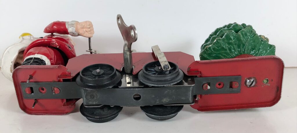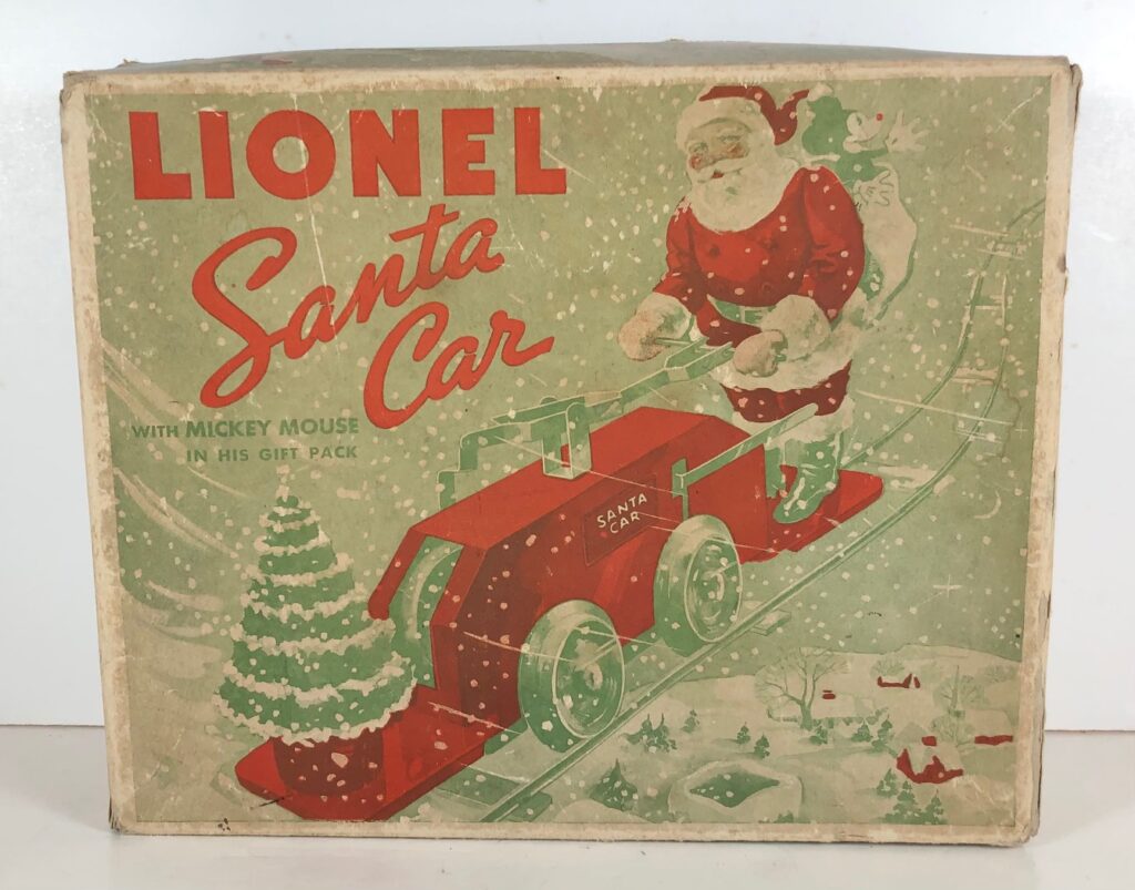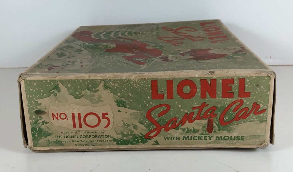 Lionel offered two versions of the Santa Claus Handcar. One version has a Mickey Mouse figure in Santa’s sack as described above. This is the most common version of the handcar and was offered for sale throughout the United States. The second version of the Santa Claus Handcar was very similar, but did have the Mickey Mouse figure in Santa’s sack. This version of the handcar was offered exclusively for sale in Canada since Lionel did not have the rights from the Disney Company to sell Mickey Mouse outside the U.S. This version of the Santa Claus Handcar is very scarce and seldom seen. The second version of the Santa Claus Handcar was cataloged as No. 1106.
