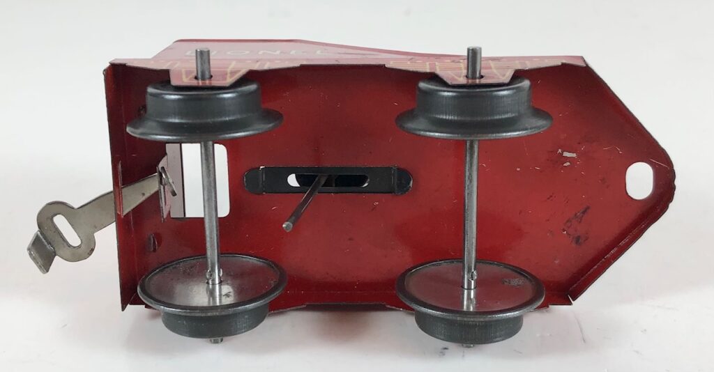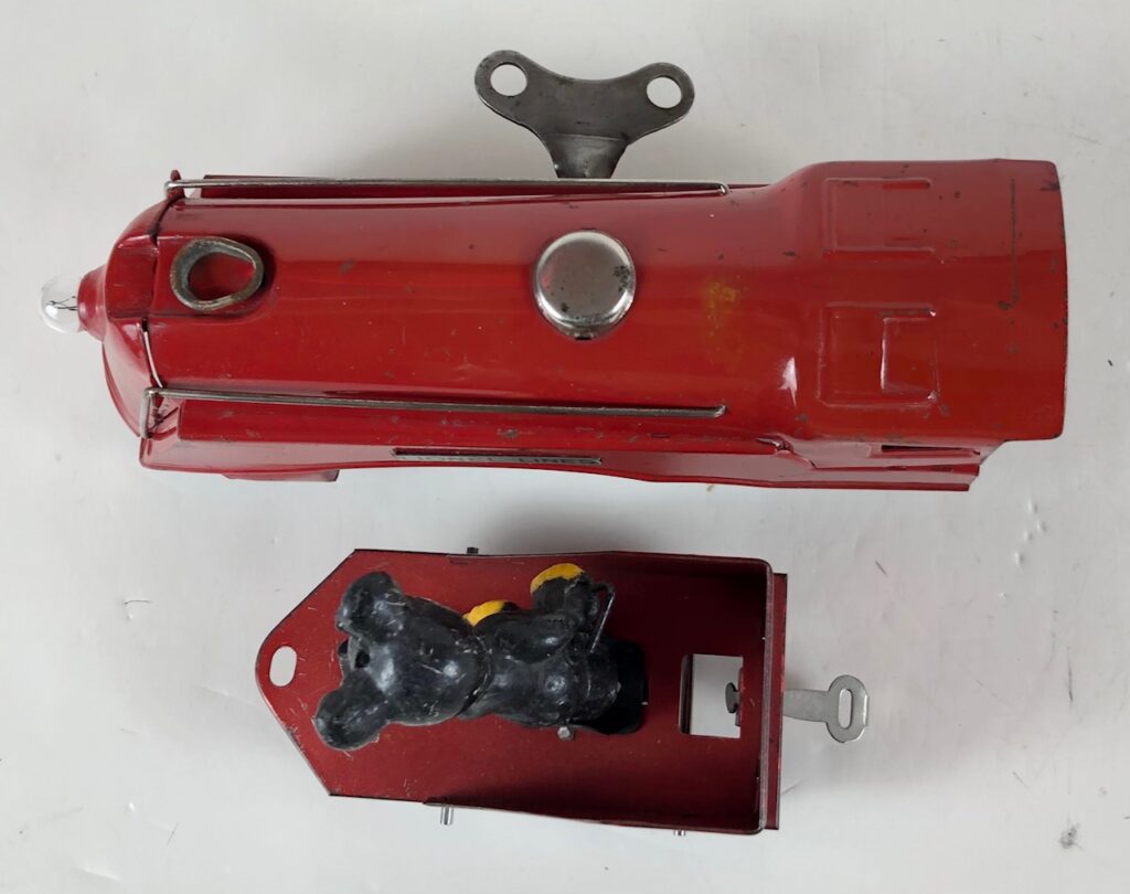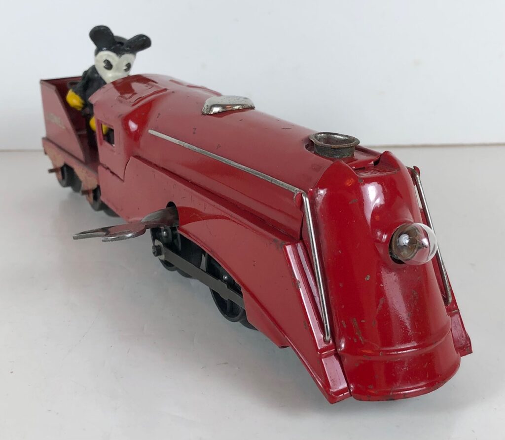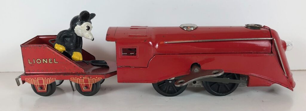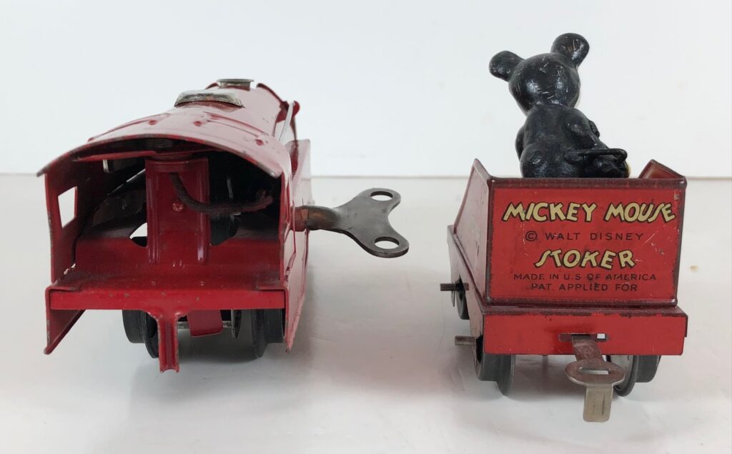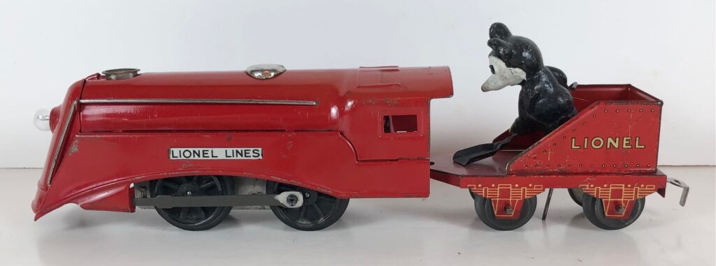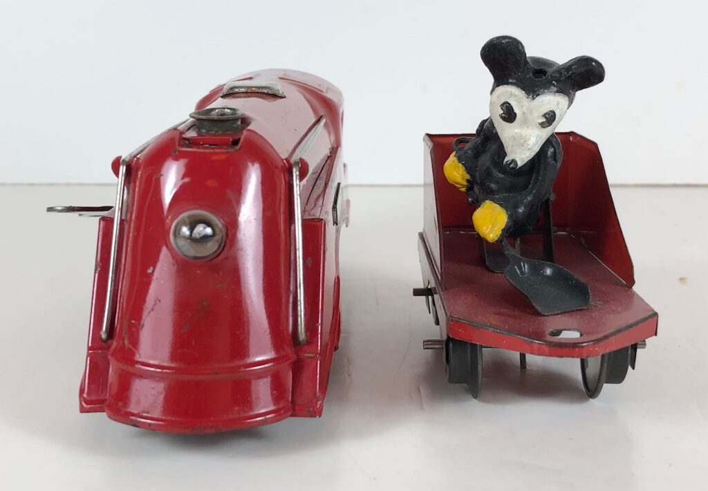 The 0-4-0 locomotive has a sheet metal body, nickel handrails, nickel trim and an aluminum plate with “Lionel Lines” on one side only. The drive wheels on the locomotive have eight spokes. The No. 1508 Steam Engine is usually paired with the No. 1509 Mickey Mouse 4-Wheel Tender. The Mickey Mouse stoker in the tender has a rod connected to the underside of the figure that caused the figure to “shovel” when it hit the ties in the track. The No. 1509 Tender is lithgographed in red with “Lionel” on the sides and “Mickey Mouse Stoker” on the rear. The No. 1508 / 1509 Steam Locomotive measures 10 1/2-inches in overall length.