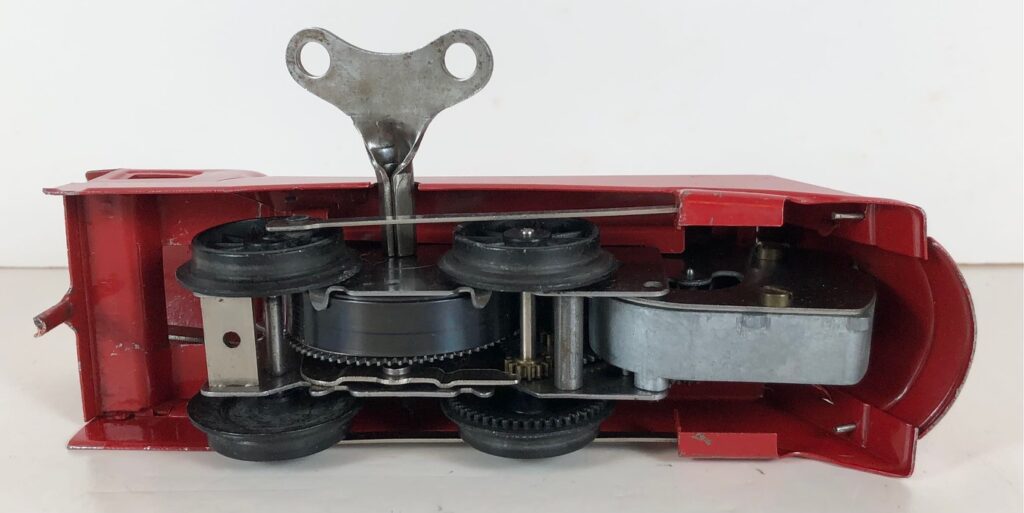 The Lionel No. 1511 Commodore Vanderbilt Steam Locomotive was introduced in 1936 and was cataloged through 1937. The No. 1511 Steam Locomotive is powered by a mechanical or clockwork motor operated by a wind-up key. The motor has a lever that serves as a brake when engaged that protrudes through the rear of the cab. The No. 1511 Locomotive headed a number of freight and passenger sets with varied consists. This locomotive was loosely based on the New York Central J-1e “Commodore Vanderbilt” Hudson locomotive. The No. 1511 Locomotive is very similar in appearance to the No. 1508 Locomotive. However, the drive wheels on the locomotive have 12 spokes.