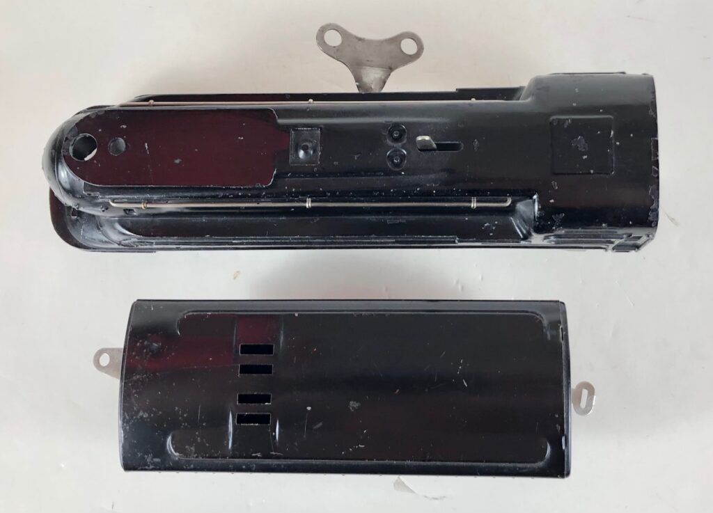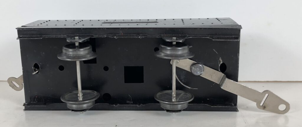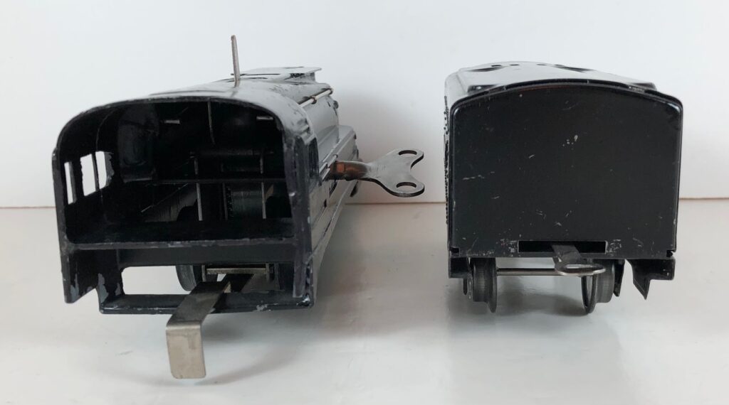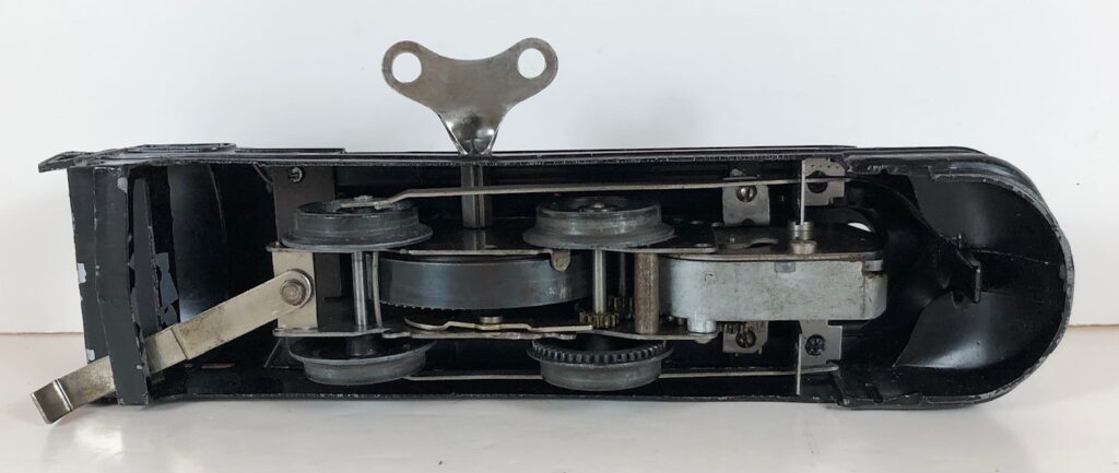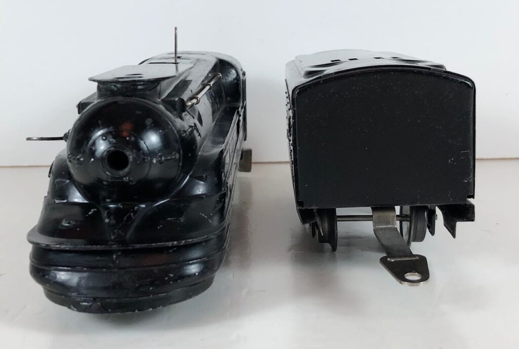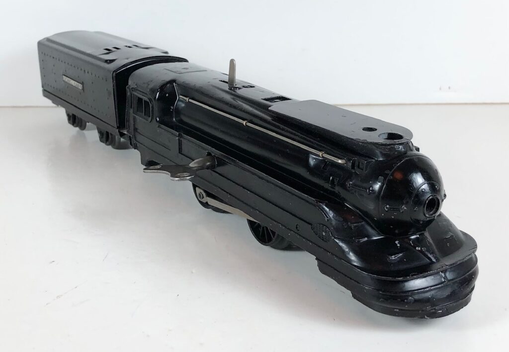 The Lionel No. 1588 “Torpedo” Steam Locomotive was introduced in 1936 and was cataloged through 1937. The No. 1588 Locomotive is powered by a mechanical or clockwork motor operated by a wind-up key. The motor has a lever that serves as a brake when engaged that protrudes through the top of the boiler. The No. 1588 Locomotive headed Set No. 1548 which included Nos. 1673, 1674, and 1675 streamlined passenger cars and Set No. 1549 which included Nos. 1512, 1514, 1515, and 1517 small 4-wheel litho freight cars. This locomotive was based on the Pennsylvania Railroad K-4 Pacific which Lionel referred to as the “Torpedo”.