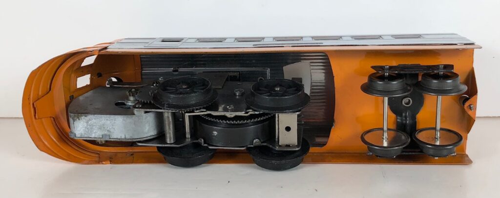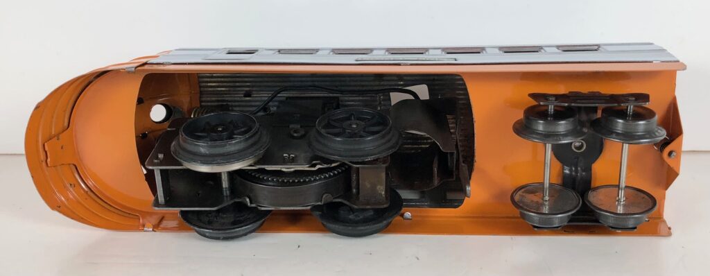 There are two versions of the No. 1816 Streamlined Locomotives. The early version of the locomotive has a battery operated headlight and bell and a brass circle “L” plate on the nose. The later version included an operating whistle in lieu of the headlight and bell and an aluminum circle “L” plate on the nose. The location of the hole for the wind-up up key was moved back in the later version of the locomotive to accommodate the whistle mechanism. The sides of the locomotives, and accompanying coaches, always came in fluted stampings.