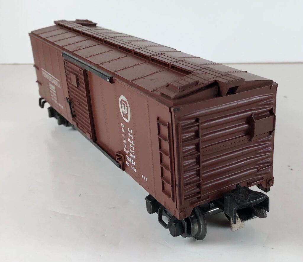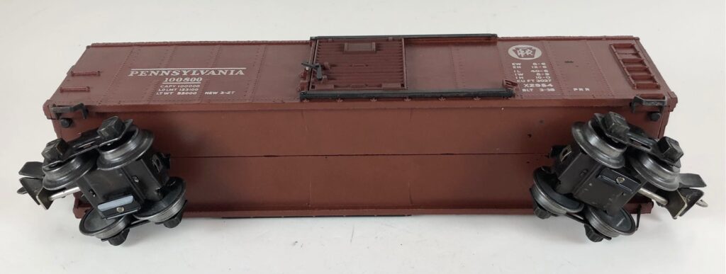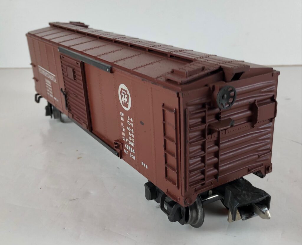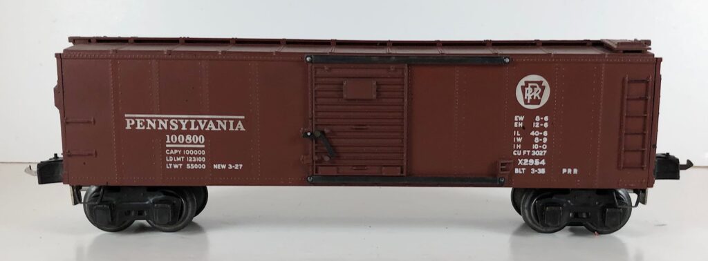 The Lionel No. 2954 Pennsylvania Box Car was introduced in 1940 and was issued through 1942. The No. 2954 Box Cars were based on the PRR X29 class. The No. 2954 Box Cars measure 10 1/2-inches in length. The box cars were made of a phenolic resin with molded details for the ladders and ribbed sides. The body, roof and underside were all painted Tuscan brown. The cars had sliding doors that matched the color of the car body. The doors opened and were held closed by a black metal latch. The doors were held in place by black metal door guides. The car number, “Pennsylvania”, PRR Herald, and capacity data were heat stamped on the sides of the car in white. The cars have black journals. The box cars have late style operating box couplers. The coupler height and shank length varied.