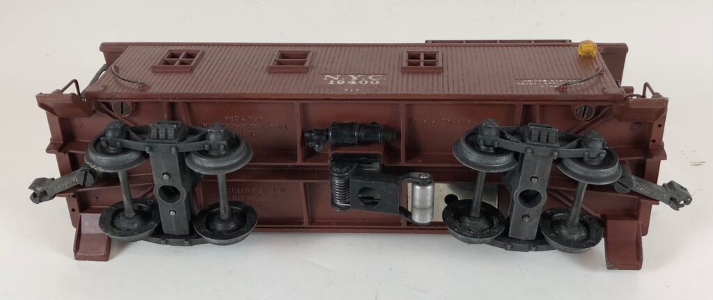 The Lionel No. 717 New York Central (N.Y.C.) Caboose was introduced in 1940 and was issued through 1942. The No. 717 Cabooses measure 9-inches in length. The cabooses were made of a diecast metal with molded details for the windows and doors. The body, roof, cupola and underside were all painted Tuscan brown. Added details included a stack, rear running lights, steps, ladders, handrails, air brake tank, and catwalk. The car number, “N.Y.C. 19400” and other information were heat stamped on the sides of the car in white. The cabooses were illuminated. The cars have Bettendorf scale trucks, scale couplers, and wheels. These cars were made for use on Lionel T-Rail track.