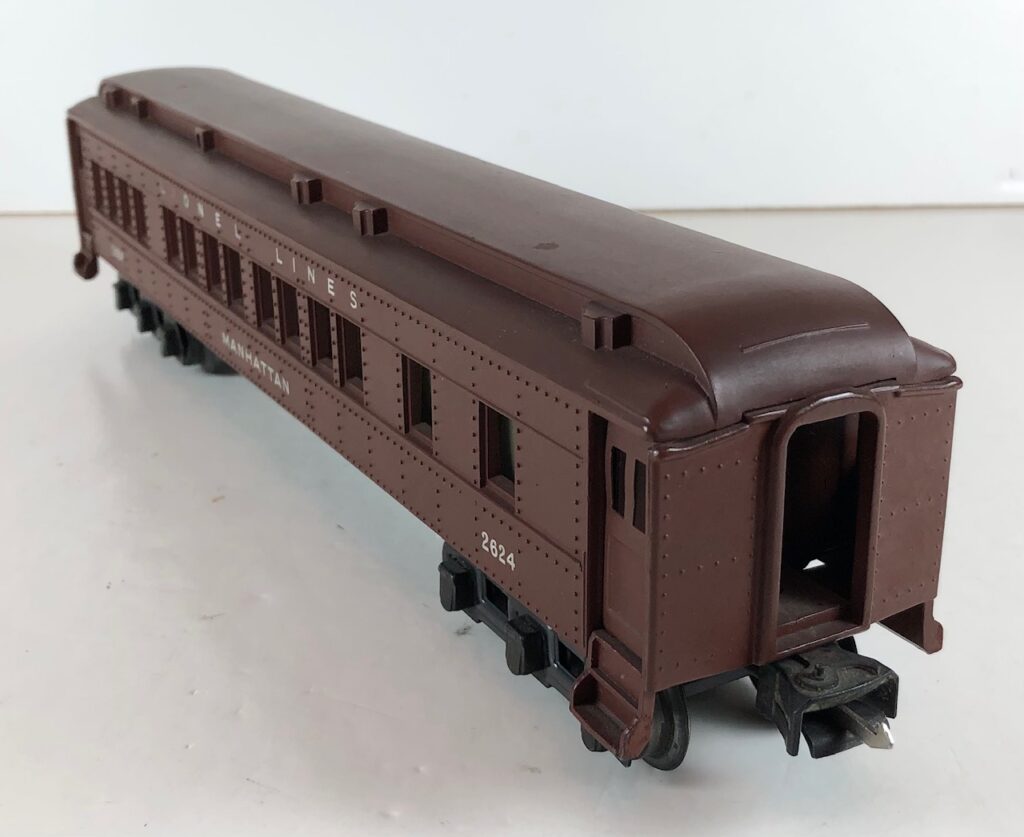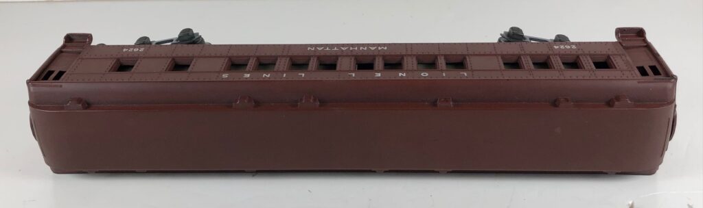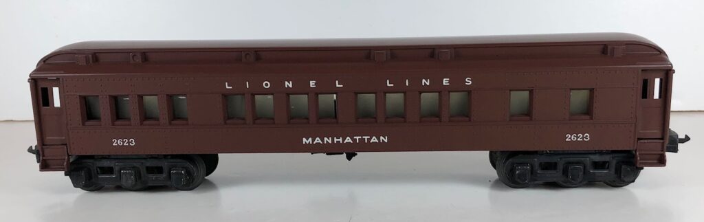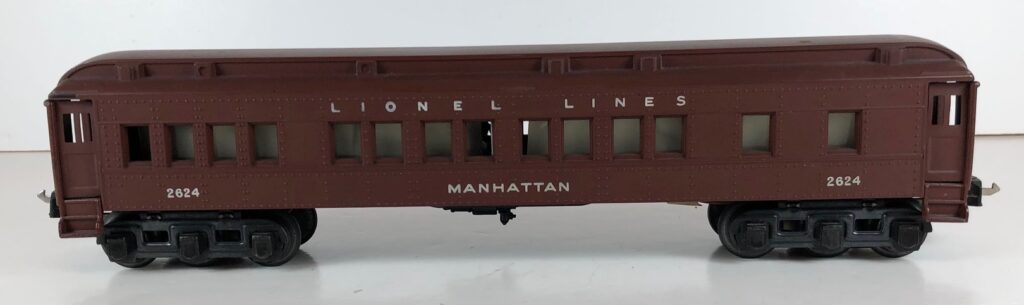 Lionel introduced its new “Scale Proportioned” passenger cars in 1941.  In 1941, these cars were included in two sets – Set No. 890W which included three of the new passenger cars and Set No. 748W which included four of these cars.  The two sets were cataloged with two or three Pullman cars, respectively, and an observation car.  The Pullman cars were always numbered No. 2623 and were named either “Irvington” or Manhattan”.  The observation car was depicted in the catalog as No. 2624 “Manhattan”.  However, Lionel never manufactured the observation car.  Therefore, these sets were either issued with three or four Pullman cars as either “Irvington” or “Manhattan”.  Apparently, in anticipation of the observation car, Lionel produced a number of bodies decorated for No. 2624 “Manhattan”.  Following the decision not to produce the observation car, these bodies were assembled as Pullman cars and included in a very limited number of the No. 890W and 748W sets.  Since there were so few No. 2624 cars produced, Lionel never printed standard orange and blue component boxes for these cars.  Instead, they over stamped left over boxes for the No. 753 streamlined coach with “2624M”.