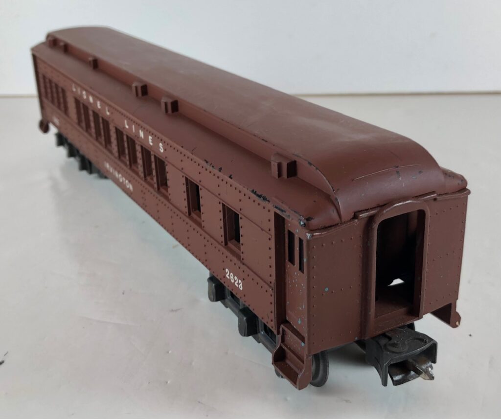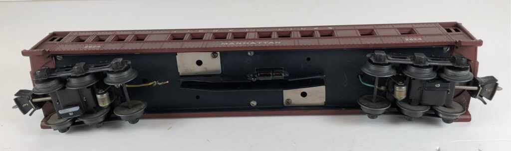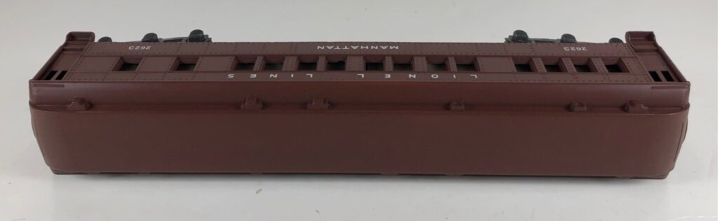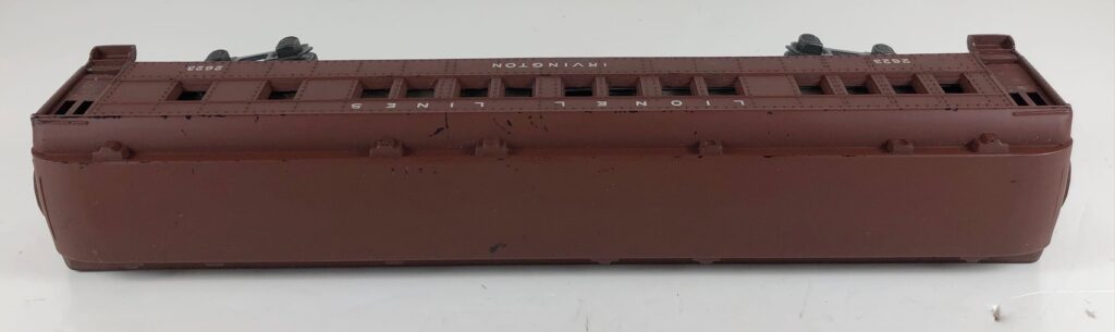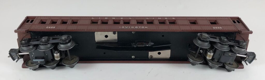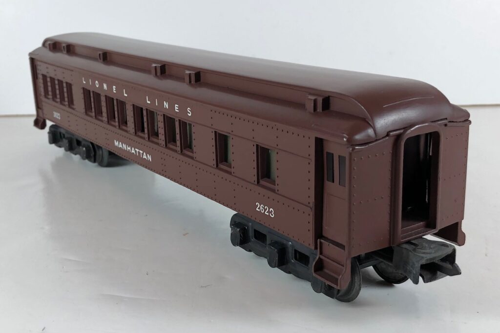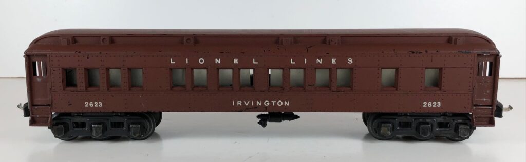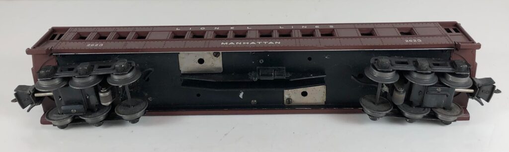 The No. 2623 and 2624 Passenger Cars measure 13 3/4-inches in length. The car bodies were manufactured with a phenolic material and were painted brown with white heat stamped lettering for the name and number of the car. Due to a problem with adhesion of the paint to the phenolic bodies, the cars have a tendency to flake. The cars have frosted celluloid strips in the windows. The bodies were mounted on a black metal frame with an air brake cylinder attached to the frame. The cars were illuminated with two interior lights. The cars have six-wheel trucks with late style operating box couplers.