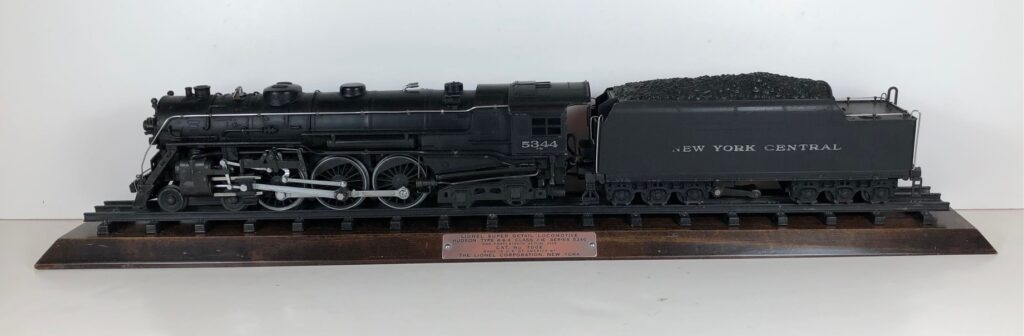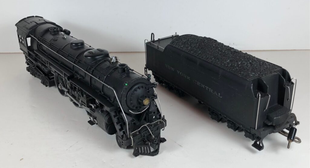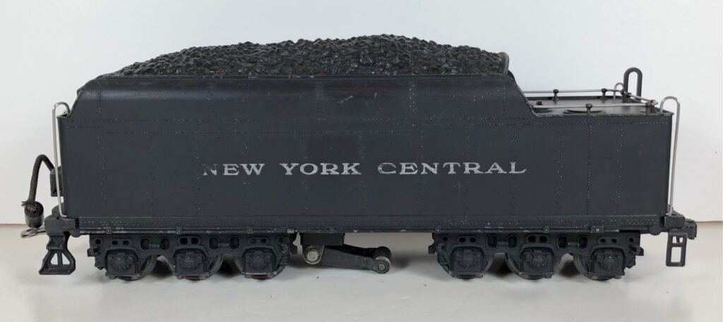 The No. 700E Steam engine and tender combined measure 24-inches in total length. The engine has a diecast body with marker lights, steel handrails, decorative bell, molded in boiler details, and added scale details. The engine has an operating headlight and a manual scale front coupler. The number “5344” is rubber stamped on the sides of the cab under the windows and appears on the sides of the headlight. Reversing of the locomotive is accomplished by a conventional E-Unit. The locomotive has scale flanges on all six drive wheels. The tender shell is diecast and has steel handrails, molded details, steps on the corners, and a simulated coal pile. The tender is equipped with an operating whistle. The tender has 6-wheel scale trucks, scale wheels and a manual scale coupler. “New York Central” is rubber stamped on the sides of the tender. This locomotive was made for use on Lionel T-Rail track.