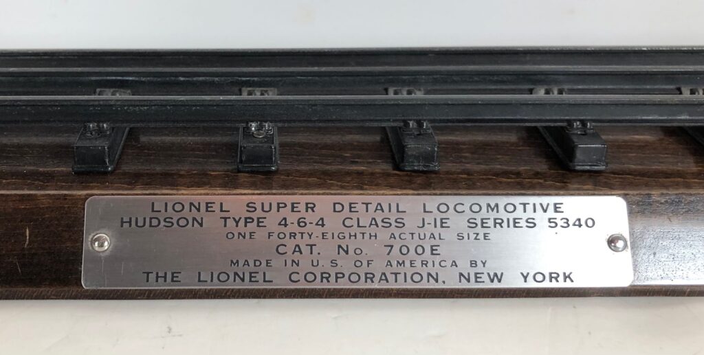 The Lionel No. 700E 4-6-4 New York Central Scale Steam Locomotive was introduced in 1937 and was issued through 1942. The No. 700E Scale Steam Locomotive was based on the New York Central 1931 J1-e Hudson Locomotive. The No. 700E Steam Locomotive was available for separate sale, cataloged as No. 700EW. When sold separately, the No. 700EW included a wooden display board with a section of T-Rail Track and an identification plaque. The No. 700E Steam Locomotive was also included as a component of Set No. 709W with four “Rail Chief” streamlined passenger cars in 1937-1941 and as a component of Set No. 707W with four scale freight cars in 1940-1941. The No. 700E Steam Locomotive was always paired with the No. 700T New York Central Scale Tender with whistle.