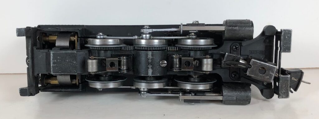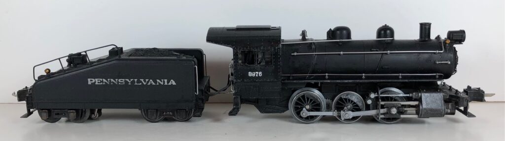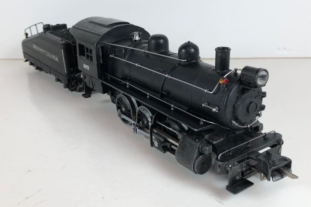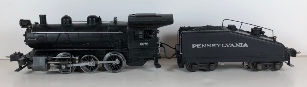 1. No. 233 / 2233B Pennsylvania 0-6-0 Steam Switcher (1941-1942). Cataloged as Outfit 907B. The locomotive was equipped with “Magic Electrol” (DC Control). Reversing of the locomotive, independently of other locomotives on the same track, is accomplished by pressing the “Train 1” button on the No. 168 Controller. Uncoupling was accomplished by use of a RCS Remote Control Track Section. The locomotive has high height late style operating box couplers. The barb was omitted from the front coupler tang to facilitate uncoupling.