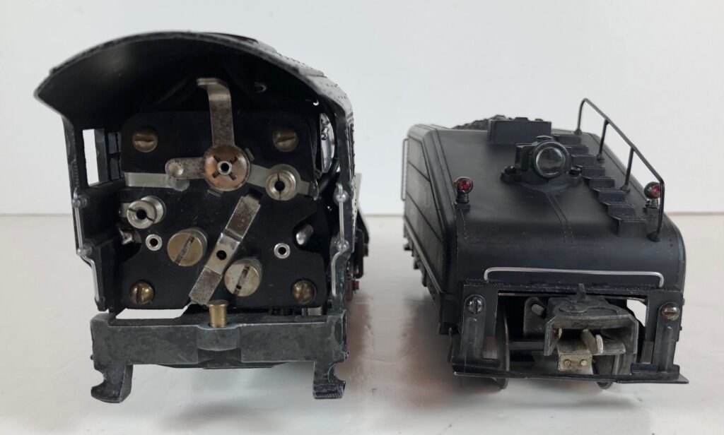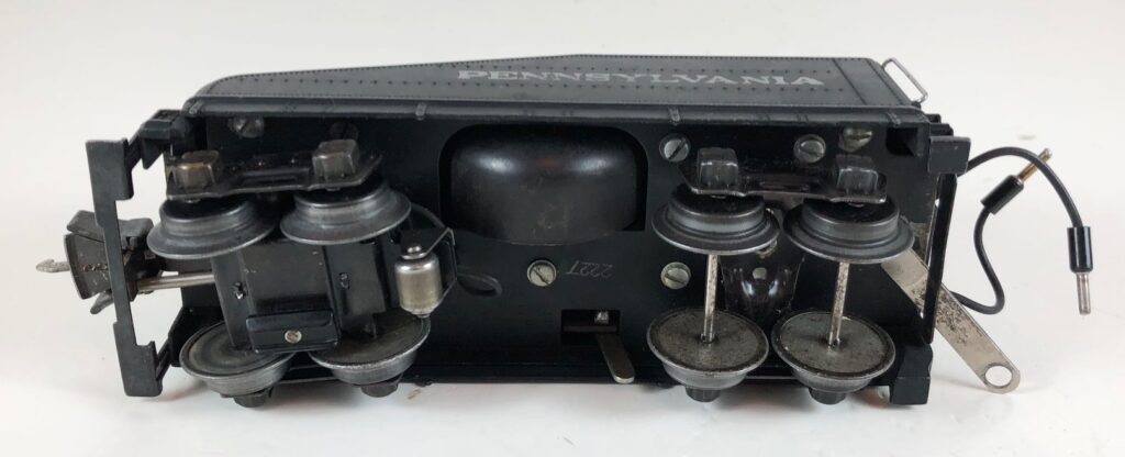 1. No. 227 / 2227B/T Pennsylvania 0-6-0 Steam Switcher (1939-1942). Cataloged as Outfit 902B with bell or Outfit 902 without bell when sold separately. The locomotive was equipped with Teledyne (DC control) couplers that could be operated anywhere on the track by pressing the “Uncouple” button on the No. 169 Controller. Reversing of the locomotive, independently from other locomotives on the same track, is accomplished by pressing the “Reverse” button on the No. 169 Controller. The locomotive has low height early or late style operating box couplers. The barbs were omitted from the front and rear coupler tangs, or the tangs were omitted completely, to facilitate uncoupling.
