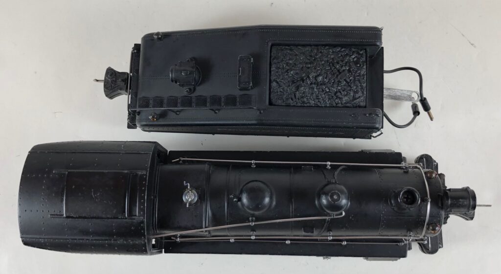 1. No. 232 / 2232B Pennsylvania 0-6-0 Steam Switcher (1940-1942). Cataloged as Outfit 906B. The locomotive was equipped with “Magic Electrol” (DC Control). Reversing of the locomotive, independently of other locomotives on the same track, is accomplished by pressing the “Train 1” button on the No. 168 Controller. Uncoupling was accomplished by use of a RCS Remote Control Track Section. The locomotive has low height late style operating box couplers. The barb was omitted from the front coupler tang to facilitate uncoupling.