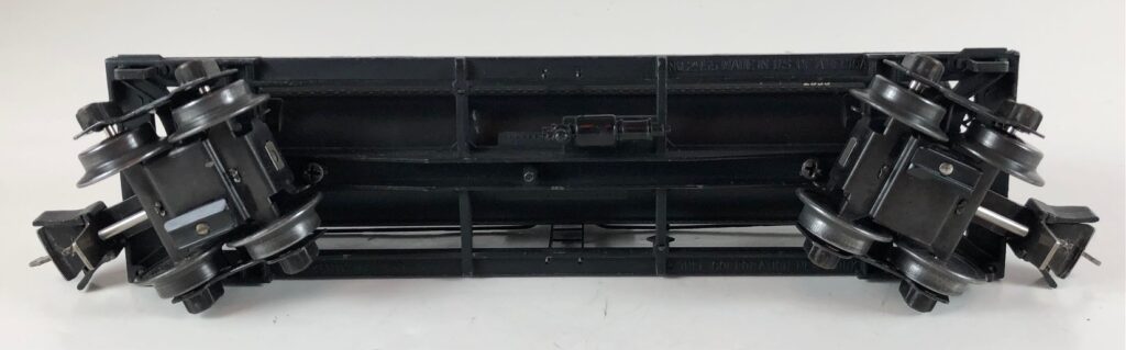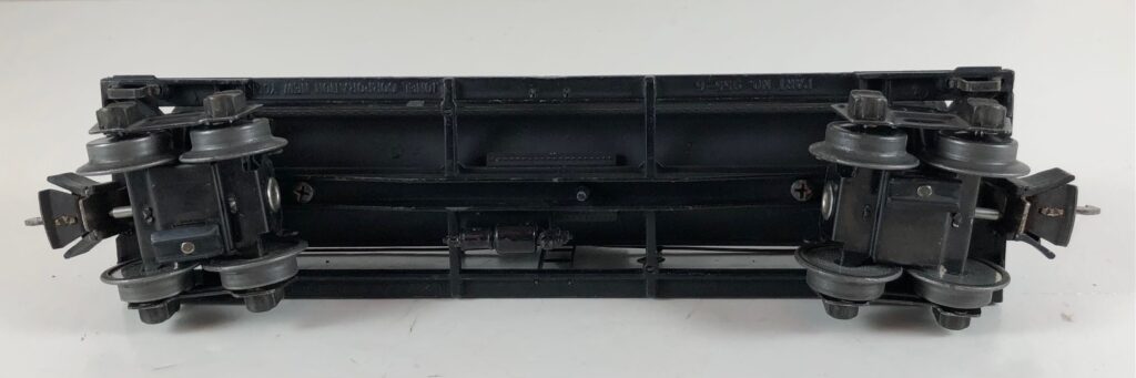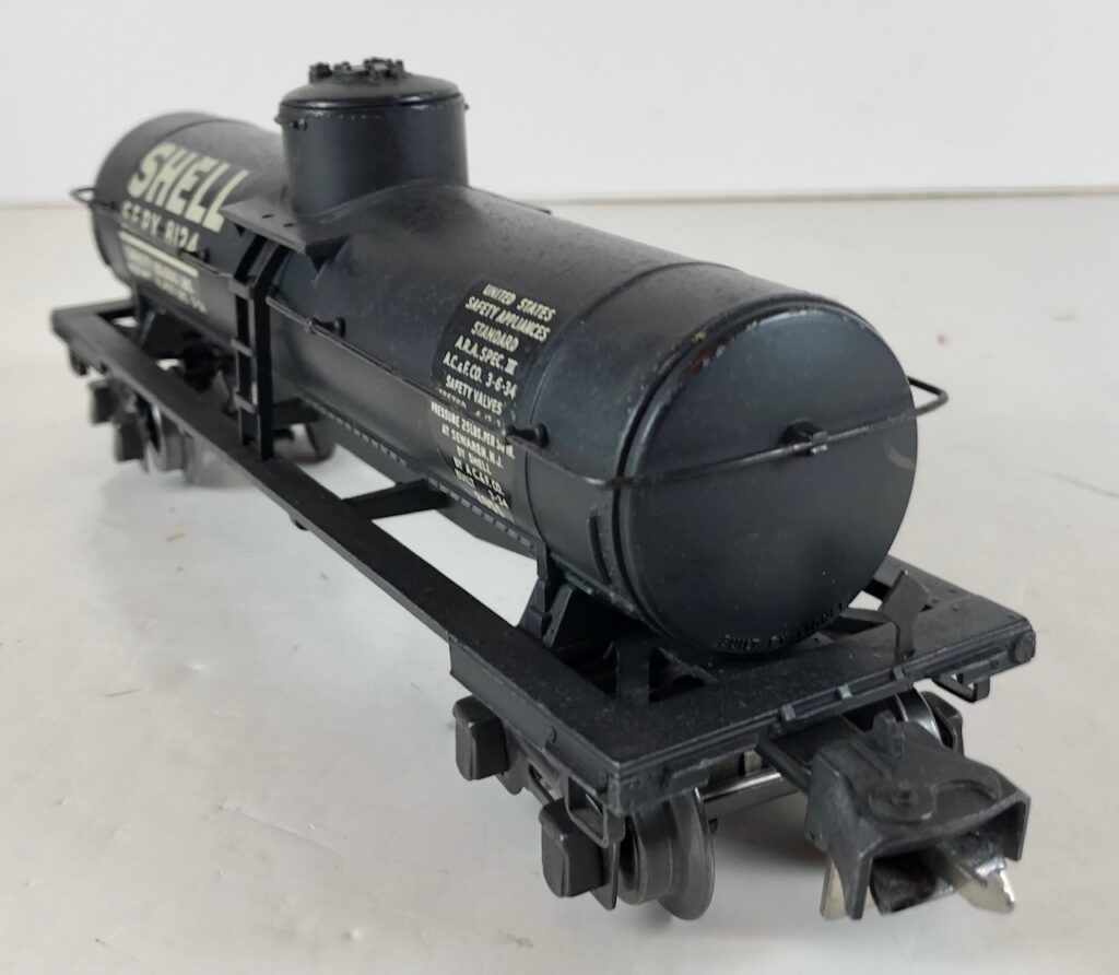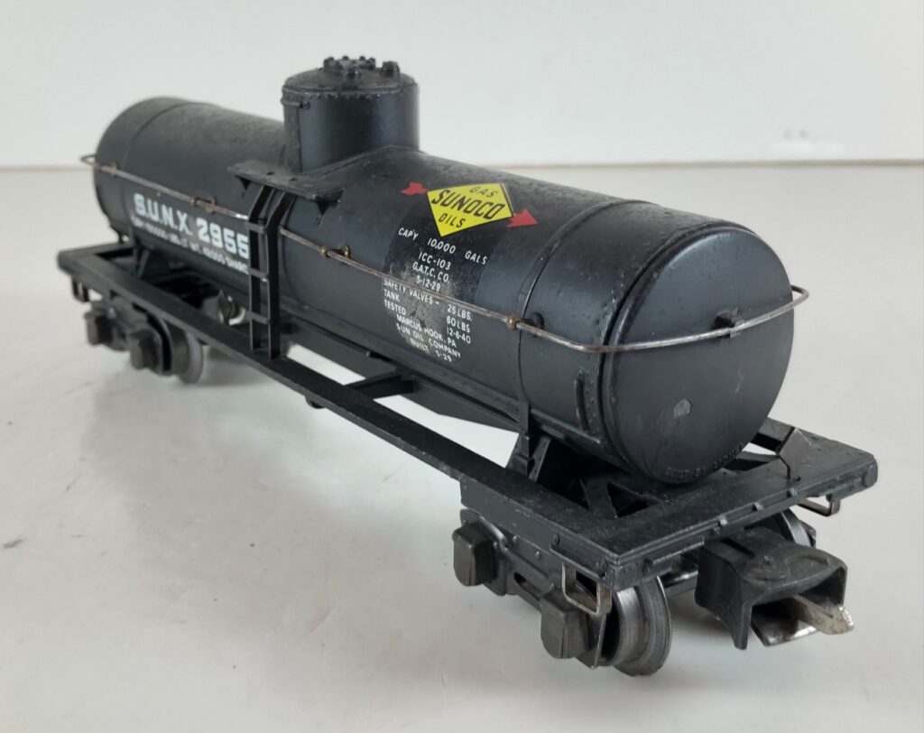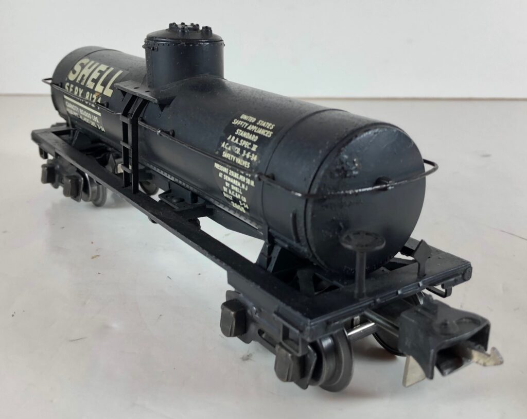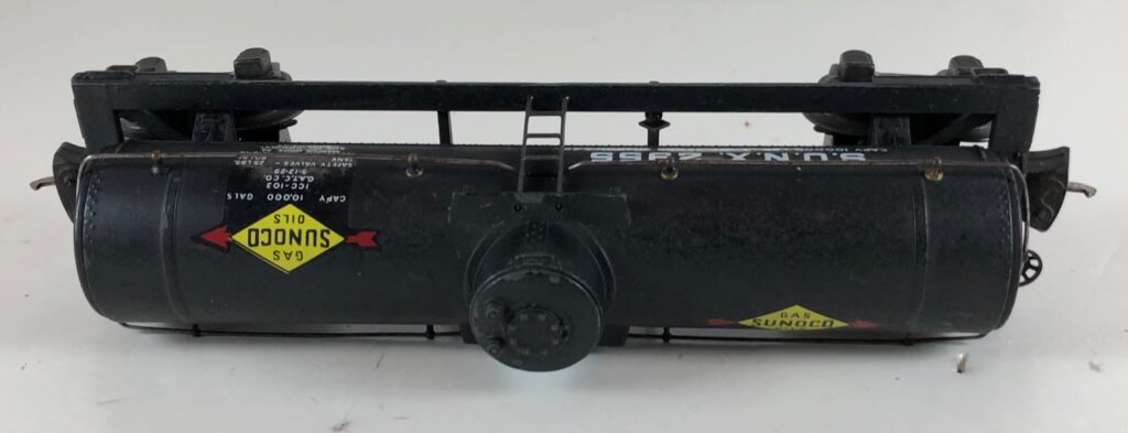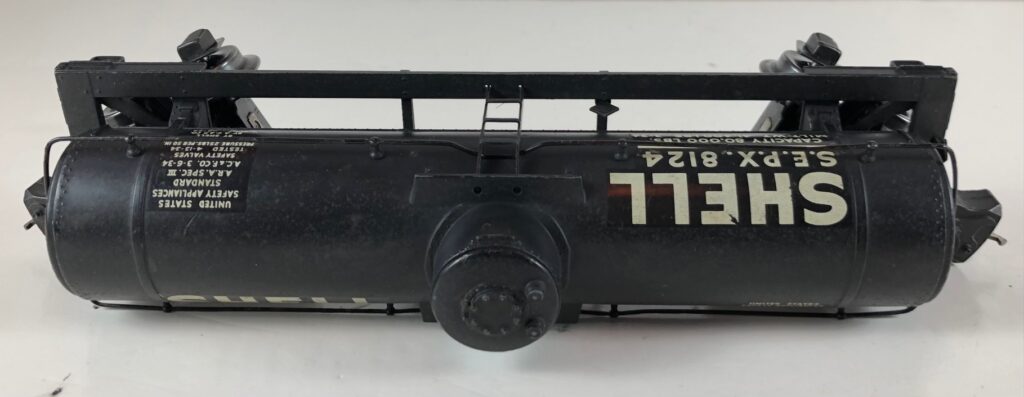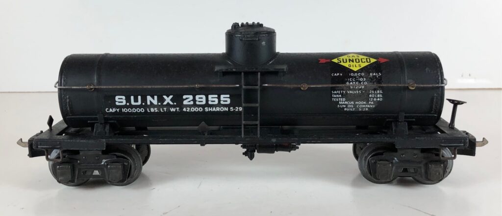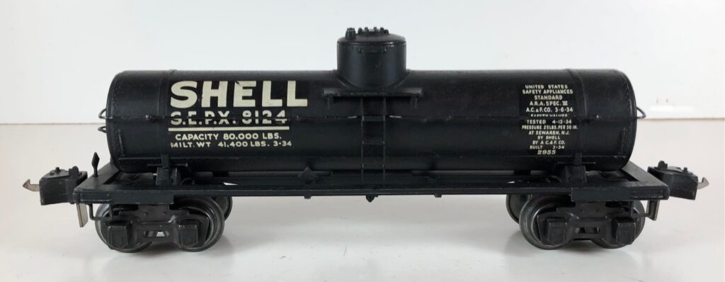 The Lionel No. 2955 Tank Car was introduced in 1940 and was issued through 1942. The No. 2955 Tank Cars measure 9-inches in length. The diecast metal tank car bodies and domes were always painted black. All of the tank cars have decals for either “Shell” or “Sunoco” applied to the sides. One version of the tank car had decals for “Shell”, “S.E.P.X. 8124” and the capacity data. The other version had decals “S.U.N.X. 2955”, the “Sunoco” diamond and capacity data. The tank cars have black handrails, ladders and journals. The tank cars have a black diecast frame with black steps in the corners, a black brake wheel, air brake tank and black diamond placard holders. The tank cars have late style operating box couplers. The coupler height and shank length varied.
