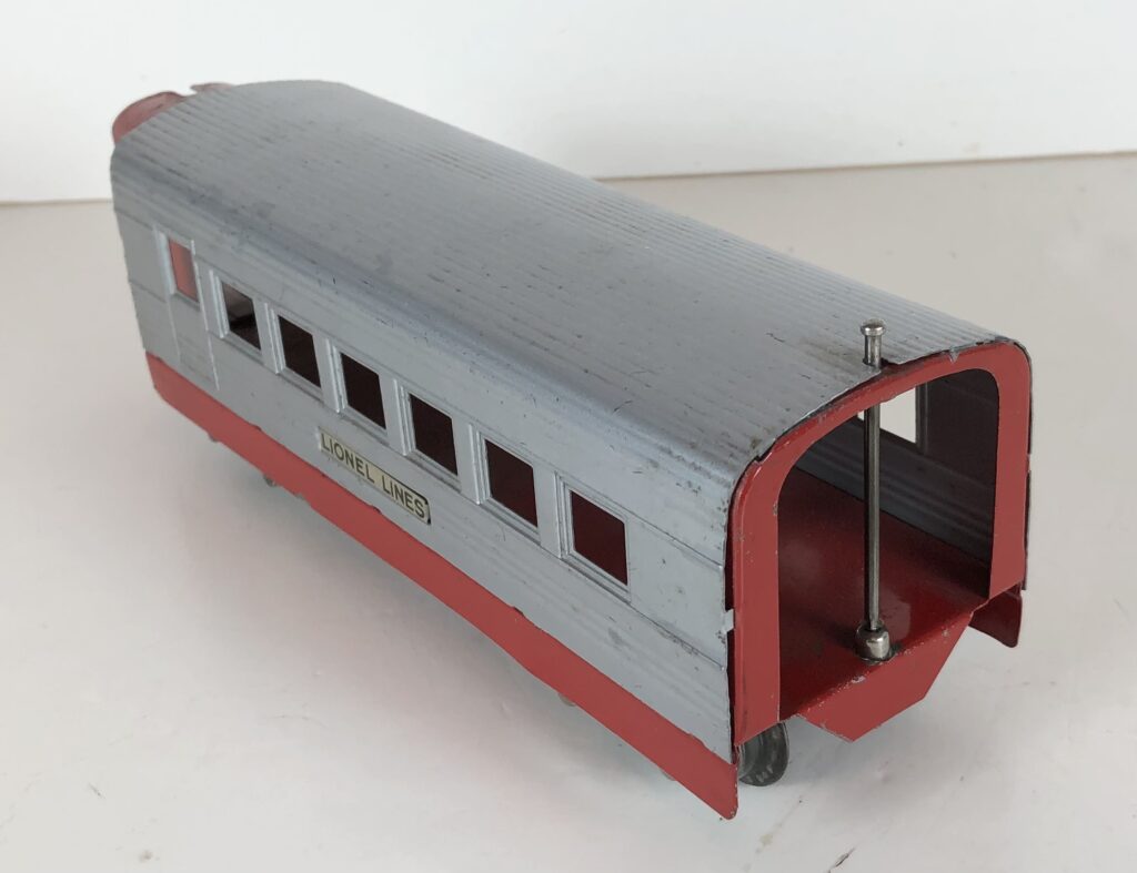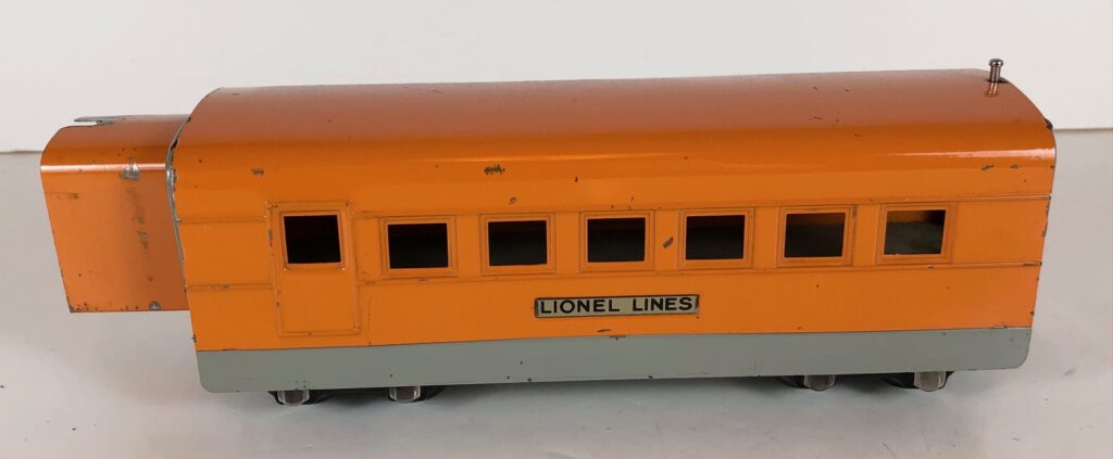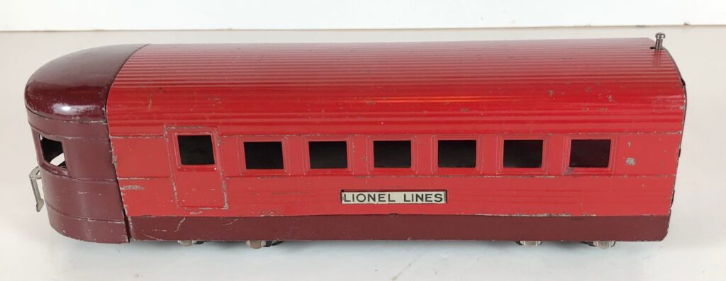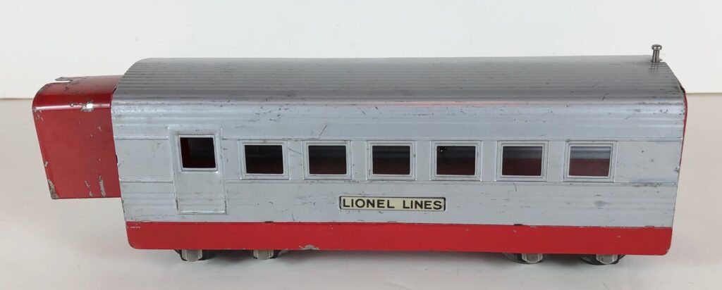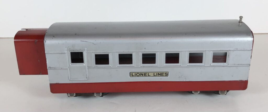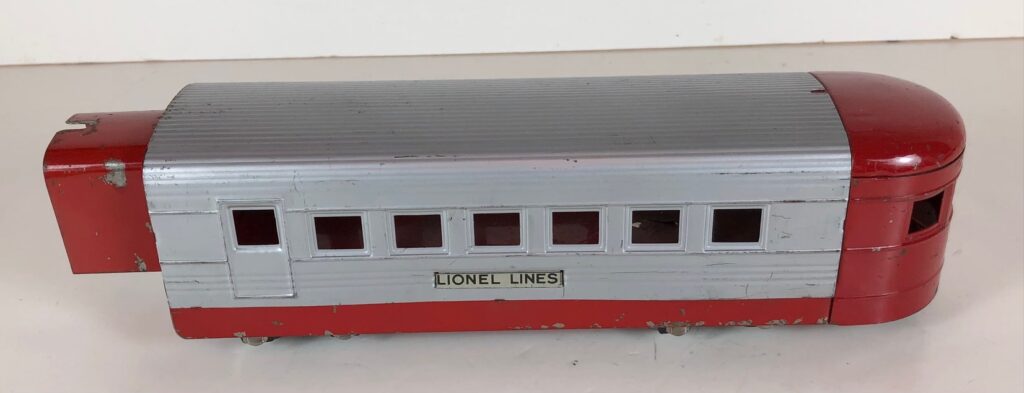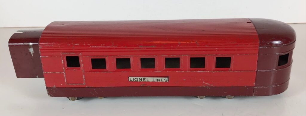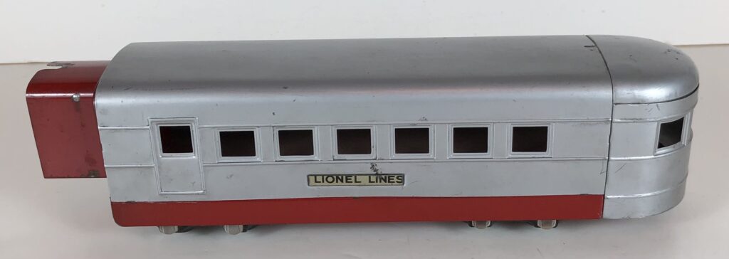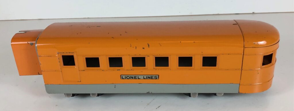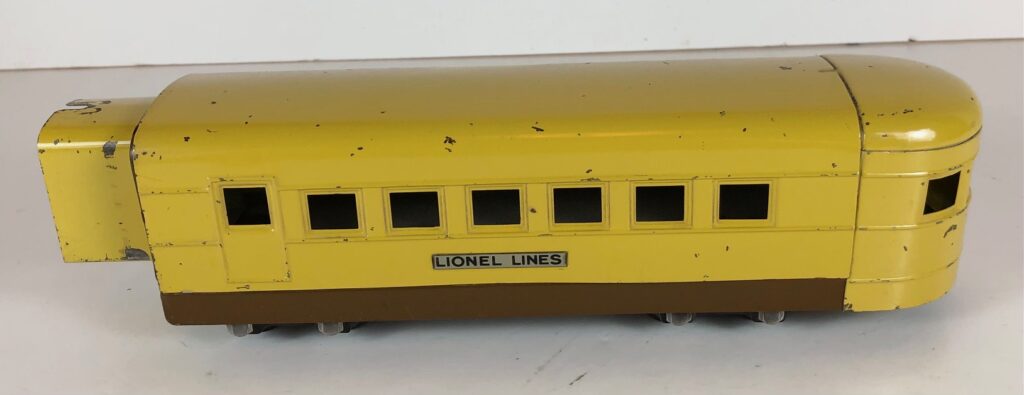 The Lionel No. 1701 Streamlined Coach, No. 1702 Streamlined Observation, and No. 1703 Streamlined Front End Streamlined Coach Passenger Cars were introduced in 1935 and were issued through 1937.  The Nos. 1701, 1702 and 1703 Streamlined Passenger Cars were included in Lionel Junior low end sets.  They were typically paired with Lionel No. 1700(E) Streamlined Locomotives, but they were also offered with several low end steam locomotives.  They were also included in a number of uncataloged or “Special” sets.