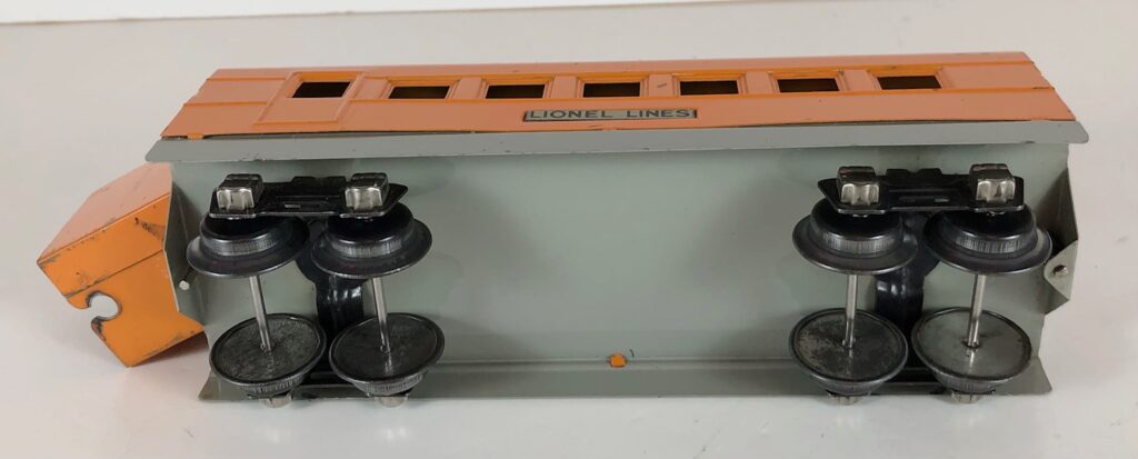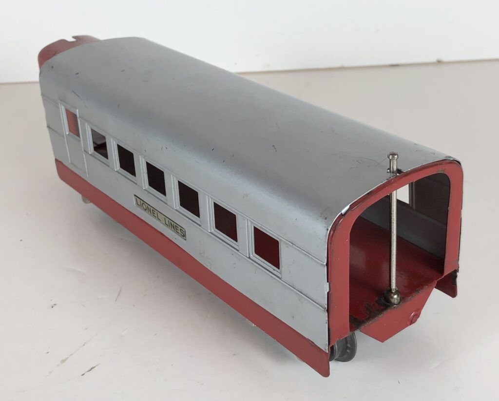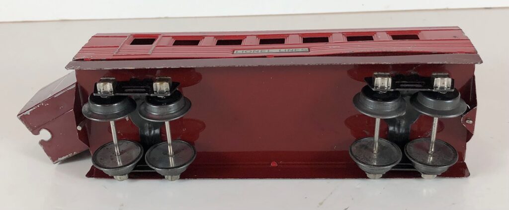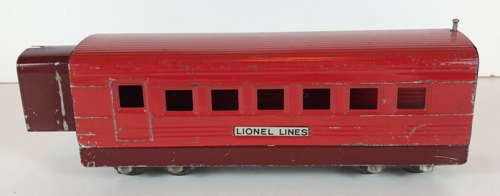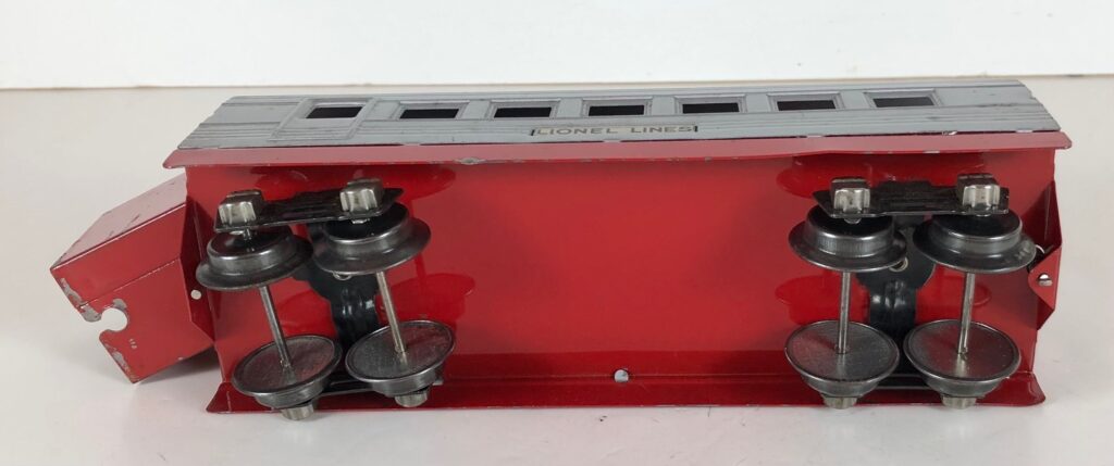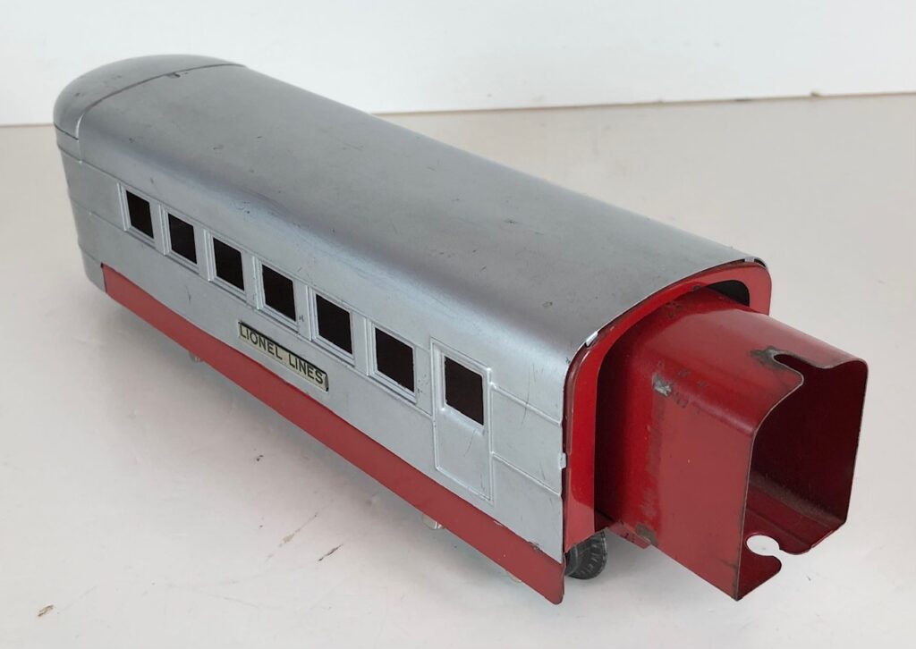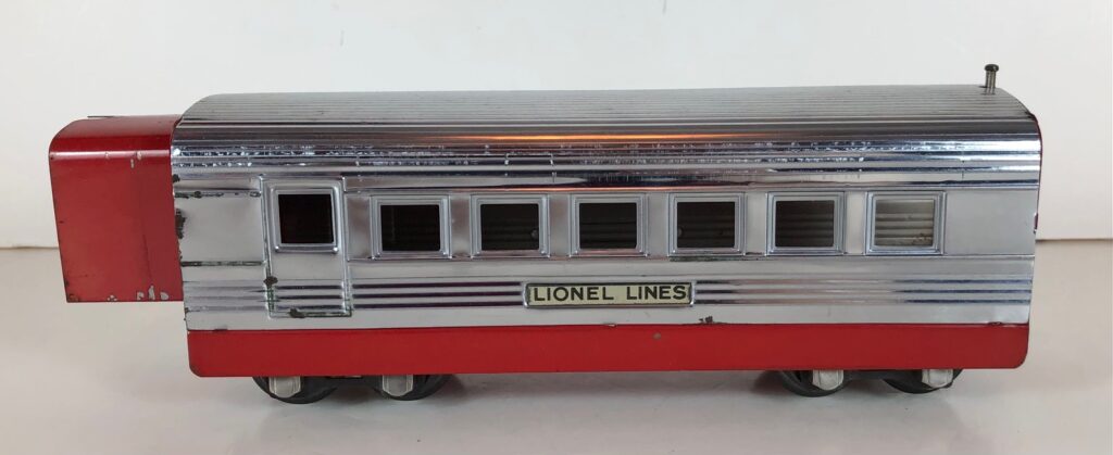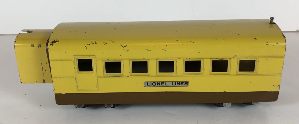 The Lionel No. 1701 Streamlined Coach, No. 1702 Streamlined Observation, and No. 1703 Streamlined Front End Streamlined Coach Passenger Cars were introduced in 1935 and were issued through 1937.  The Nos. 1701, 1702 and 1703 Streamlined Passenger Cars were included in Lionel Junior low end sets.  They were typically paired with Lionel No. 1700(E) Streamlined Locomotives, but they were also offered with several low end steam locomotives.  They were also included in a number of uncataloged or “Special” sets.