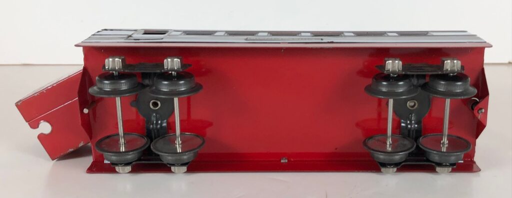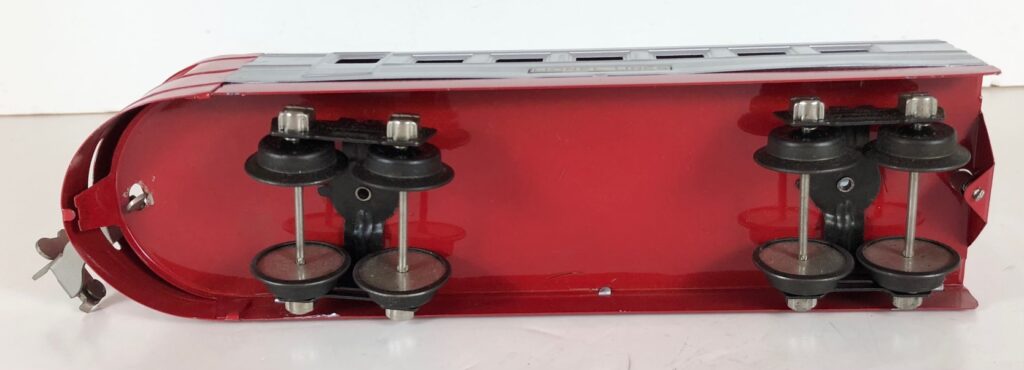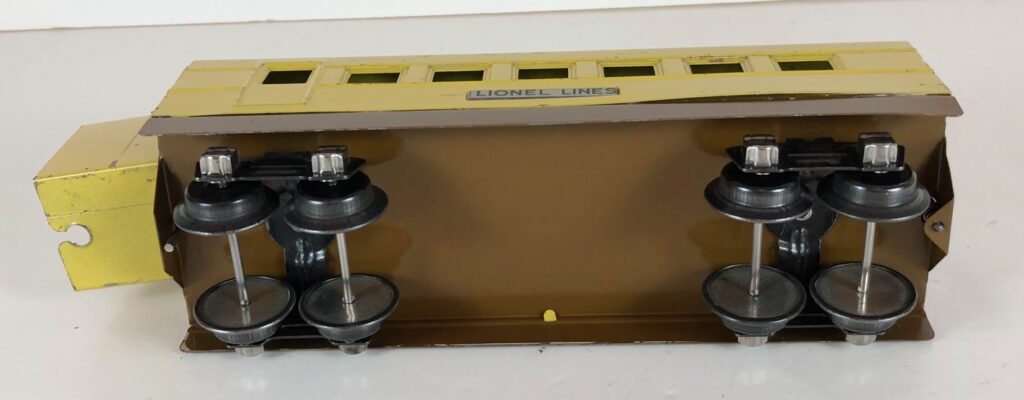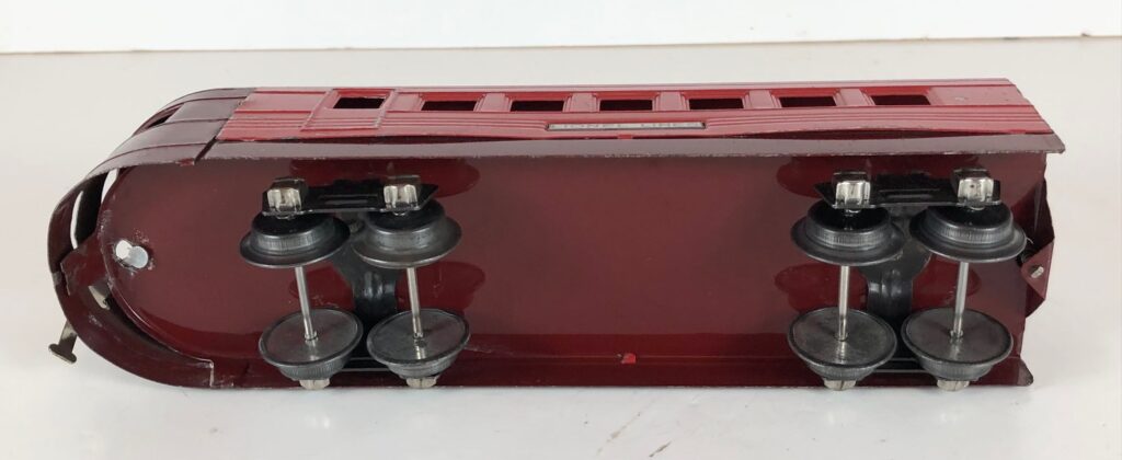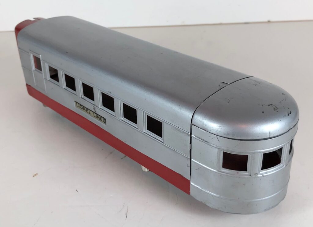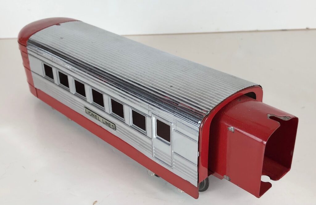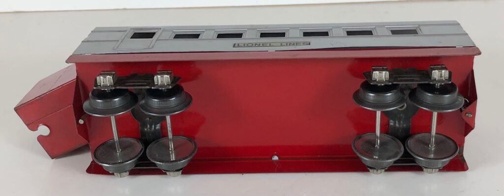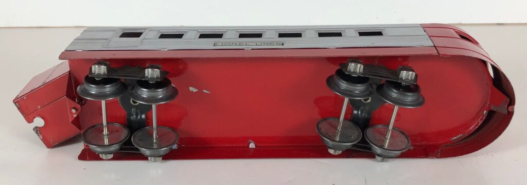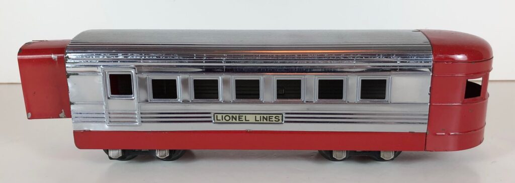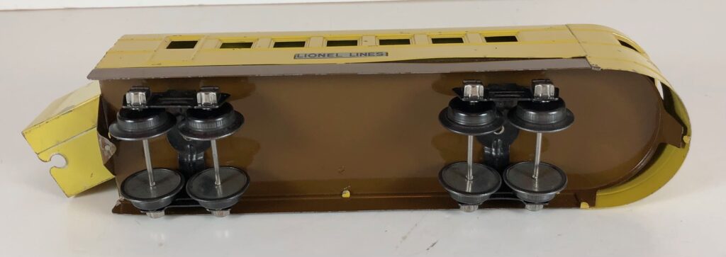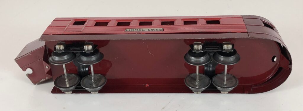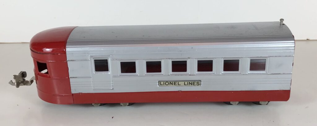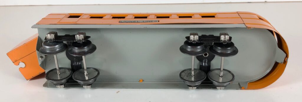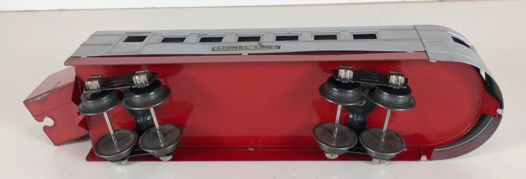 The Nos. 1701, 1702, and 1703 Streamlined Passenger Cars vary in length.  The No. 1701 Streamlined Coach measures 9-inches in length (including the vestibule), the No. 1702 Streamlined Observation measures 10 1/2-inches in length (including the vestibule), and the No. 1703 Streamlined Front End Coach measures 9 1/2-inches in length.  The cars are not numbered and all have a “Lionel Lines” plate on the sides.   The Nos. 1701, 1702, and 1703 Streamlined Passenger Cars are not articulated as the cars each have two complete trucks.  However, the cars have connecting vestibules to give the train a streamlined appearance. The cars are not illuminated.  All of the cars have nickel journals.