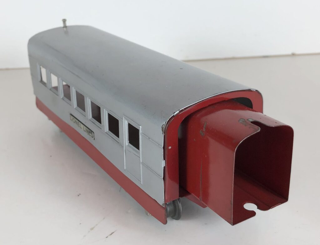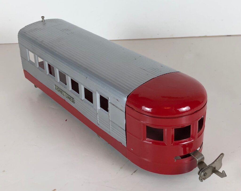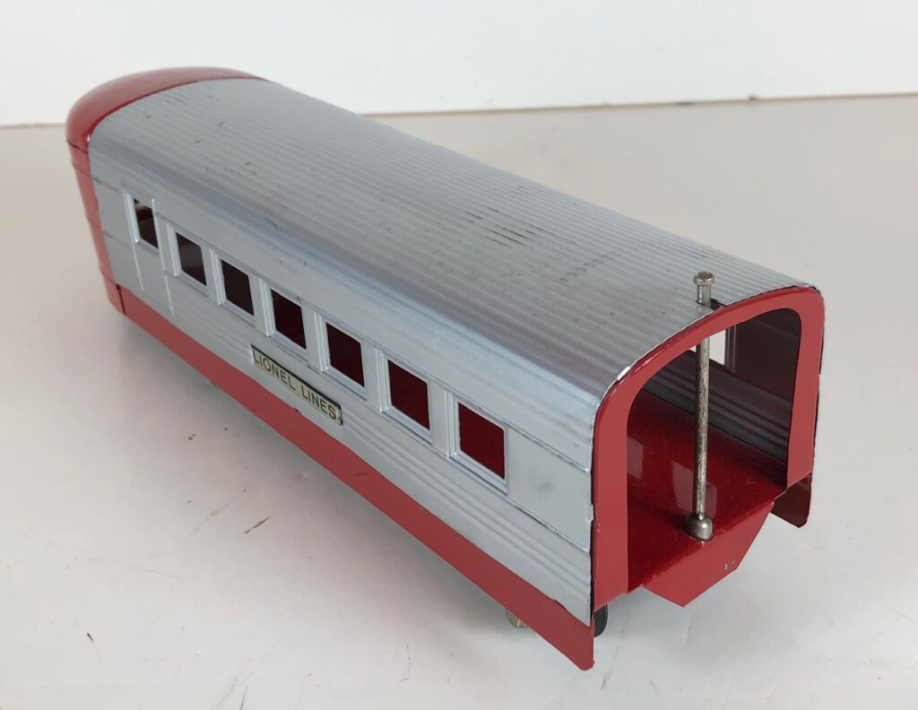5. No. 1703 Streamlined Front End Coach in red and aluminum with fluted sides.