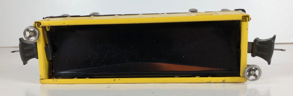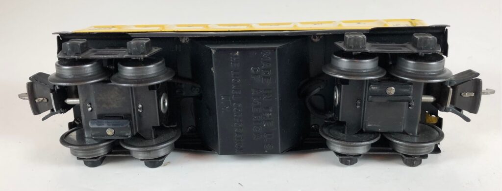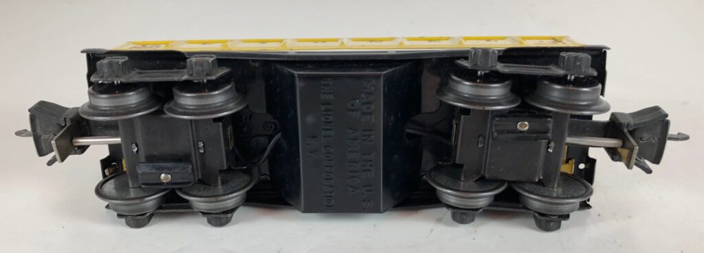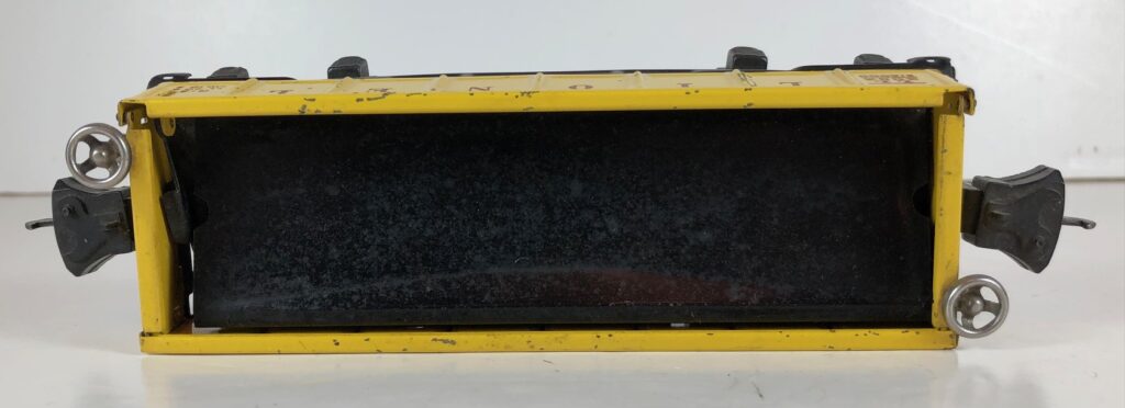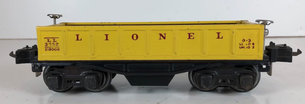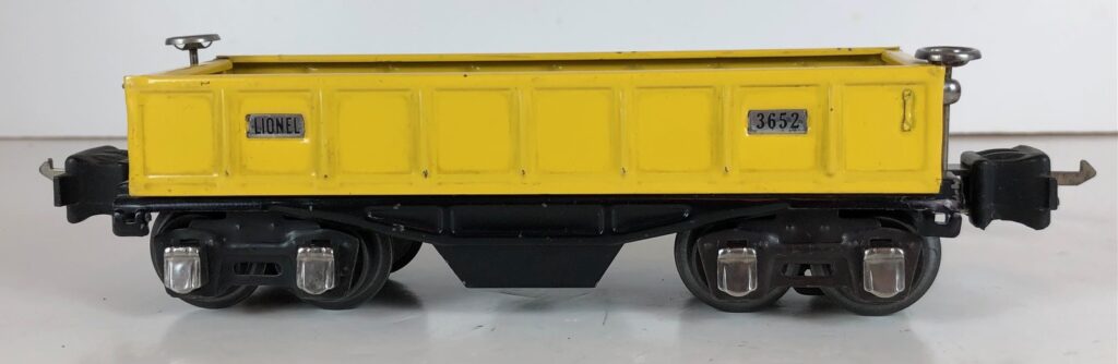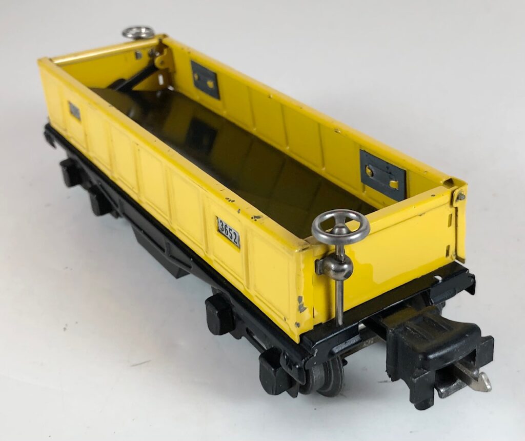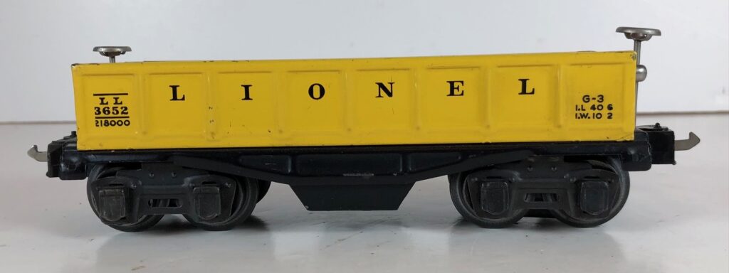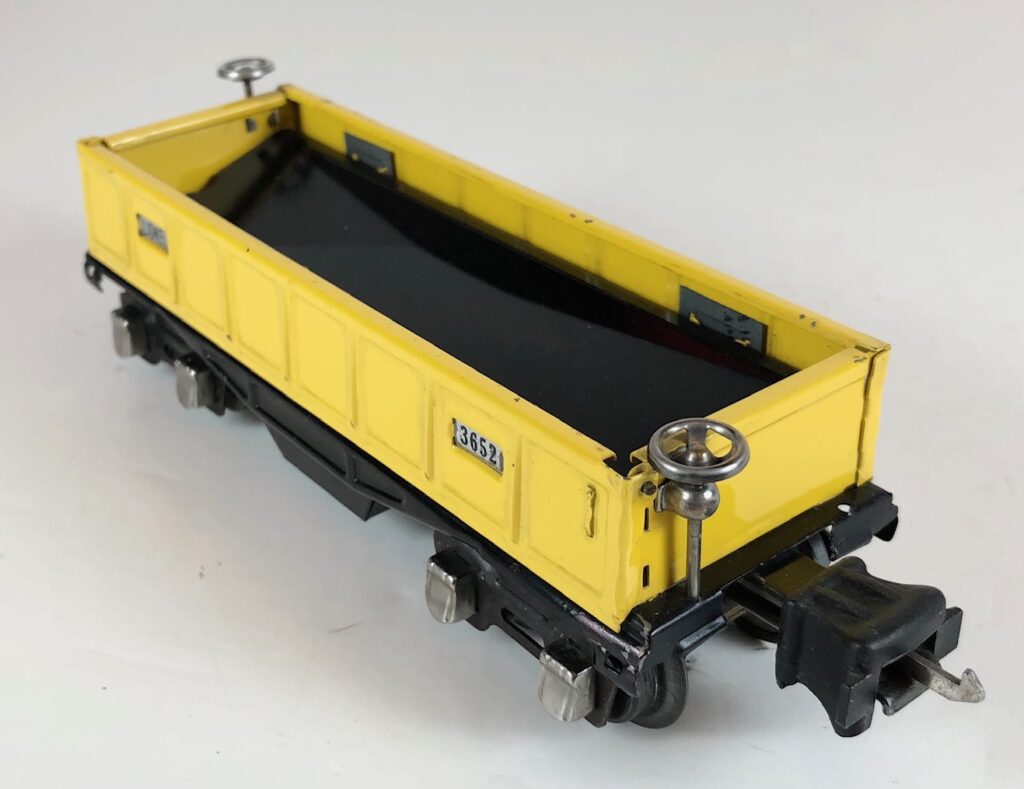 4. No. 3652 Operating Gondola Car in yellow (1941-1942). The cars have black, rubber stamped number and data, nickel trim and black journals. The cars have late style operating box couplers.