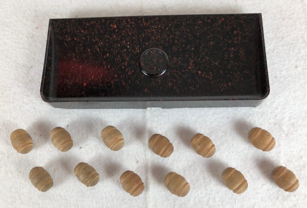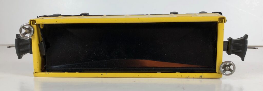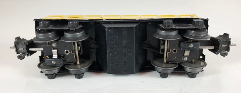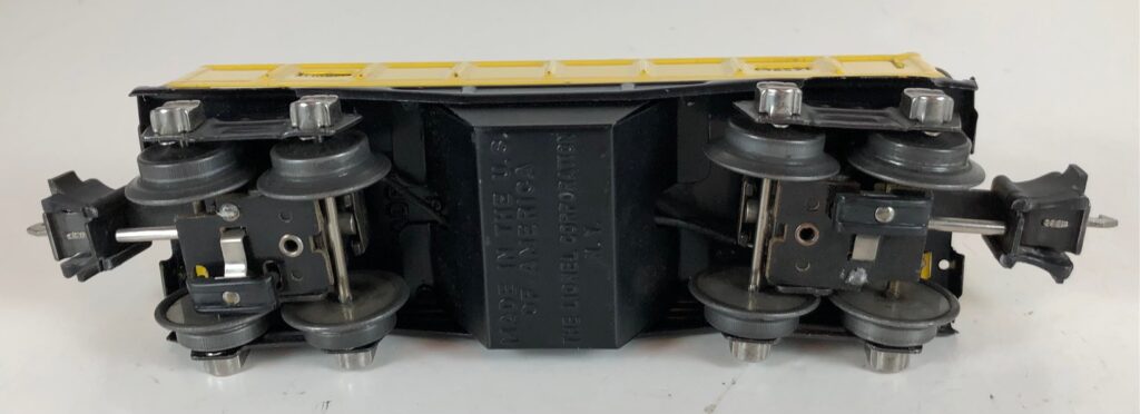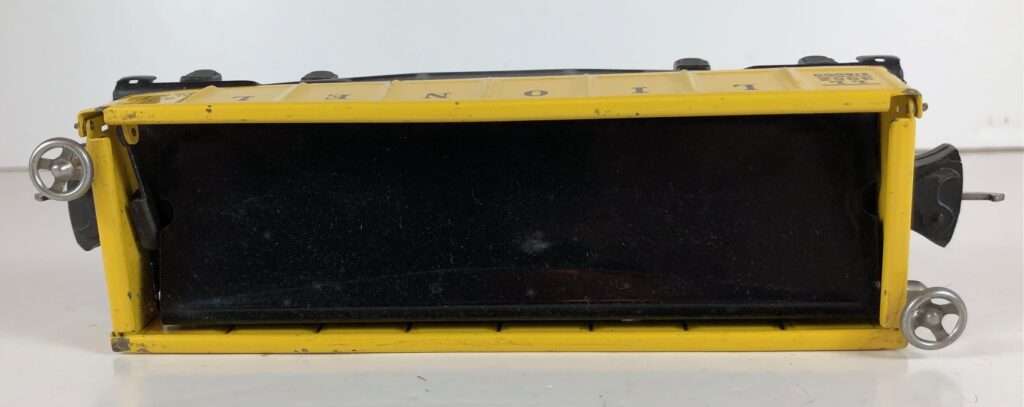 The Lionel No. 3652 operating Gondola Cars were introduced in 1939 and were issued through 1942. The cars had a solenoid mounted on the underside which caused one side of the car to lift when activated. The floor of the car was shaped to allow the specially designed wood barrels to dump under the lifted side. The car came with 12 of the rounded wood barrels and a No. 160 Bakelite unloading bin, as pictured below. The No. 3652 Operating Gondola Cars always had operating couplers. The No. 3652 Gondola Cars measure 6 1/2-inches in length. The operating gondola car bodies were always painted yellow and had a black frame. All of the gondolas have nickel trim.
