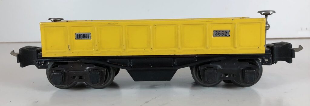 1. No. 3652 Operating Gondola Car in yellow (1939). The cars have aluminum plates, nickel trim and nickel journals. The cars have early style operating box couplers.