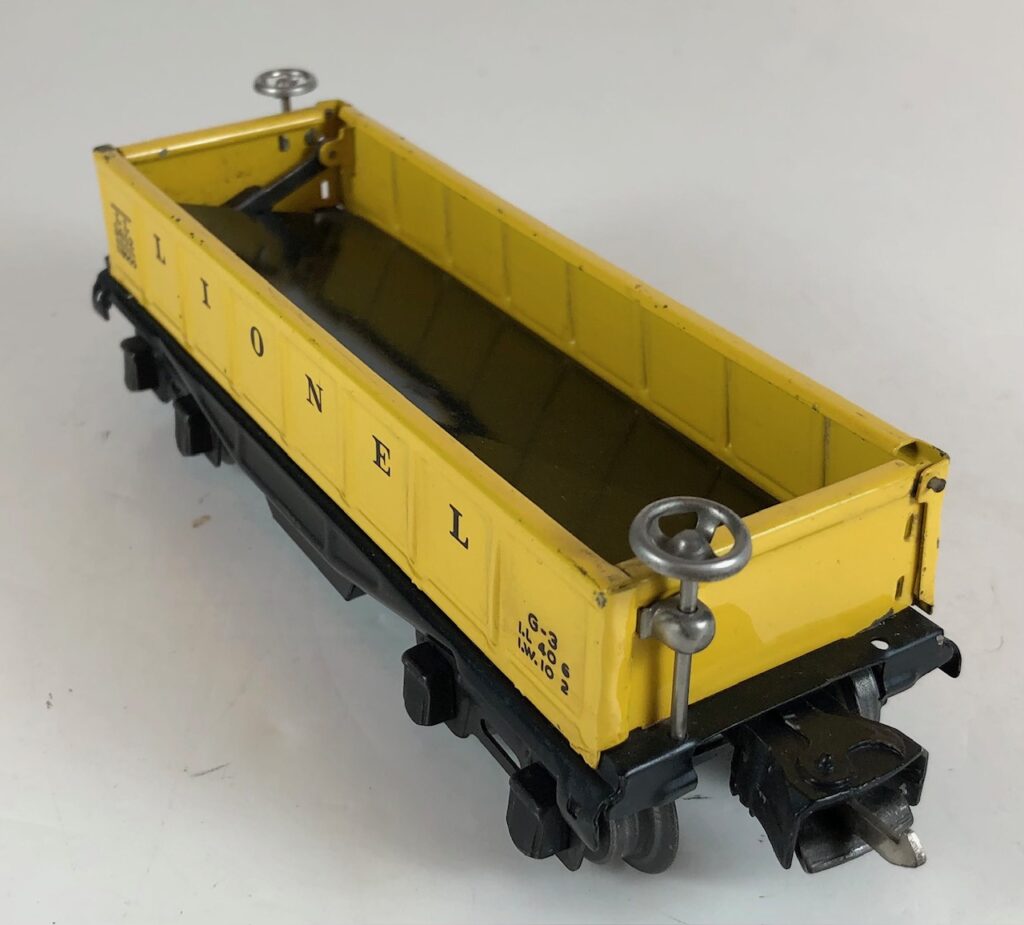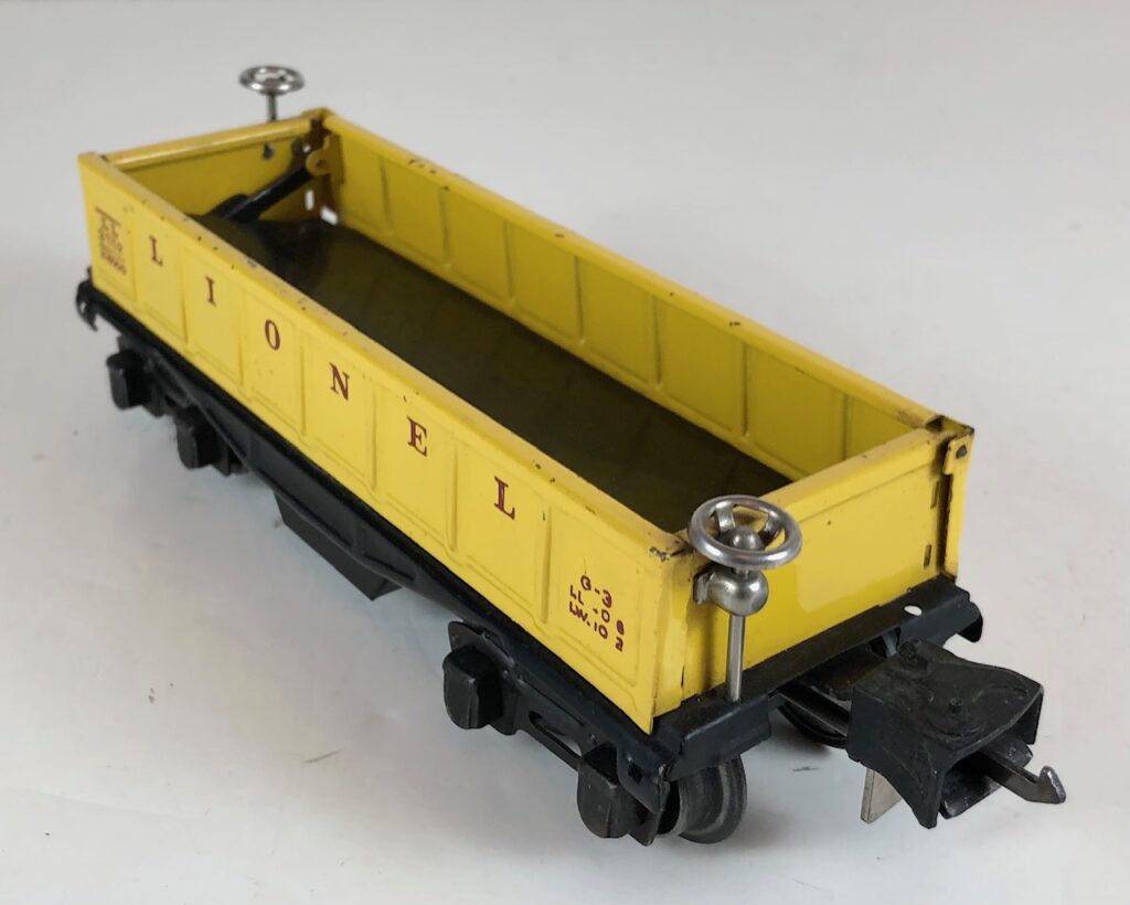 3. No. 3652 Operating Gondola Car in yellow (1940). The cars have red, rubber stamped number and data, nickel trim and black journals. The cars have late style operating box couplers.