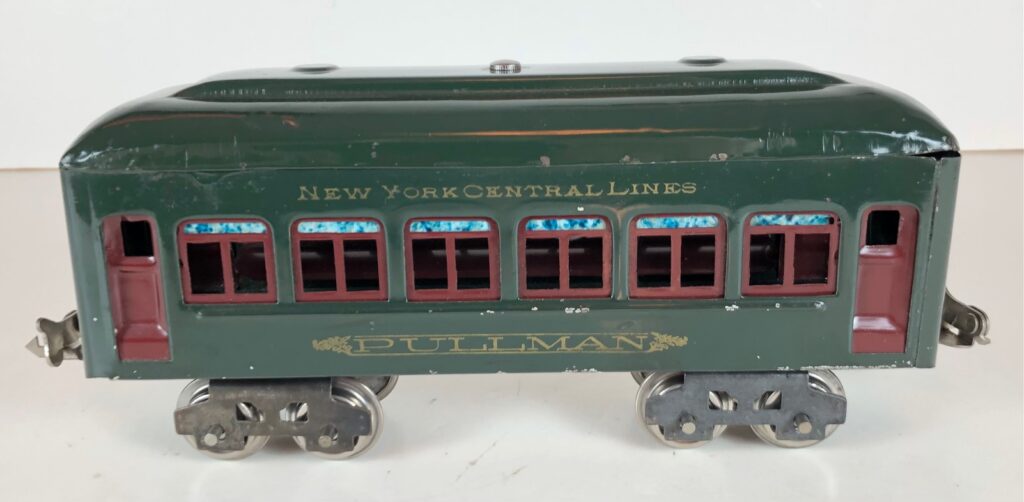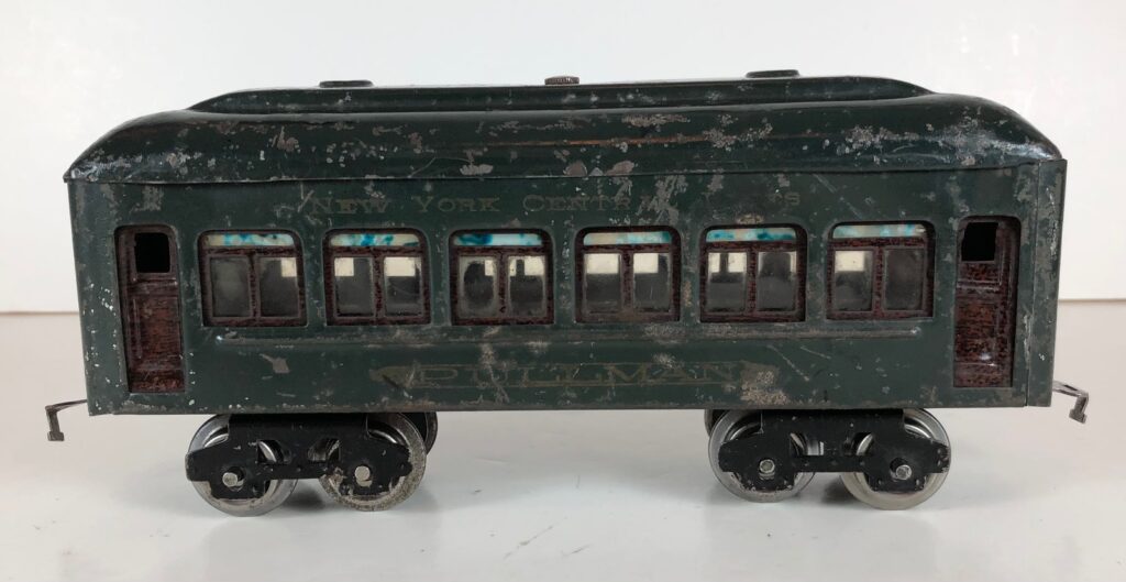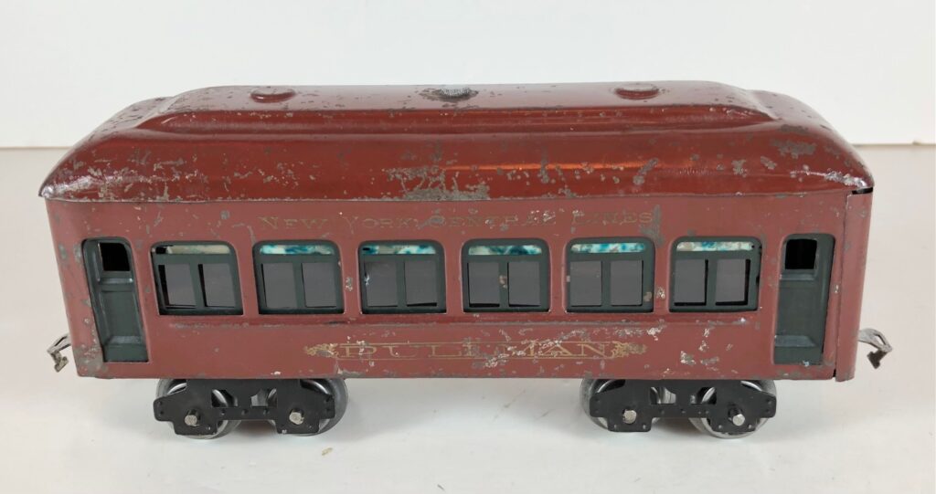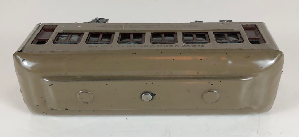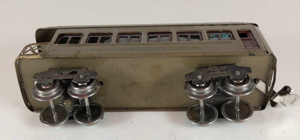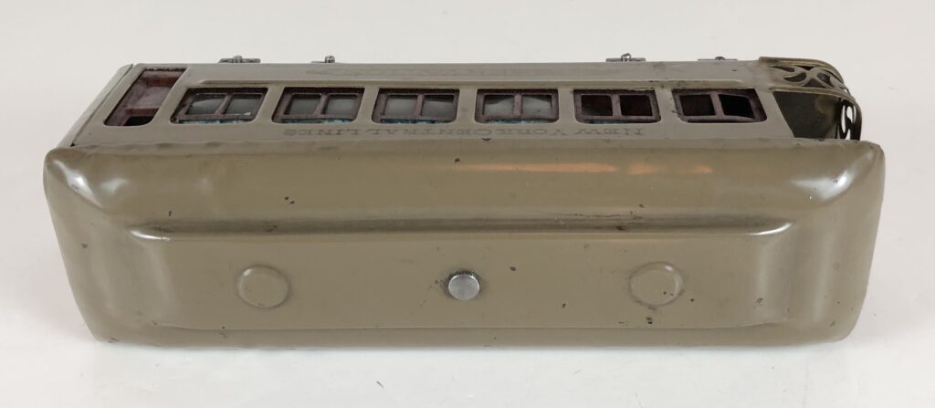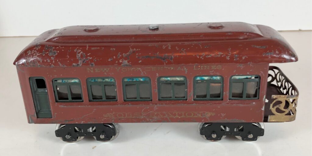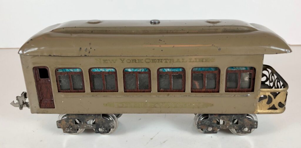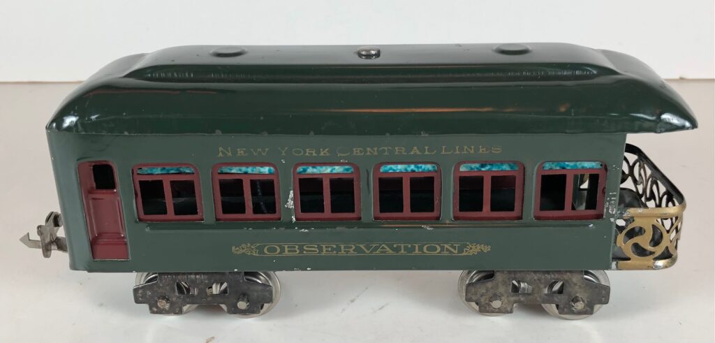 The Nos. 610 and 612 Passenger Cars measure 8 1/4-inches in length. The cars all have “New York Central Lines” rubber stamped above the windows. All of the cars have clear celluloid window inserts with colored celluloid strips in the upper portion of the windows. The earliest cars have red colored celluloid strips, but most have blue. The cars do not have journals. The observation platform of the No. 612 Observation was painted gold.