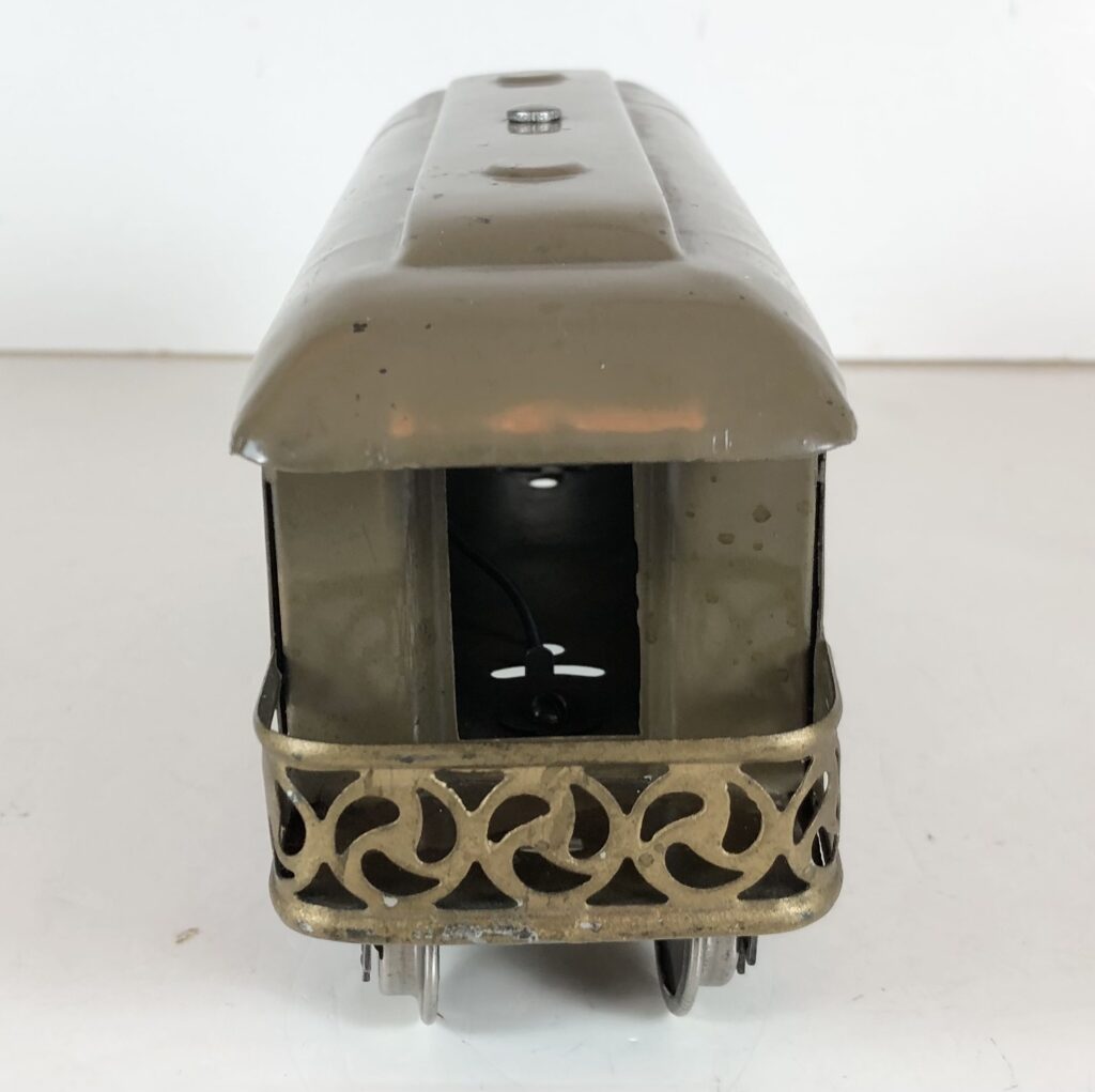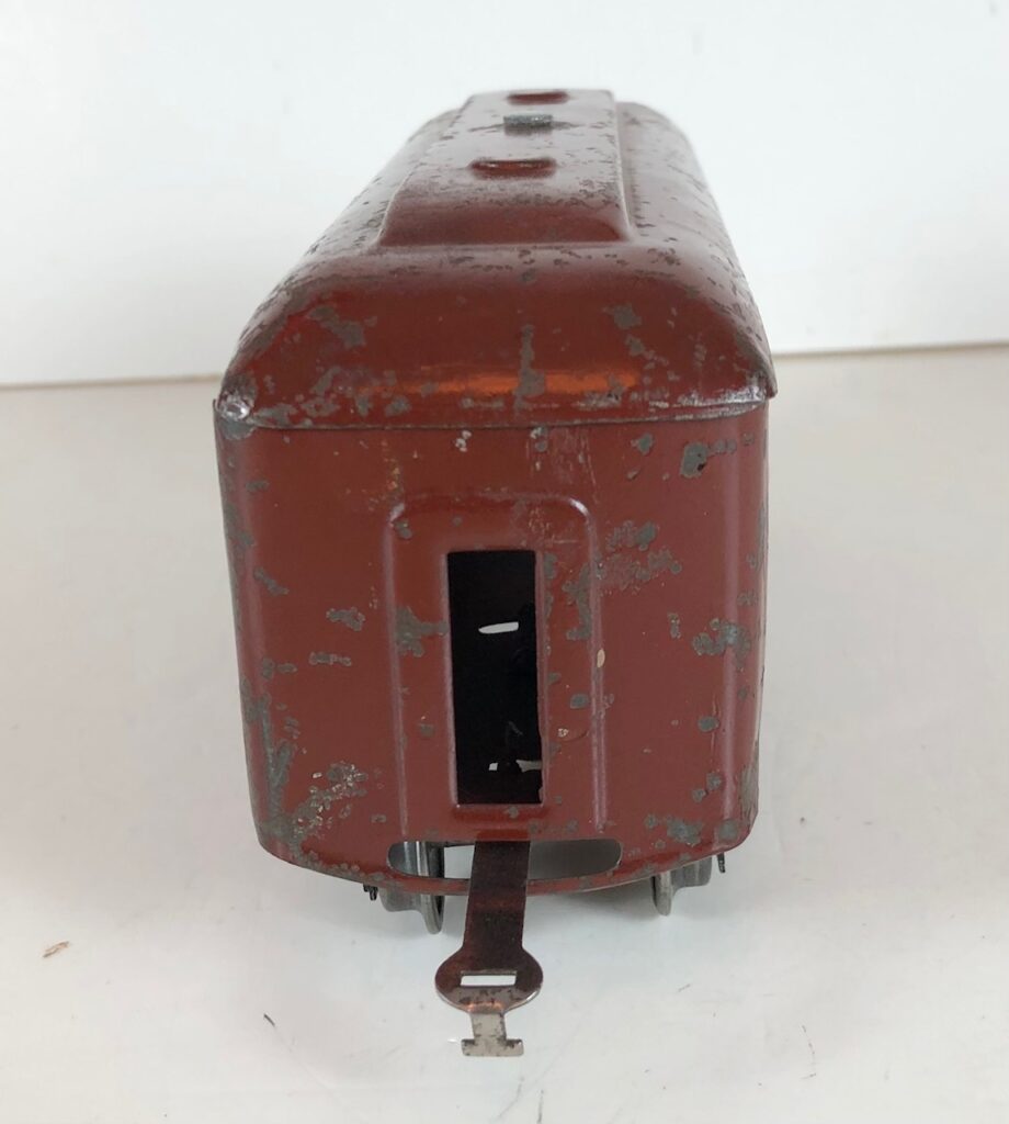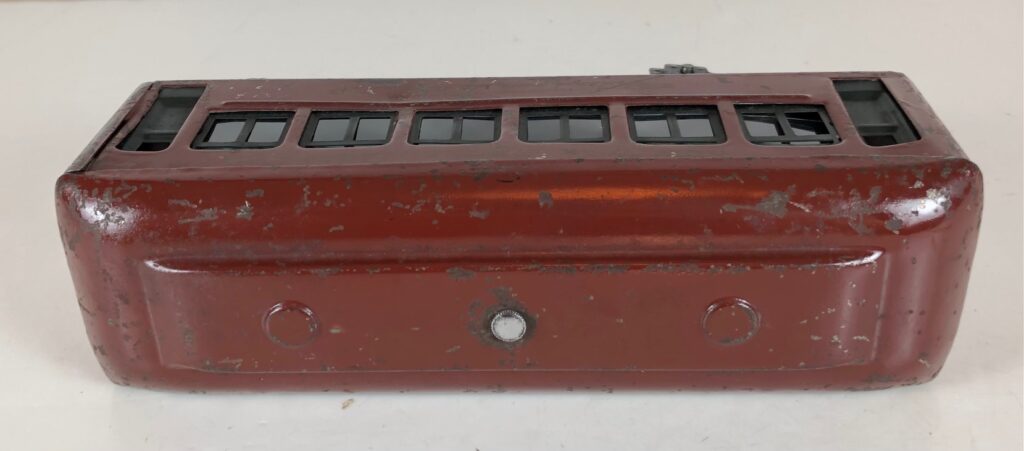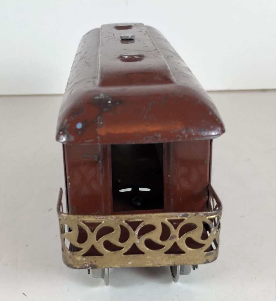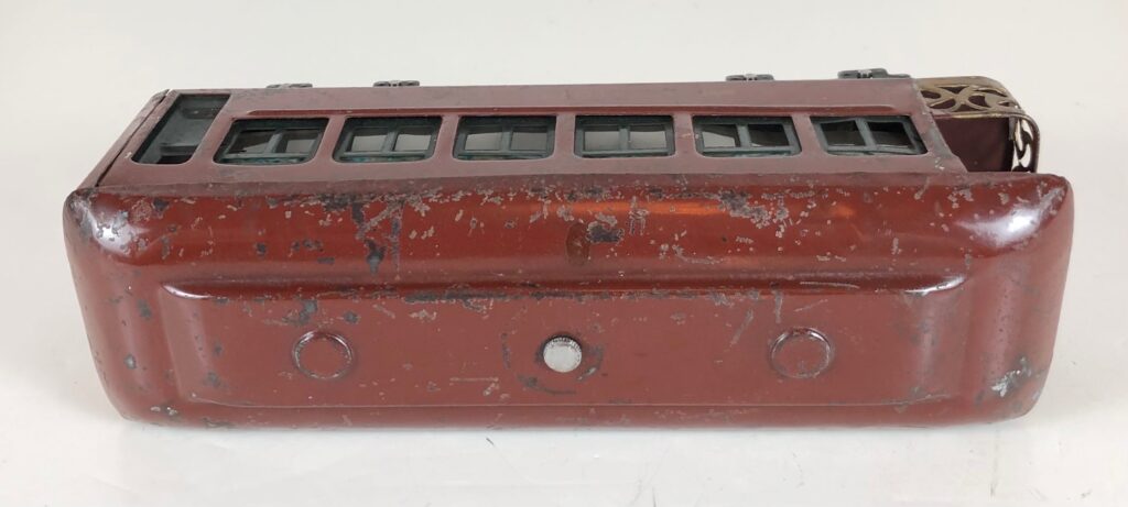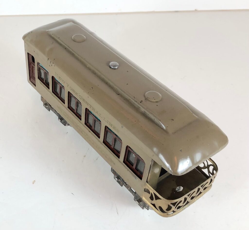 The Nos. 610 and 612 Passenger Cars measure 8 1/4-inches in length. The cars all have “New York Central Lines” rubber stamped above the windows. All of the cars have clear celluloid window inserts with colored celluloid strips in the upper portion of the windows. The earliest cars have red colored celluloid strips, but most have blue. The cars do not have journals. The observation platform of the No. 612 Observation was painted gold.