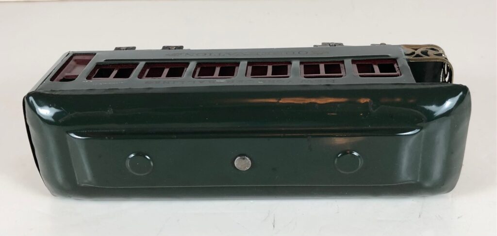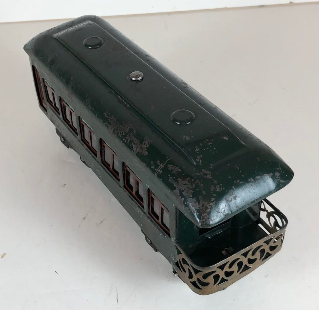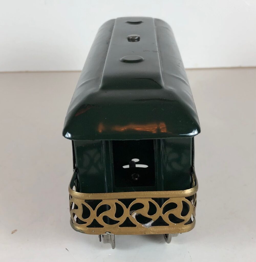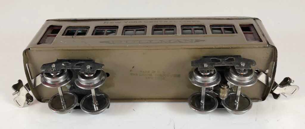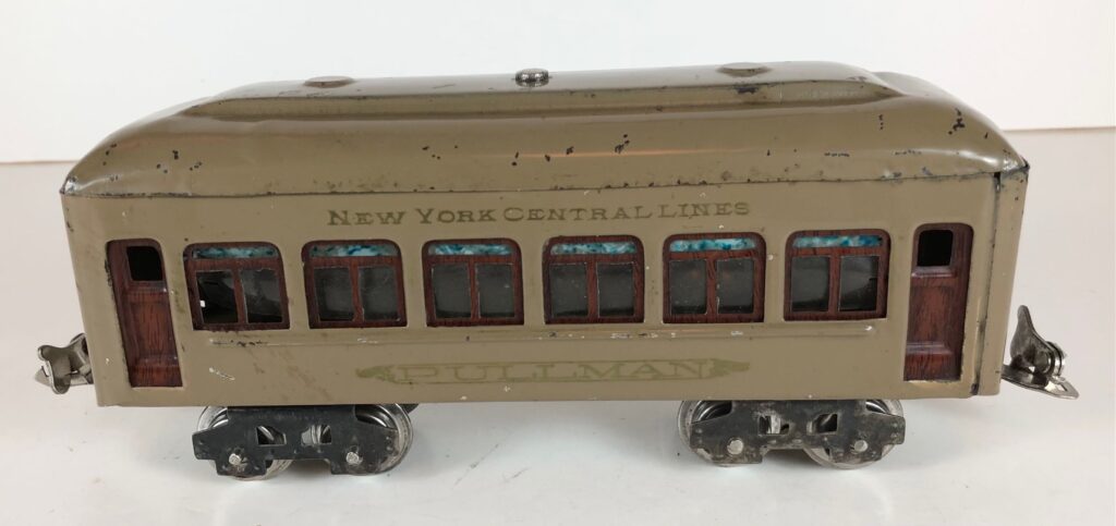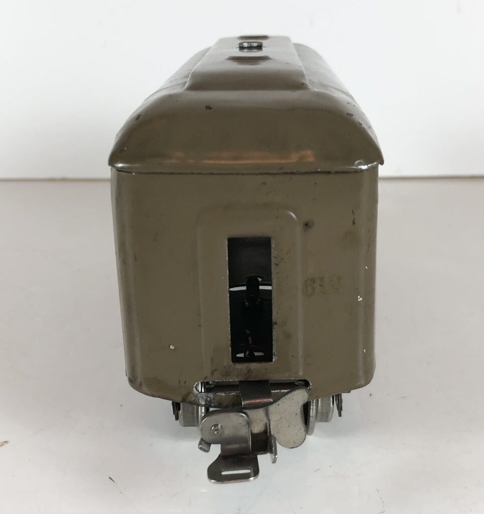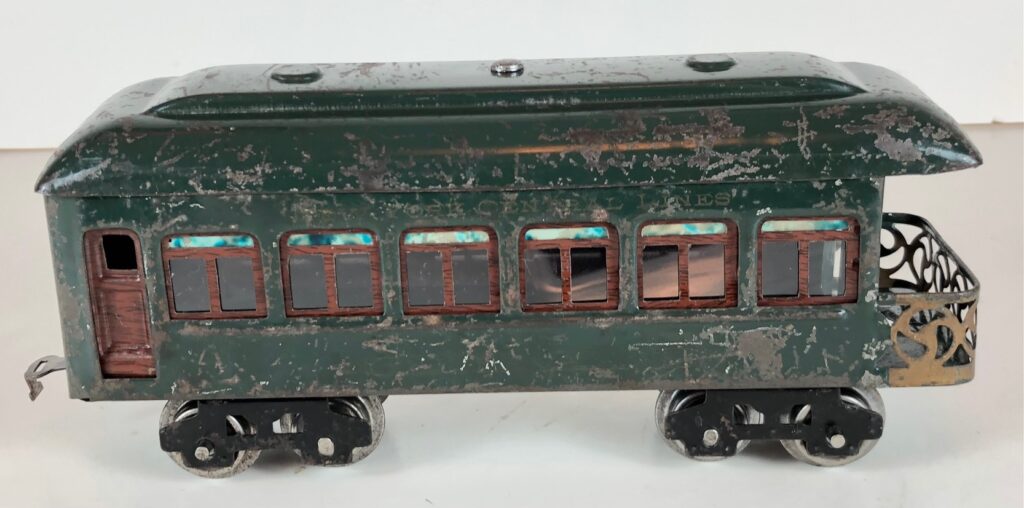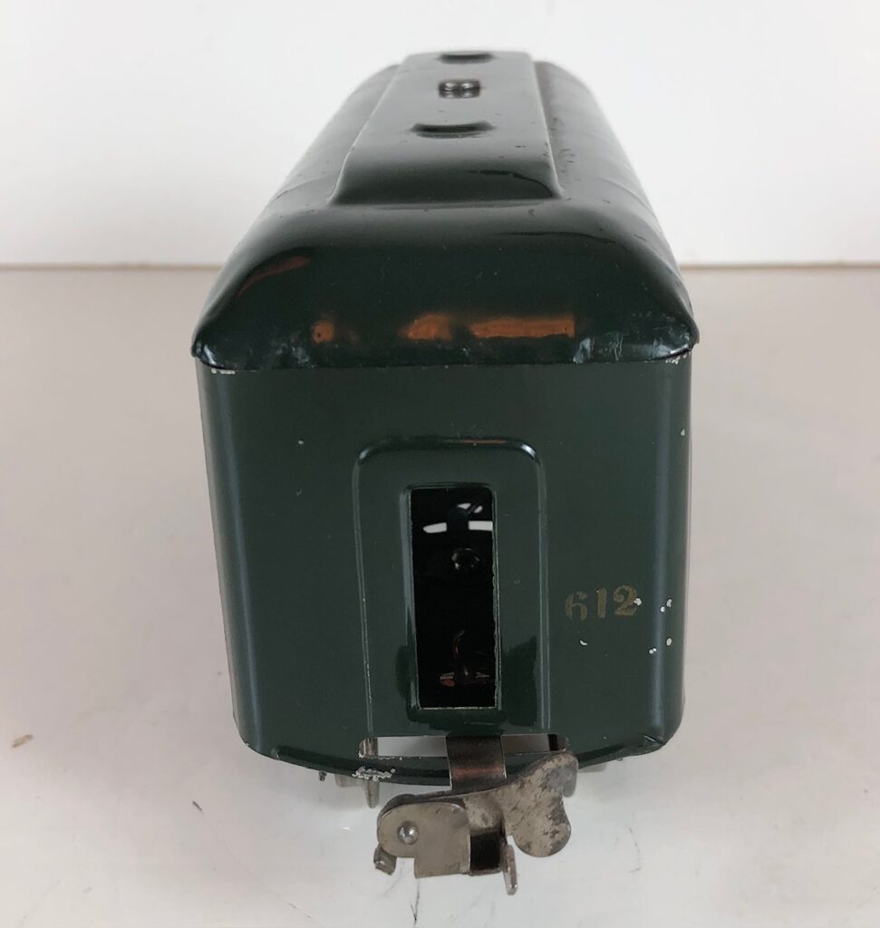 1. No. 610, 612 Passenger Cars in dark green (1915-1918). The cars have the number and “Lionel Lines / N.Y. / Made in U.S.A.” rubber stamped in gold on either side of the door on one end of the car. Some of the later cars also have “Made in U.S.A. / The Lionel Corporation / New York” rubber stamped on the underside. The cars have wood-grained window frames and doors. The cars are not illuminated and have hook and slot couplers.