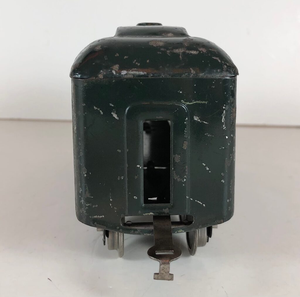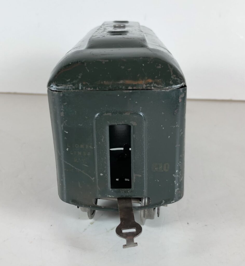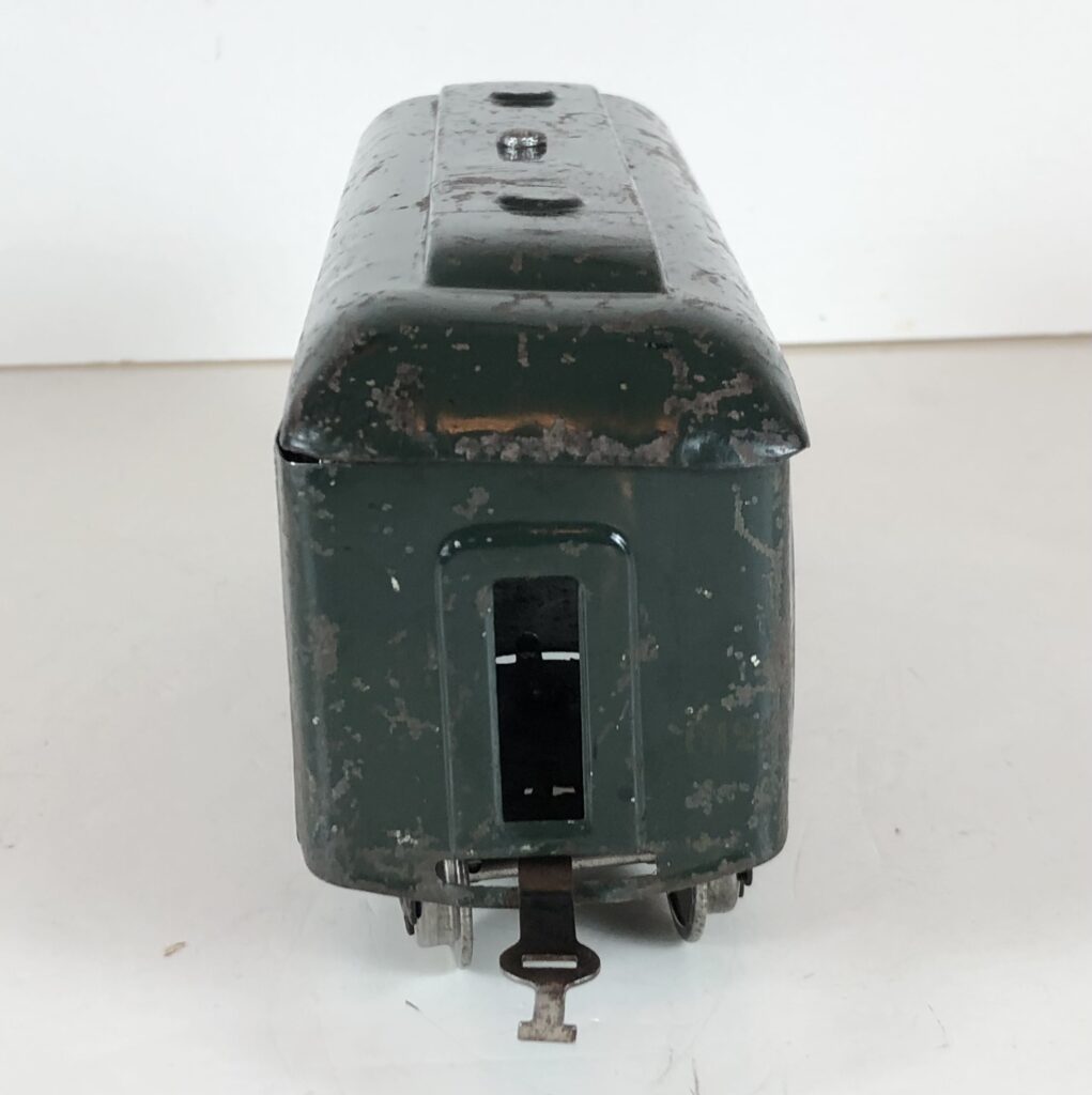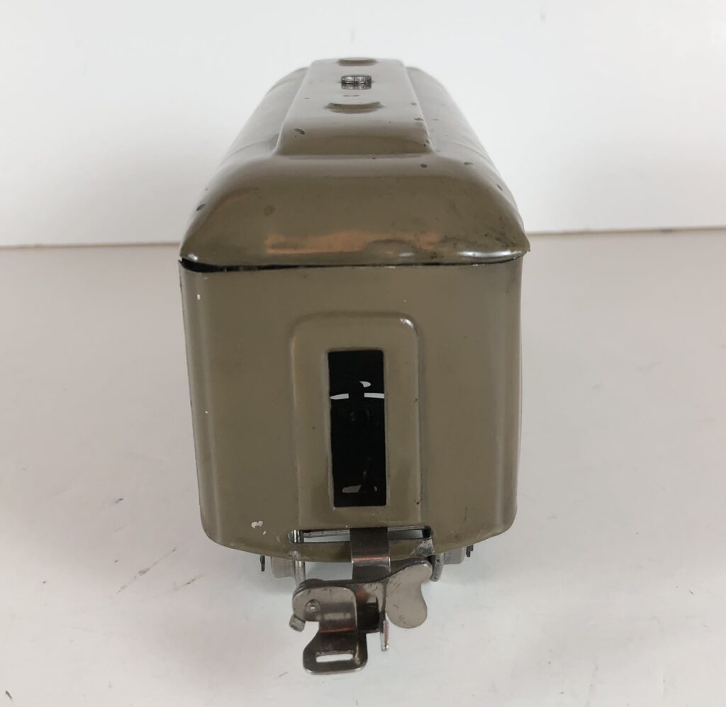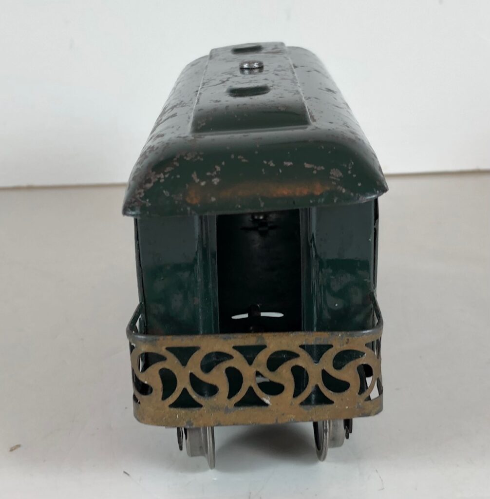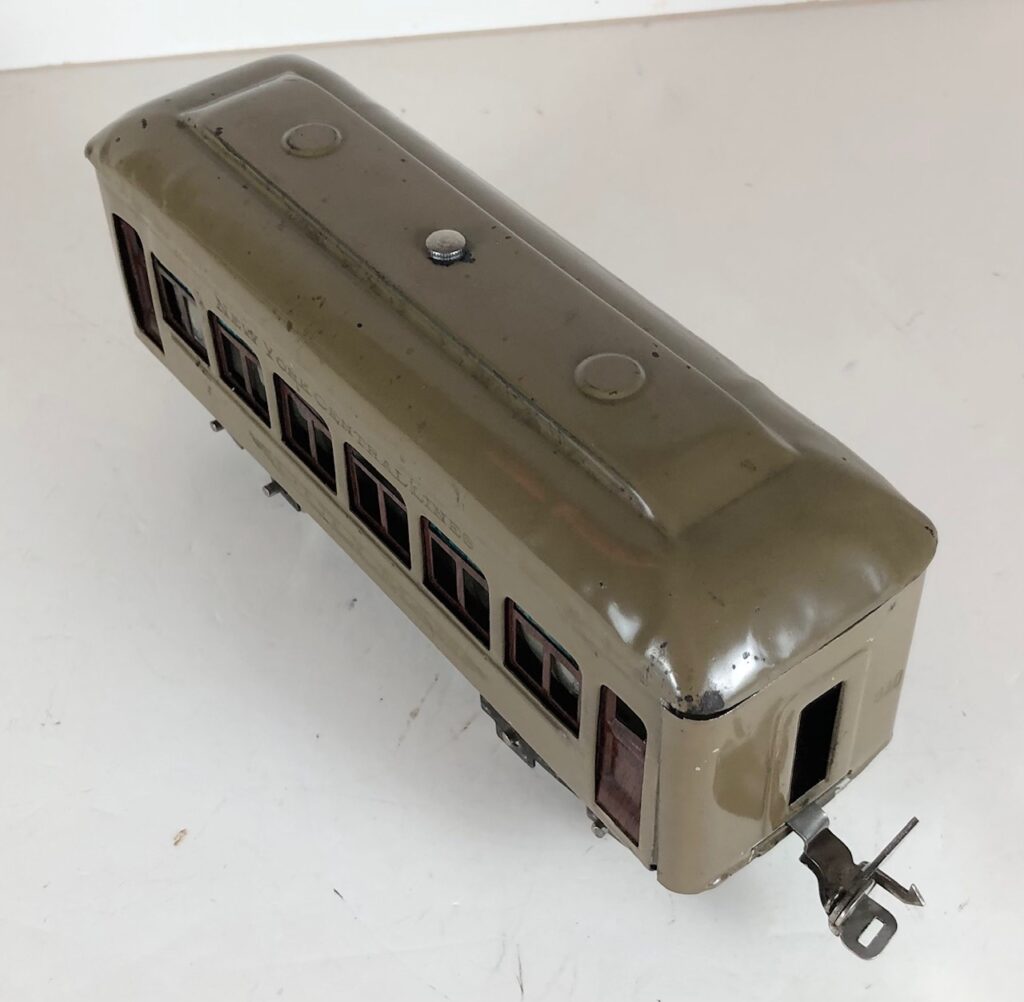 1. No. 610, 612 Passenger Cars in dark green (1915-1918). The cars have the number and “Lionel Lines / N.Y. / Made in U.S.A.” rubber stamped in gold on either side of the door on one end of the car. Some of the later cars also have “Made in U.S.A. / The Lionel Corporation / New York” rubber stamped on the underside. The cars have wood-grained window frames and doors. The cars are not illuminated and have hook and slot couplers.