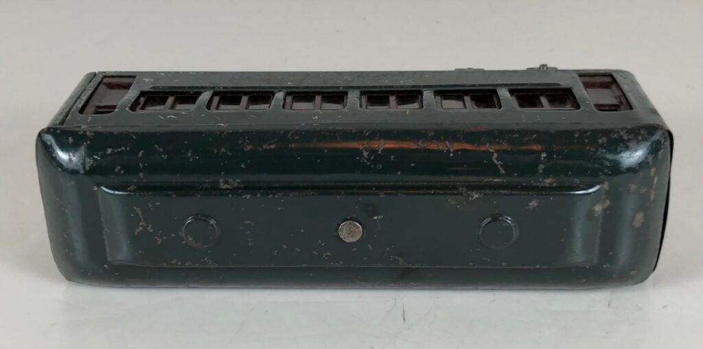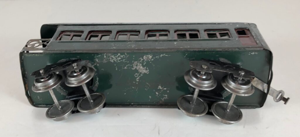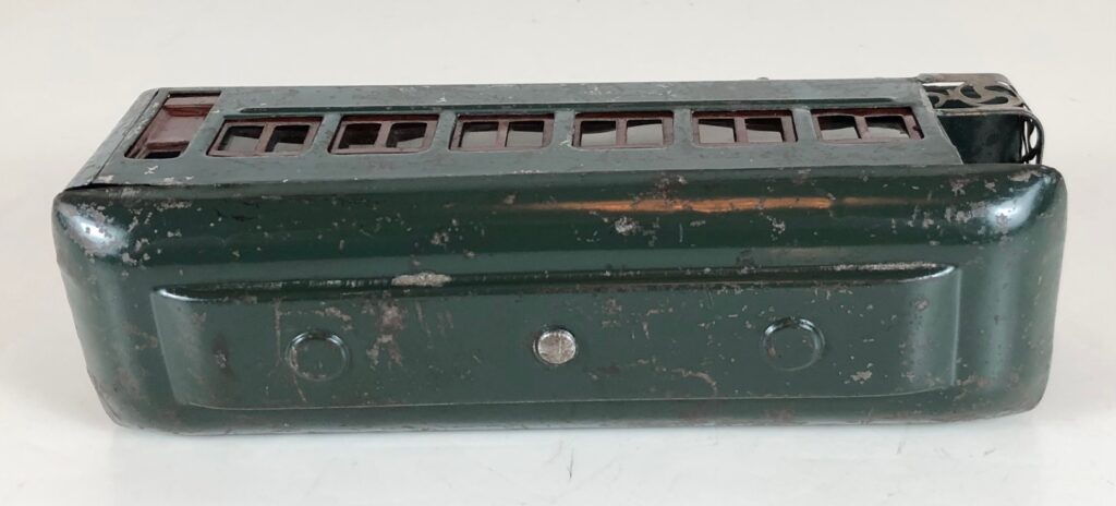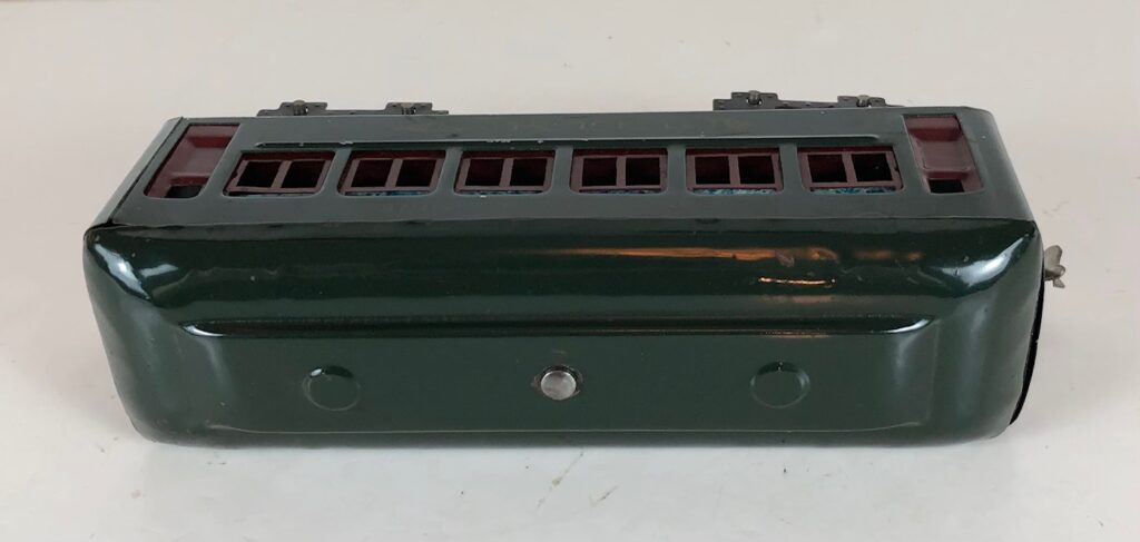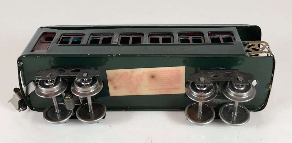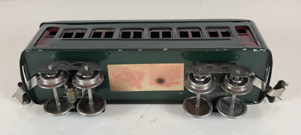 2. No. 610, 612 Passenger Cars in dark green (1918-1922). The cars have the number rubber stamped in gold on one end of the car and “Made in U.S.A. / The Lionel Corporation / New York” rubber stamped on the underside. The cars have maroon painted window frames and doors. The cars are not illuminated and have hook and slot couplers.