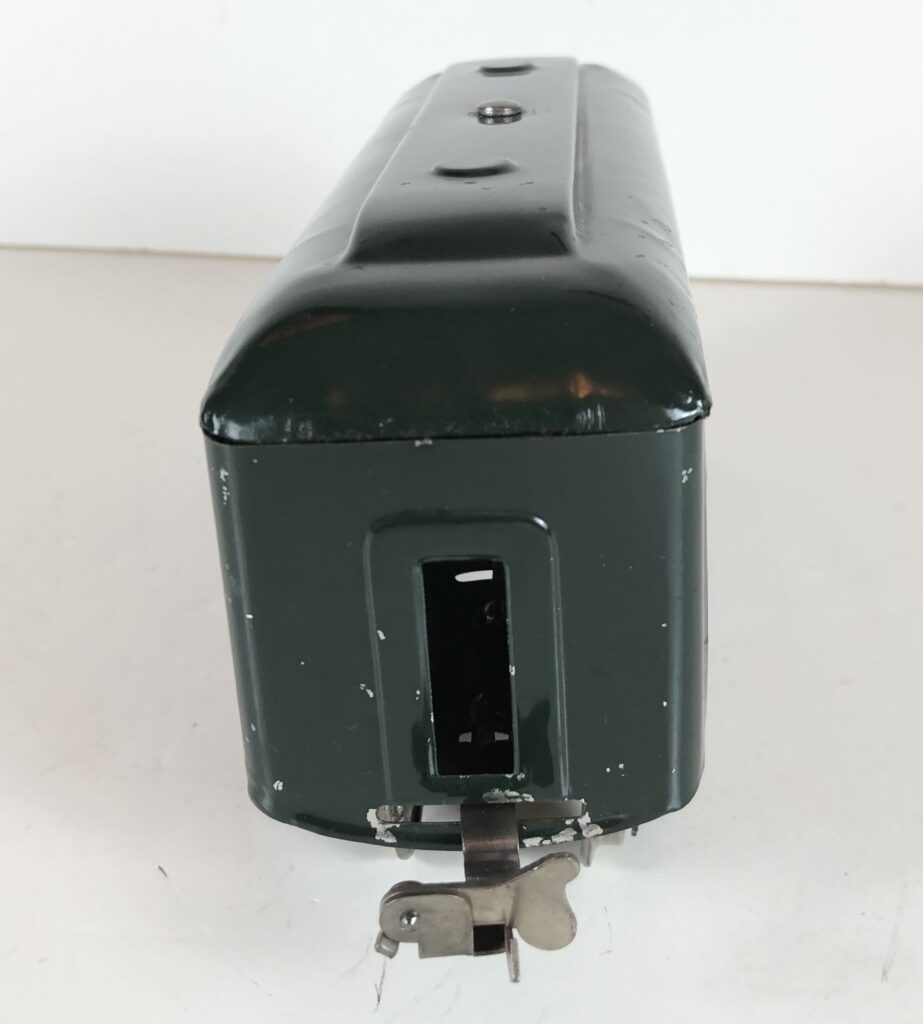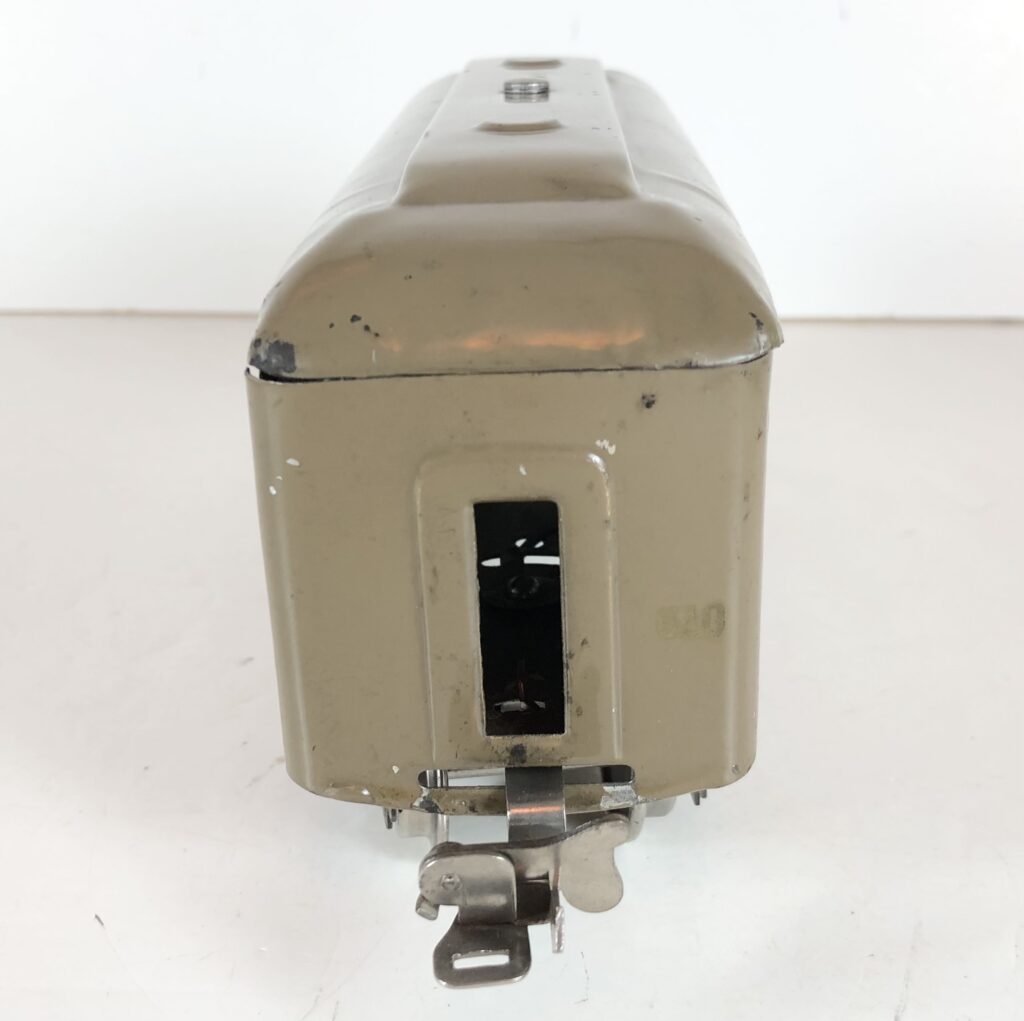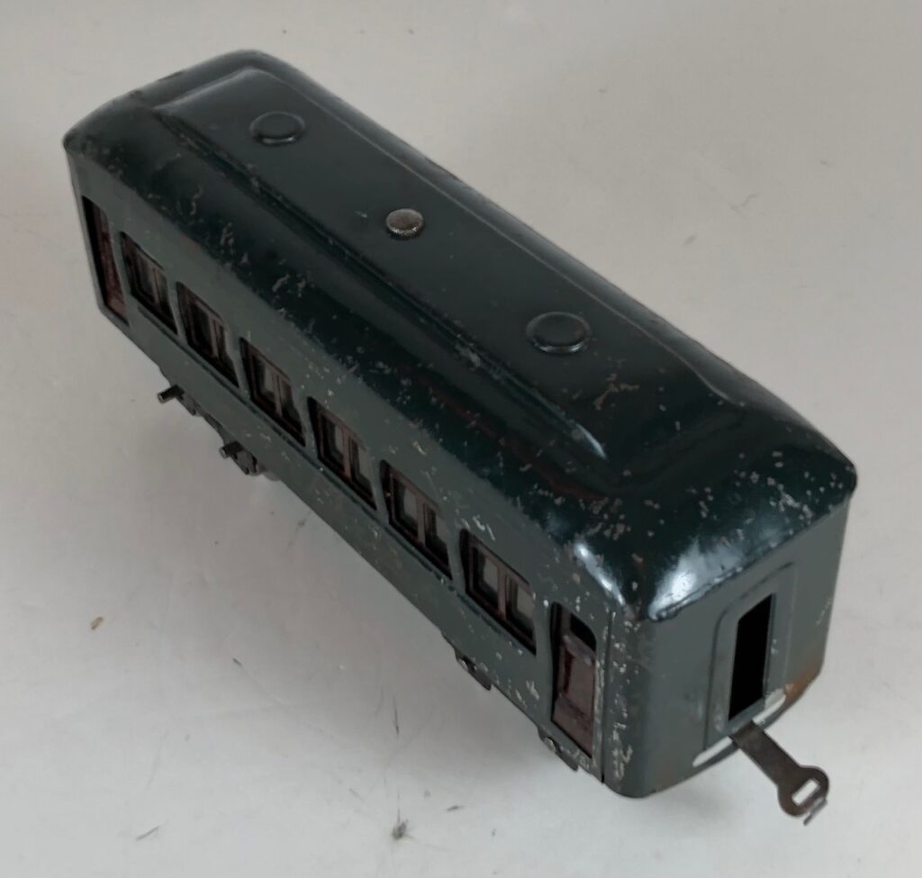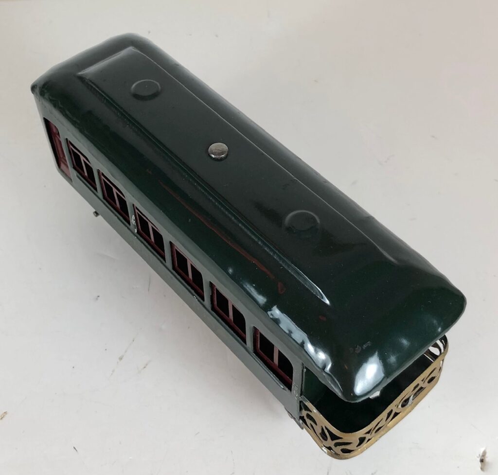 2. No. 610, 612 Passenger Cars in dark green (1918-1922). The cars have the number rubber stamped in gold on one end of the car and “Made in U.S.A. / The Lionel Corporation / New York” rubber stamped on the underside. The cars have maroon painted window frames and doors. The cars are not illuminated and have hook and slot couplers.