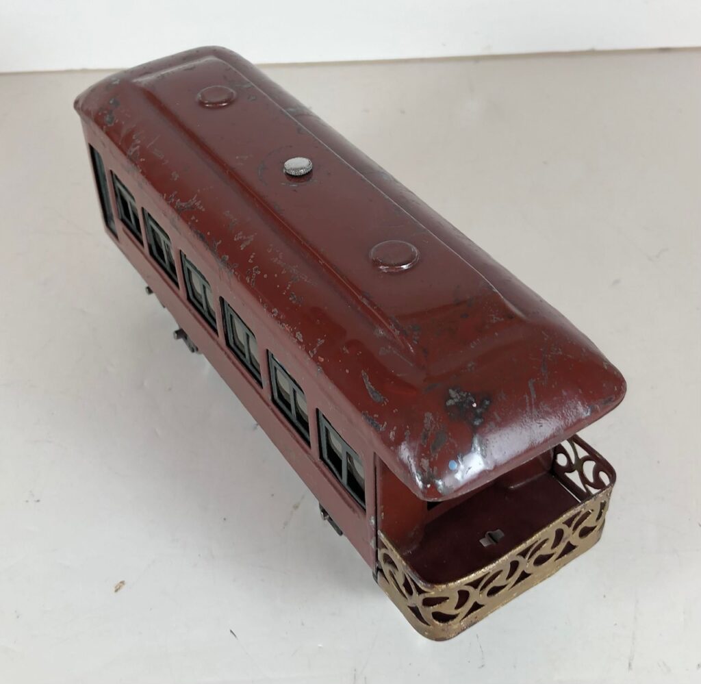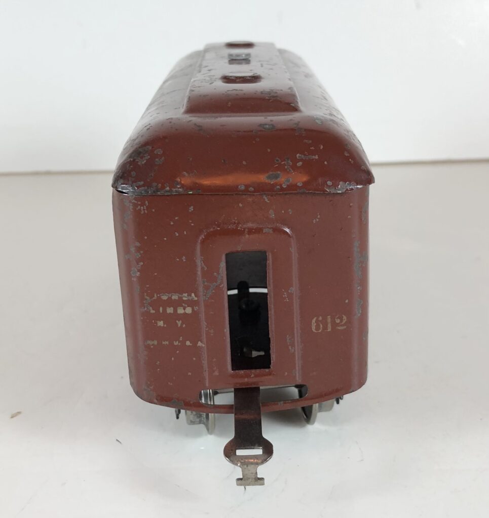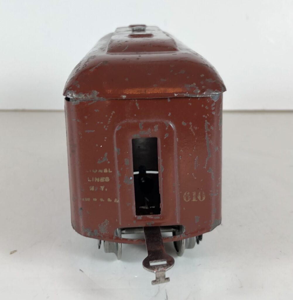 The Lionel No. 610 Pullman and No. 612 Observation Passenger Cars were introduced in 1915 and were issued through 1925. The Nos. 610 and 612 were the largest “O” Gauge passenger cars offered by Lionel until 1924 when the No. 710 and 712 Passenger Cars were introduced. These passenger cars were included as components of many early mid-level to larger passenger sets. The sets typically included two No. 610 Pullman cars and a No. 612 observation, but some sets only included one of each of the cars. Although Lionel produced a prototype baggage car to go with these cars, it was never put in production.