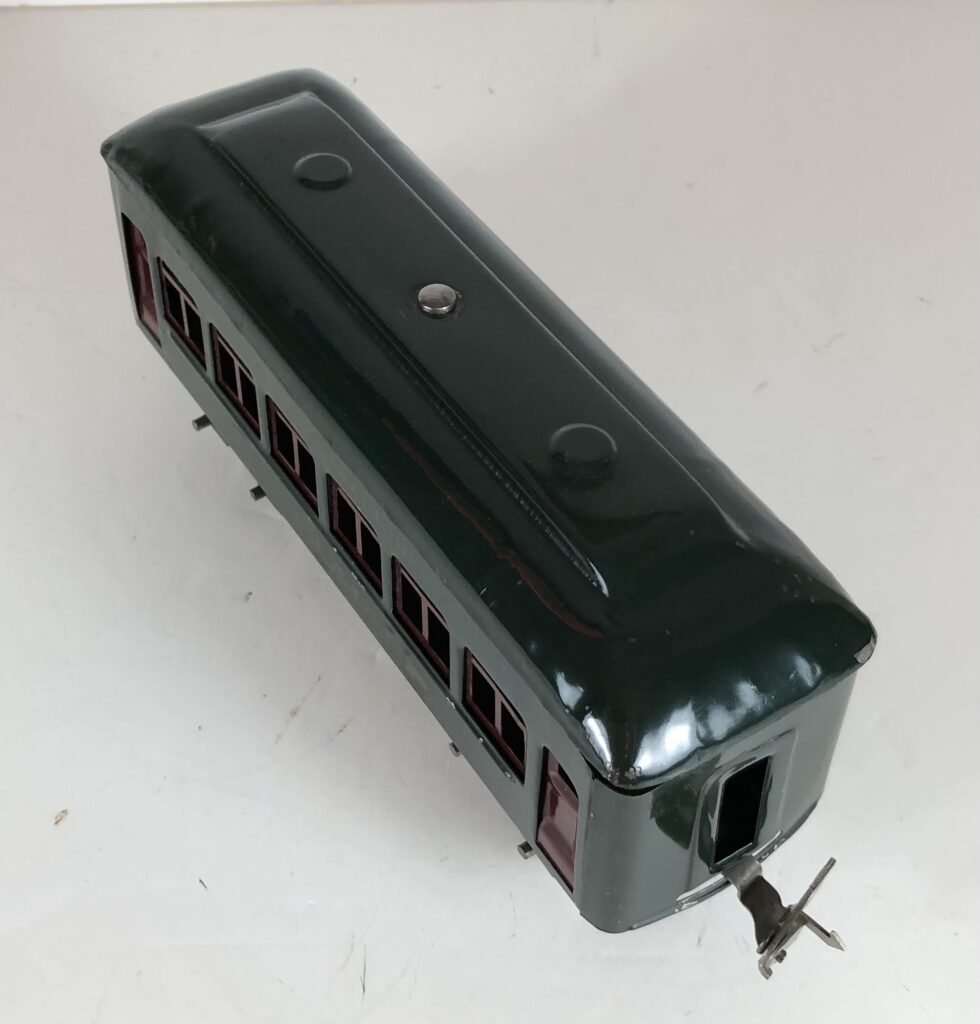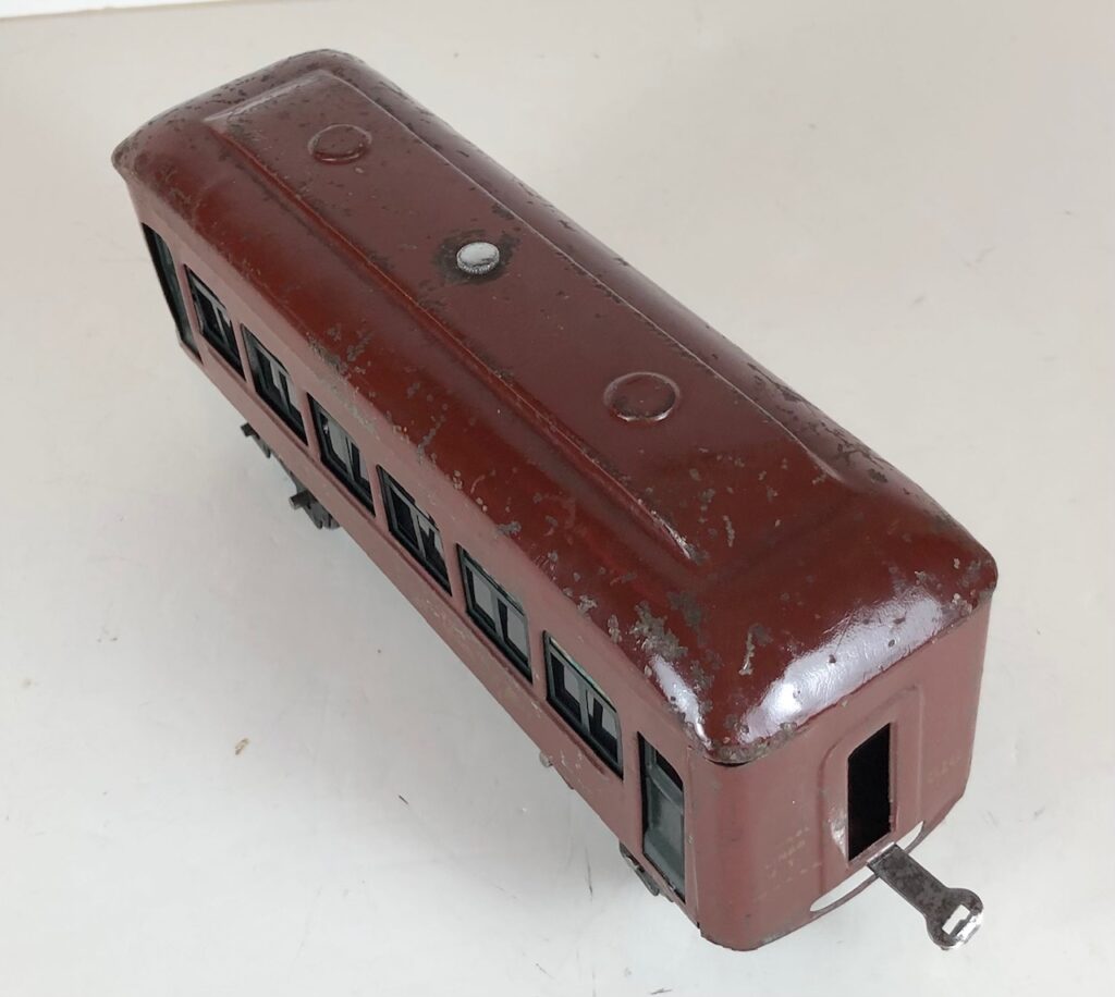 5. No. 610, 612 Passenger Cars in dark green (1925). The cars have the number rubber stamped on one end of the car and a lubrication sticker on the underside. The cars have maroon painted window frames and doors. The cars are illuminated and have combination latch or latch couplers.