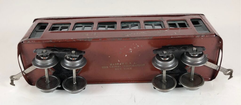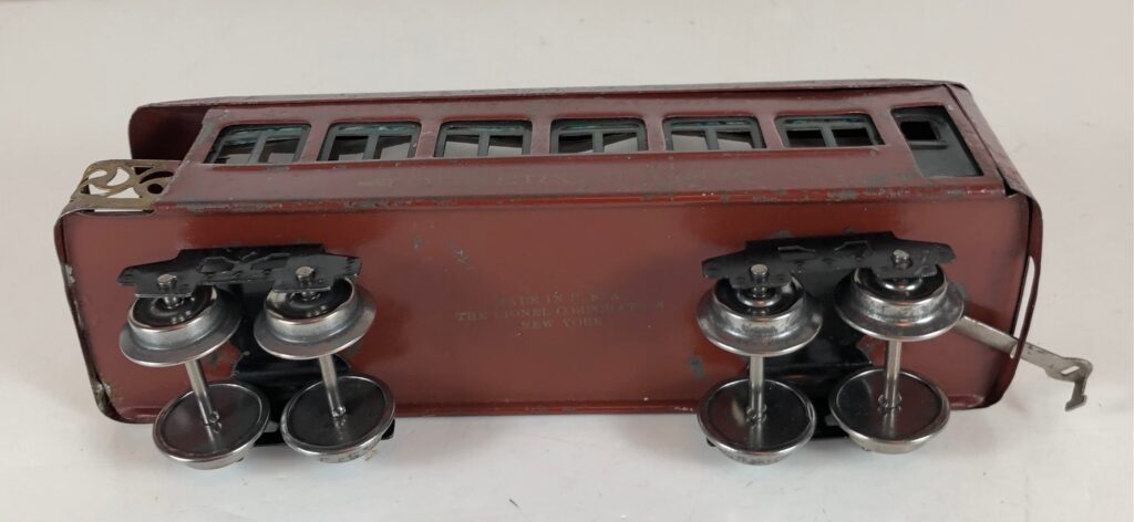 3. No. 610, 612 Passenger Cars in maroon (wine) (1922-1924). The cars have the number and “Lionel Lines / N.Y. / Made in U.S.A.” rubber stamped in gold on either side of the door on one end of the car. The cars also have “Made in U.S.A. / The Lionel Corporation / New York” rubber stamped on the underside. The cars have dark green window frames and doors. The cars are not illuminated and have hook and slot couplers.