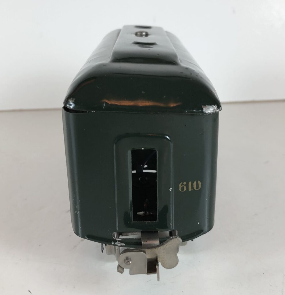 4. No. 610, 612 Passenger Cars in dark green (1924). The cars have the number rubber stamped on one end of the car and “Made in U.S.A. / The Lionel Corporation / New York” rubber stamped on the underside. The cars have maroon painted window frames and doors. The cars are illuminated and have hook and slot couplers.