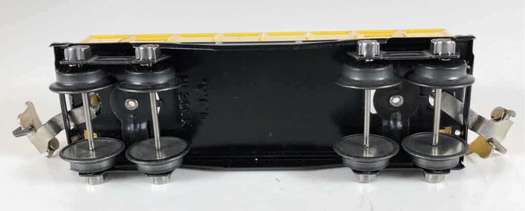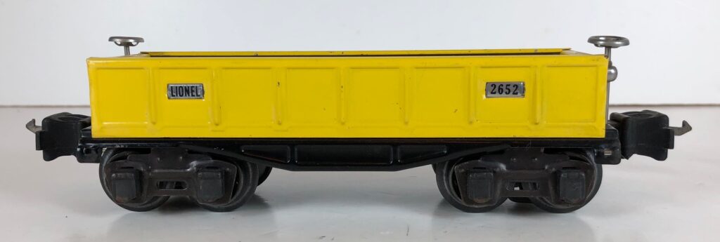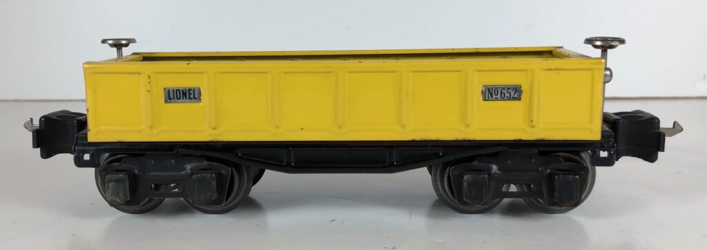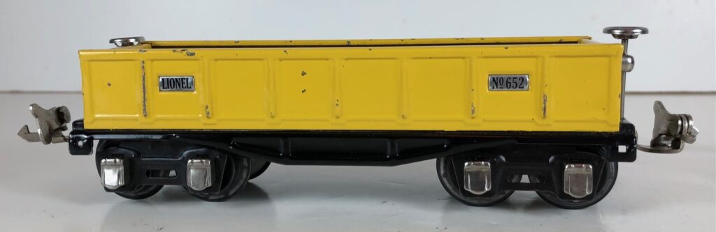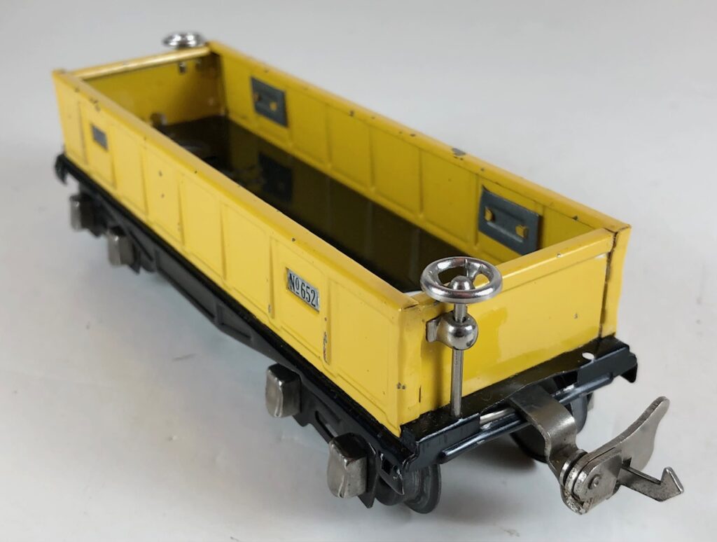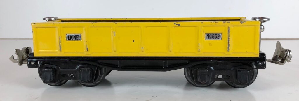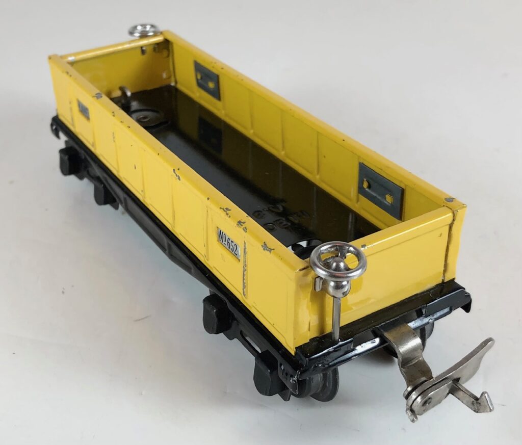 1. No. 652 Gondola Car in yellow (1935-1938). The cars have aluminum plates, nickel trim and nickel journals. The cars have latch couplers.