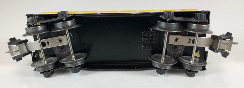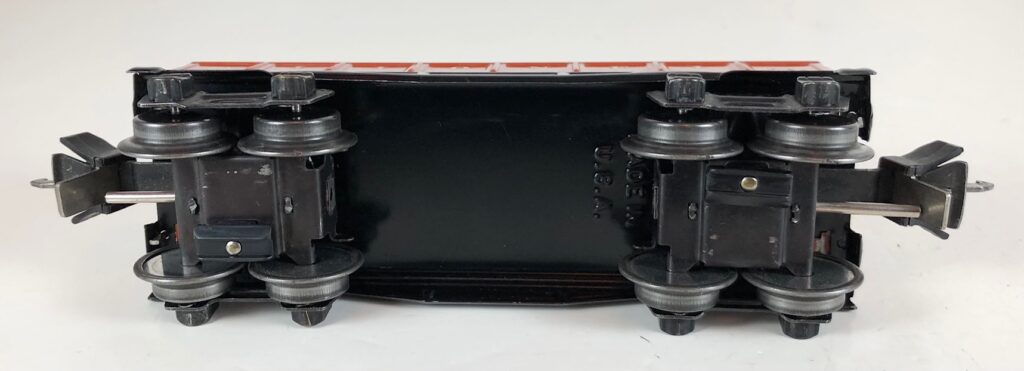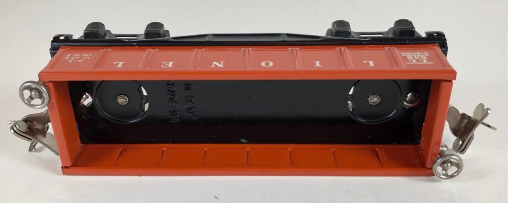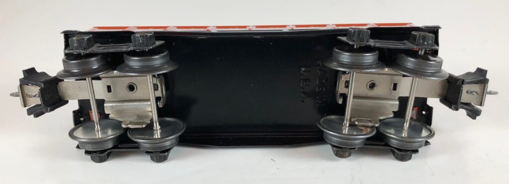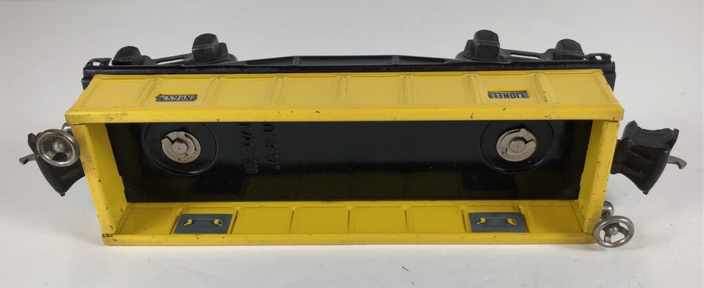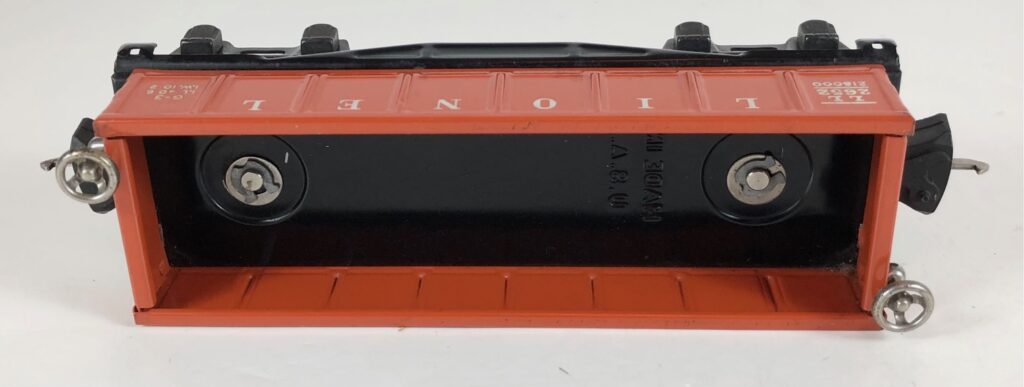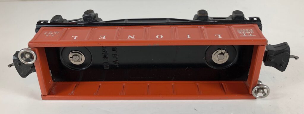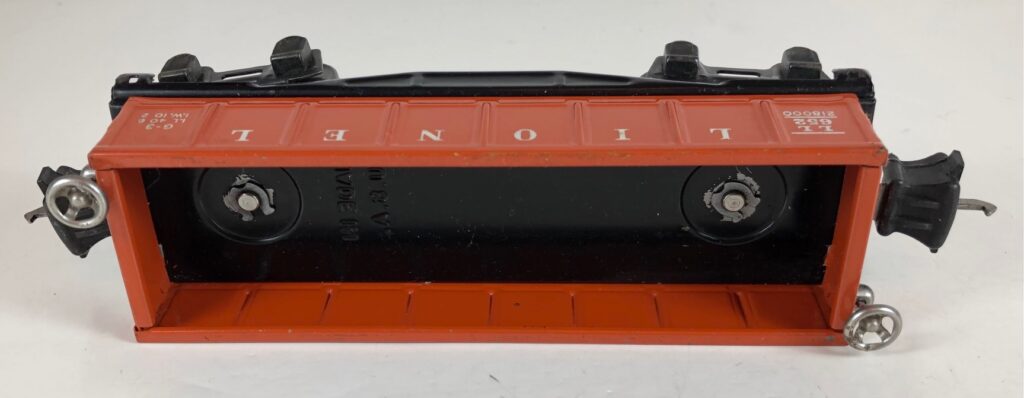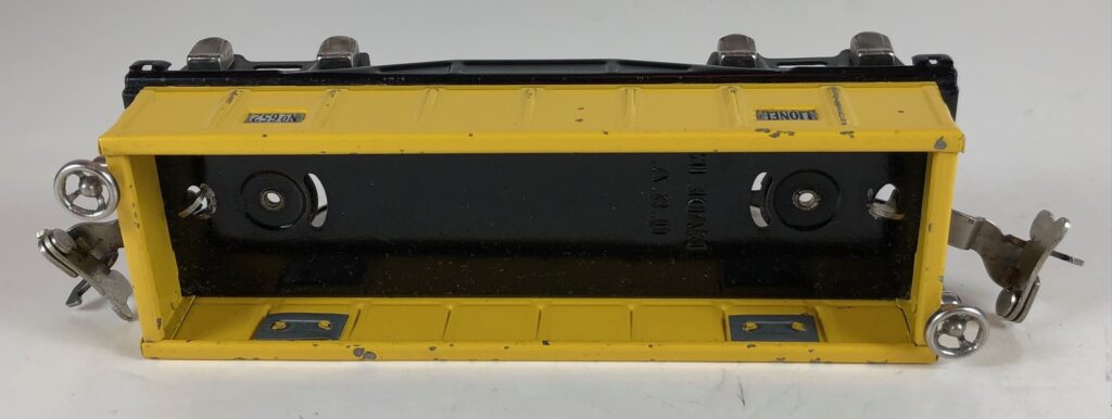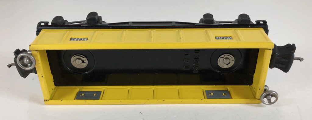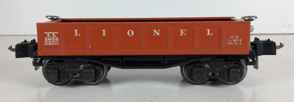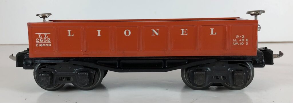 The Lionel No. 2652 Gondola Cars were introduced in 1938 and were issued through 1942. The No. 2652 Gondola Cars always had operating couplers. The No. 2652 Gondola Cars measure 6 1/2-inches in length. The gondola car bodies were always painted a single color and had a black frame. All of the gondolas have nickel trim. The early gondola cars have metal plates to identify the number and “Lionel Lines”. Late gondola cars have rubber stamped lettering.