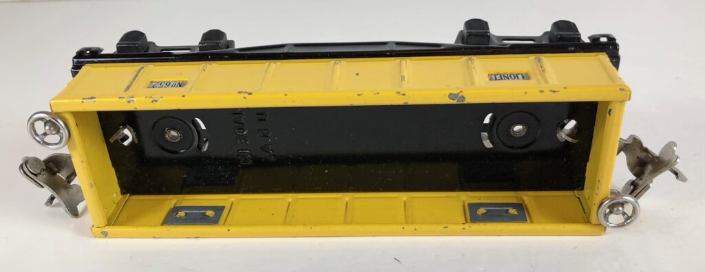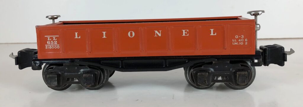 The Lionel No. 652 Gondola Cars were introduced in 1935 and were issued through 1942. The No. 652 Gondola Cars always had manual couplers. The No. 652 Gondola Cars measure 6 1/2-inches in length. The gondola car bodies were always painted a single color and had a black frame. Early gondola cars have metal plates to identify the number and “Lionel Lines”. Late gondola cars have rubber stamped lettering.